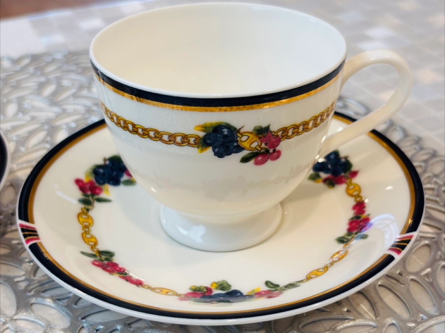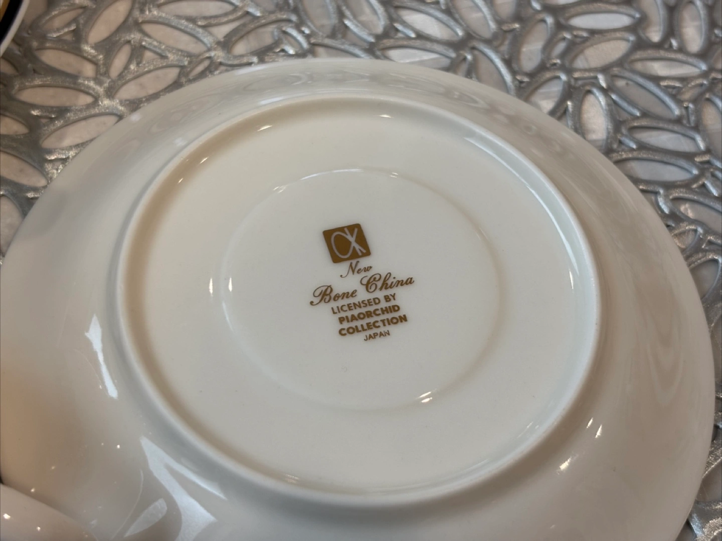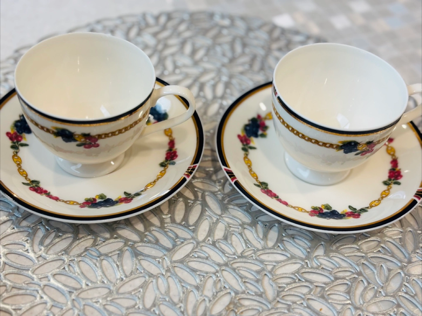 軽くて洗いやすいコーヒーカップ2客セットNo.2 気に入っていましたが、この度入れ替えを考え中のためお安く出品します。 ・ブランド:PIAO RCHID COLLECTION ・New Bone China ・カップ&ソーサ ー2客セット ・白地に花柄とチェーン柄 食洗機に何度か入れましたが、特に剥がれる事なく比較的丈夫でした 2セットありますので、①か②にご連絡頂ければと思います(^^)
