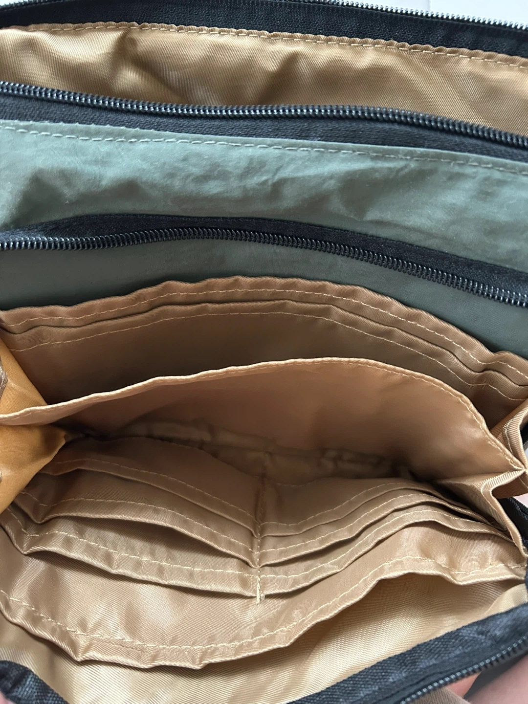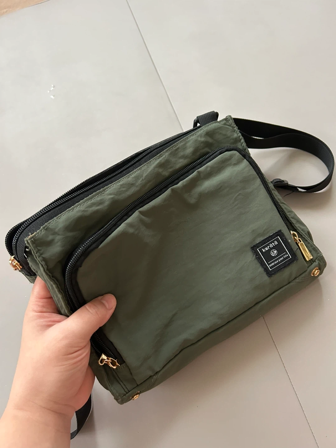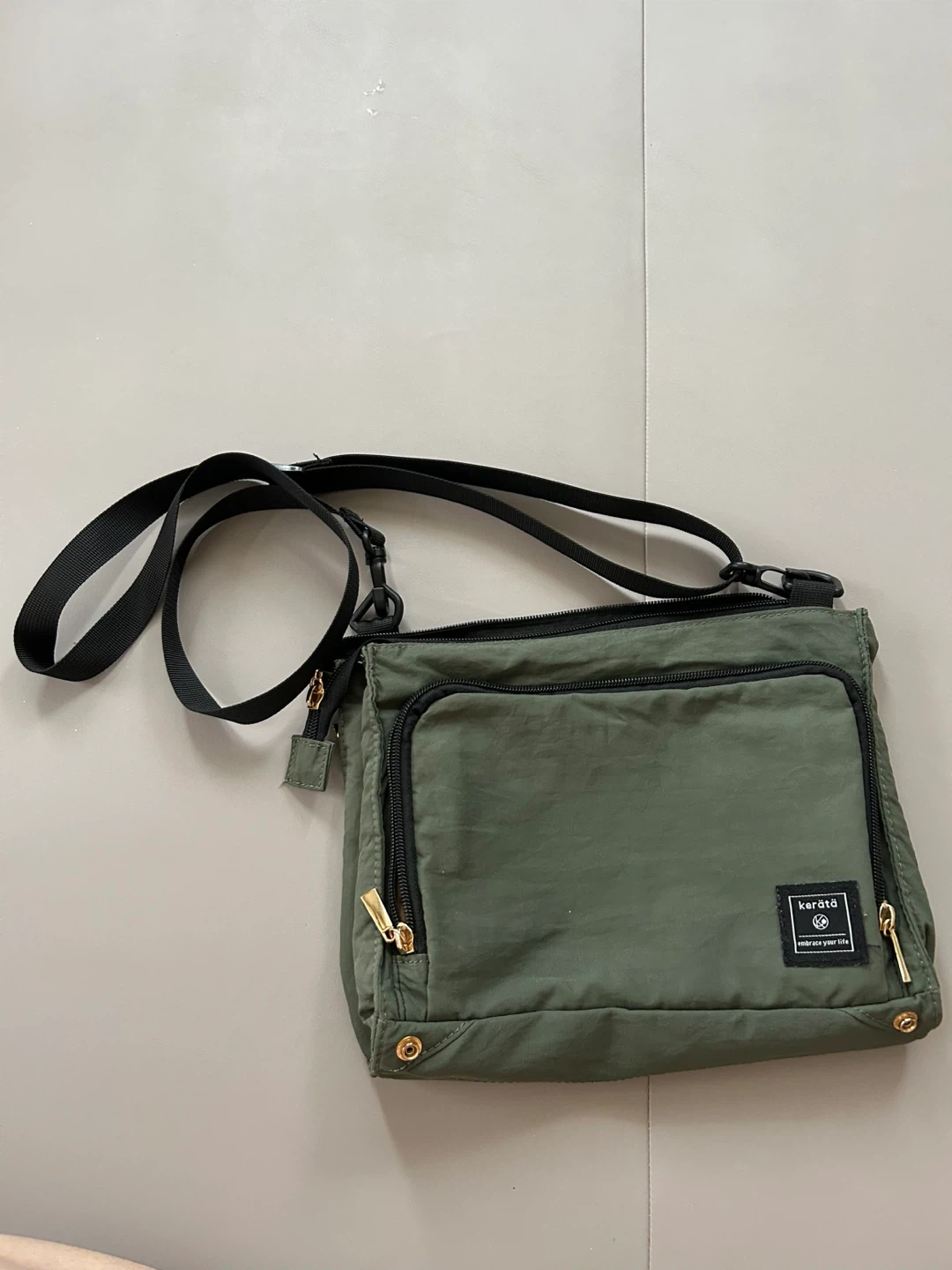 カラタのショルダーバッグです。 妊婦のときはこれに全て入れて過ごしてました。 写真はマチ全開の状態です。 ・カラー:カーキ ・ショルダー紐:ブラック ・内側にポケット複数あり ・使用感あり 中古品であることご了承ください。