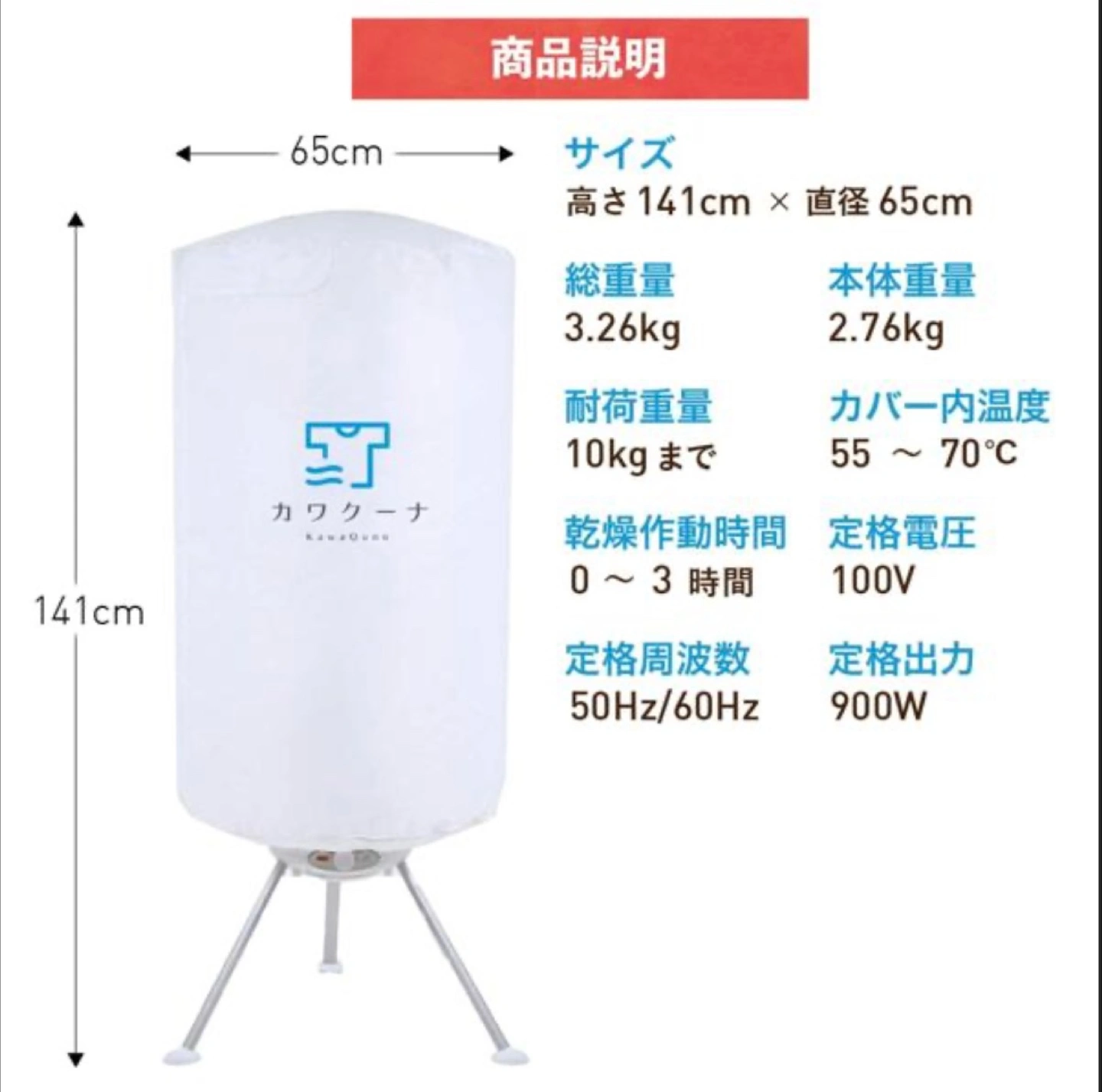 最終値下げ! これからの梅雨の時期どうですか? 全く問題なく動いてます。 引っ越しで使わなくなってしまったので 出品します。 【サイズ】 高さ:141cm 直径:65cm 【重量】 総重量:3.26kg 本体重量:2.76kg 【その他】 耐荷重量:10kgまで カバー内温度:55~70℃ 定格電圧:100V 定格周波数:50Hz/60Hz 定格出力:900W