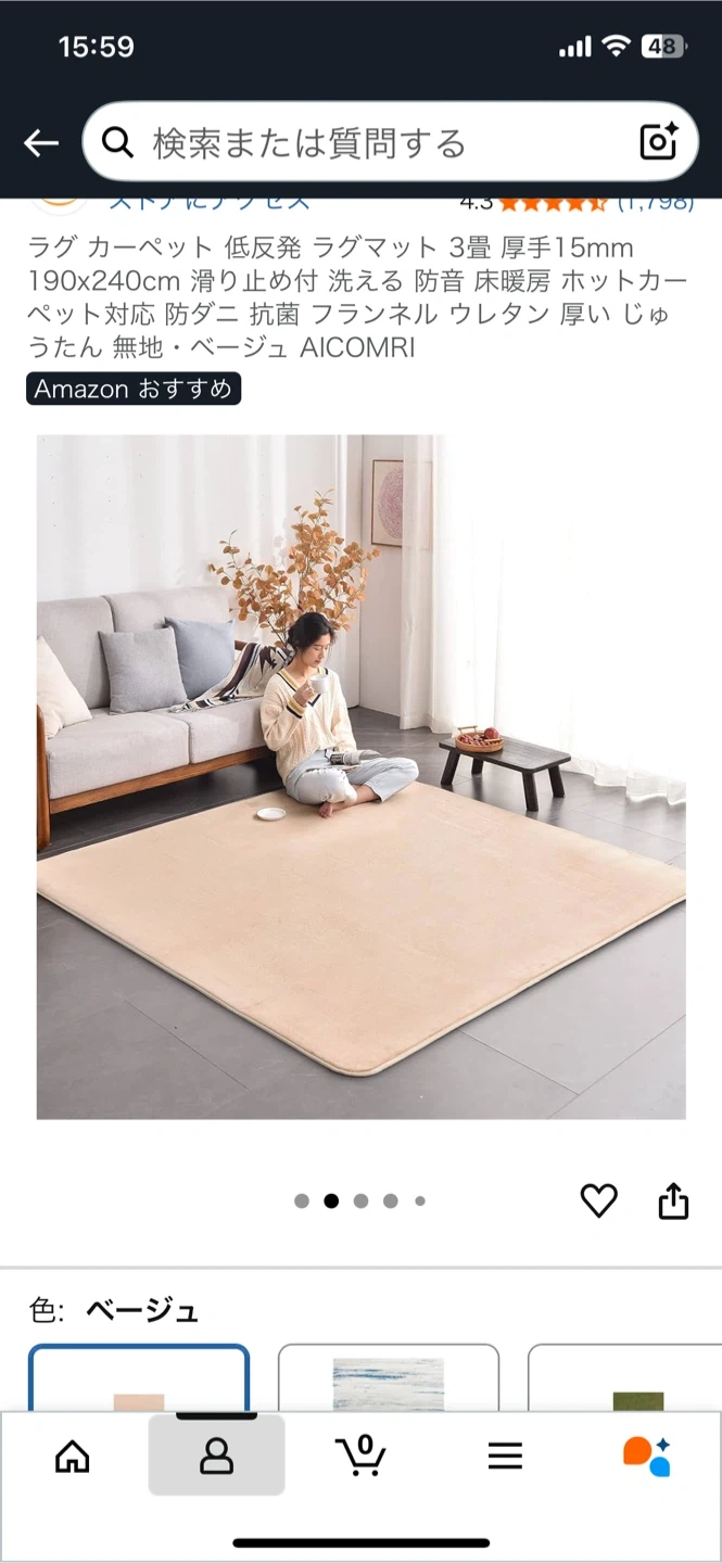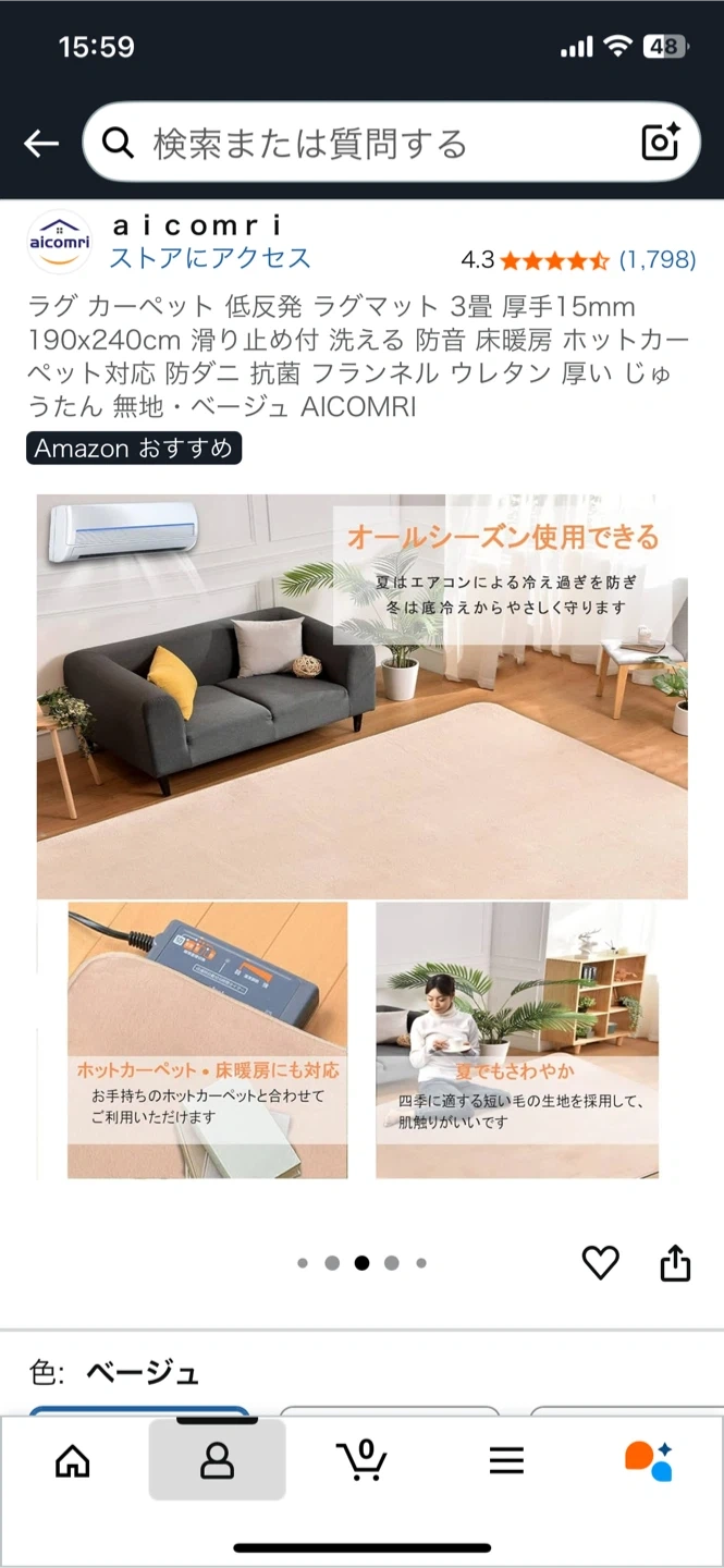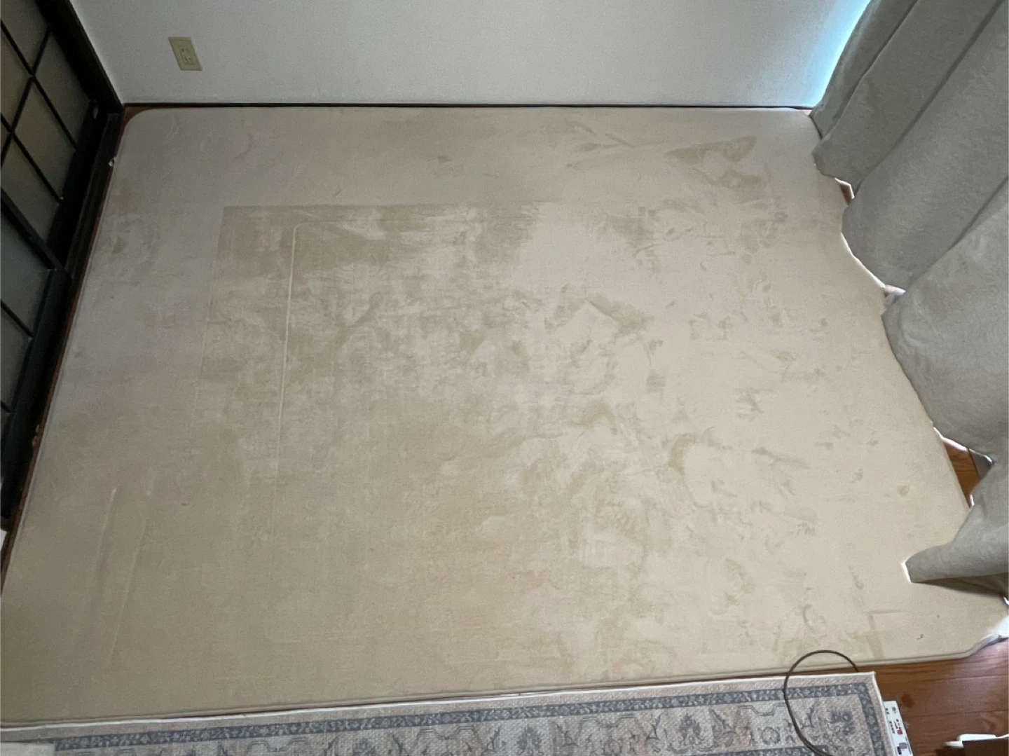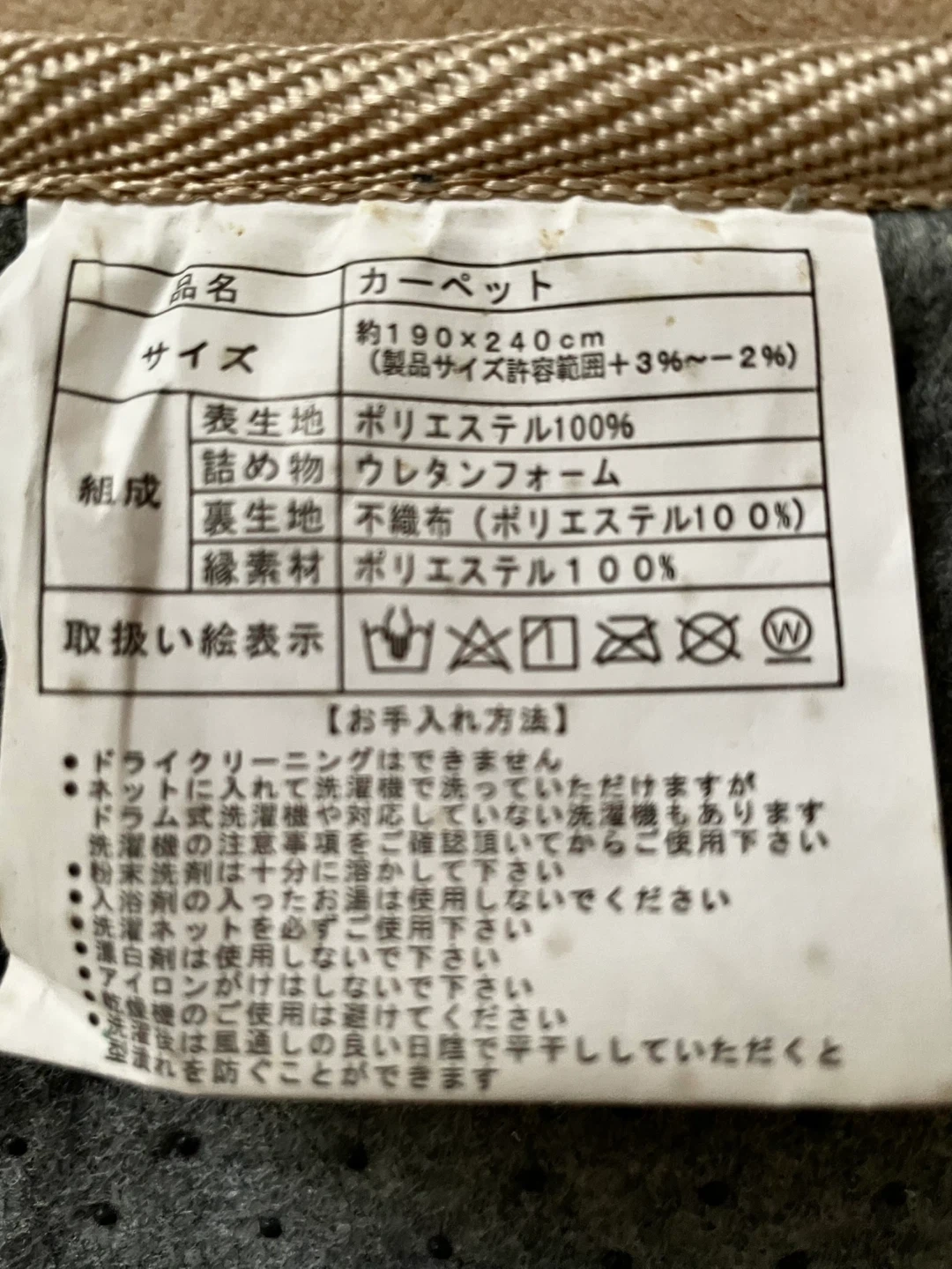 ベージュのカーペットです 約一年使用しました。 このカーペットの上に2/3はもう一枚カーペットを重ねて使っていたので汚れ少ないですが、端の方は使用感があります。 中古品が気にならない方よろしくお願いいたします。 カラーはベージュとありますがピンクベージュに近いです。 【情報】 サイズ:約190x240cm 素材:表生地 ポリエステル100%、詰め物 ウレタンフォーム、裏生地 不織布(ポリエステル100%)、縁素材 ポリエステル100% 【状態】 使用感あり