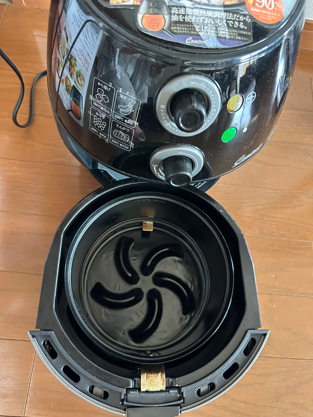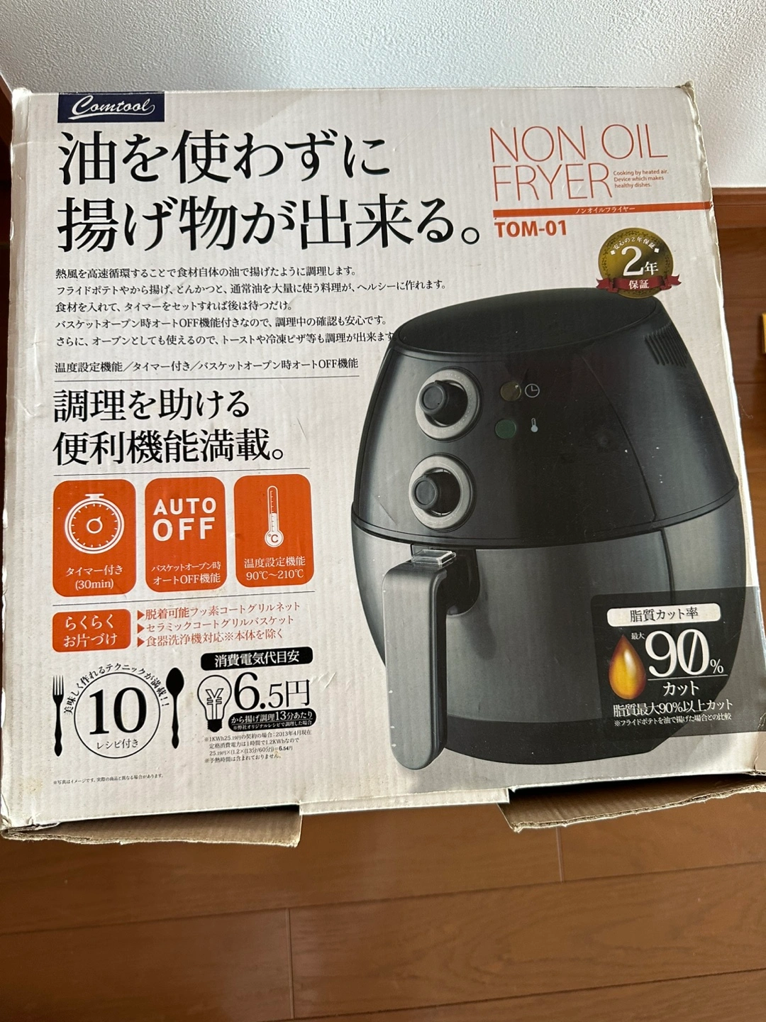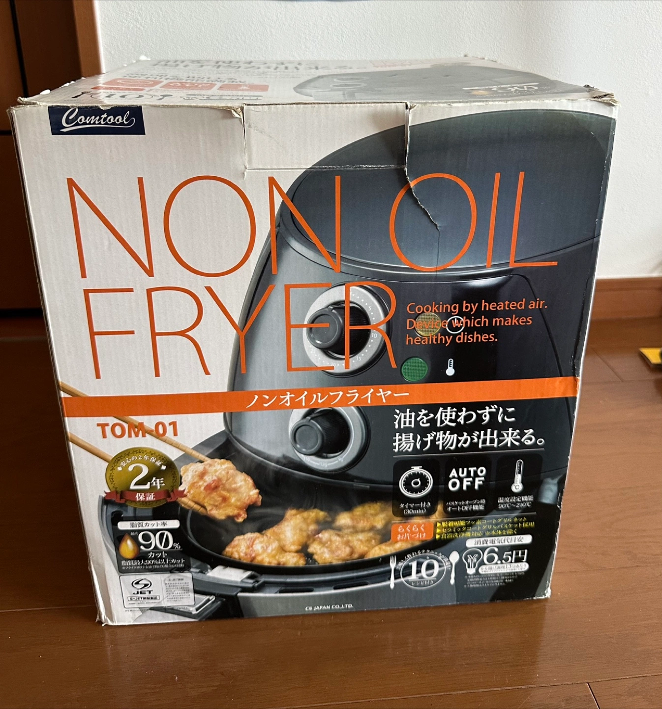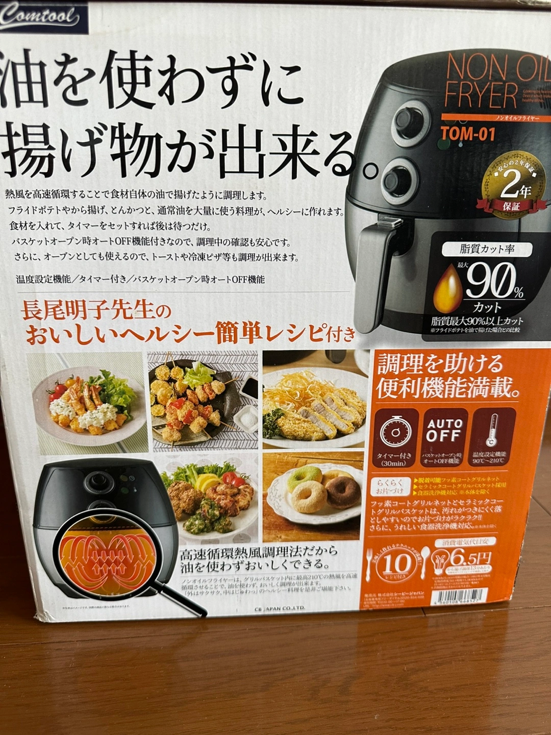 カムトゥールのノンオイルフライヤーです 【情報】 ブランド:カムトゥール 商品名:ノンオイルフライヤー 型番:TOM-01 【状態】 箱に傷みあり、本体は使用感少なめ、きれいにしてます。 油を使わずにフライできますので、ヘルシーでおいしい料理が仕上がります。手鳥羽先などの肉料理を調理すると、外はカ リッと、中はジューシーに。 中古品であることご了承ください。