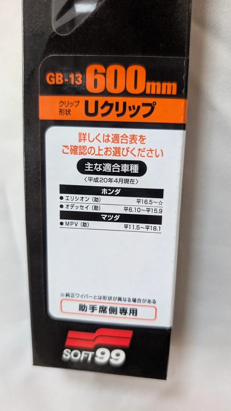 【情報】 ブランド:ガラコ 種類:ワイパーブレード 型番:GB-13 サイズ:600mm クリップ形状:Uクリップ 主な適合車種:ホンダ エリシオン、オデッセイ、マツダ MPV(平成20年4月現在) 助手席側専用 昨年2024年秋頃間違えて購入した物になります。 です。 一度開封しておりますが、未使用品です。 保管は暗所にて保管しておりました。 以上の内容をご理解いただける方のみご購入お願い致します。