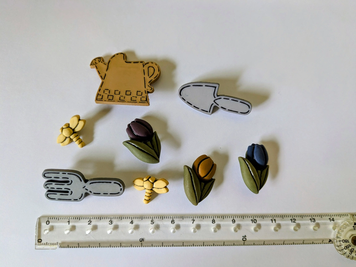 ガーデニングモチーフのボタン、8個セットです ・モチーフ:じょうろ、スコップ、トンボ、チューリップなど ・状態:未使用ですが、開封後、自宅保管していました 中古品であることご了承ください