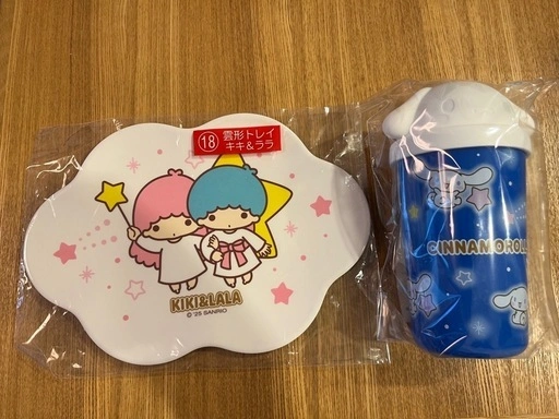 サンリオ 当りくじ サンリオキャラクター大賞 2025 タンブラー シナモロール シナモロールの可愛いデザインの350mlプラスチックカップ。 雲形プレート キキララ リトルツインスターズ キキ&ララのデザインの雲形トレイ。 お目当ての子が当たらなかったので必要な方にお譲りさせていただきます。 新品未使用ですが一度人の手に渡ったものなので神経質な方はお控えくださいませ。 ご希望の方はお気軽にご連絡ください。