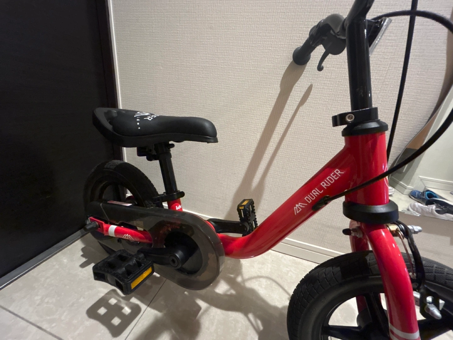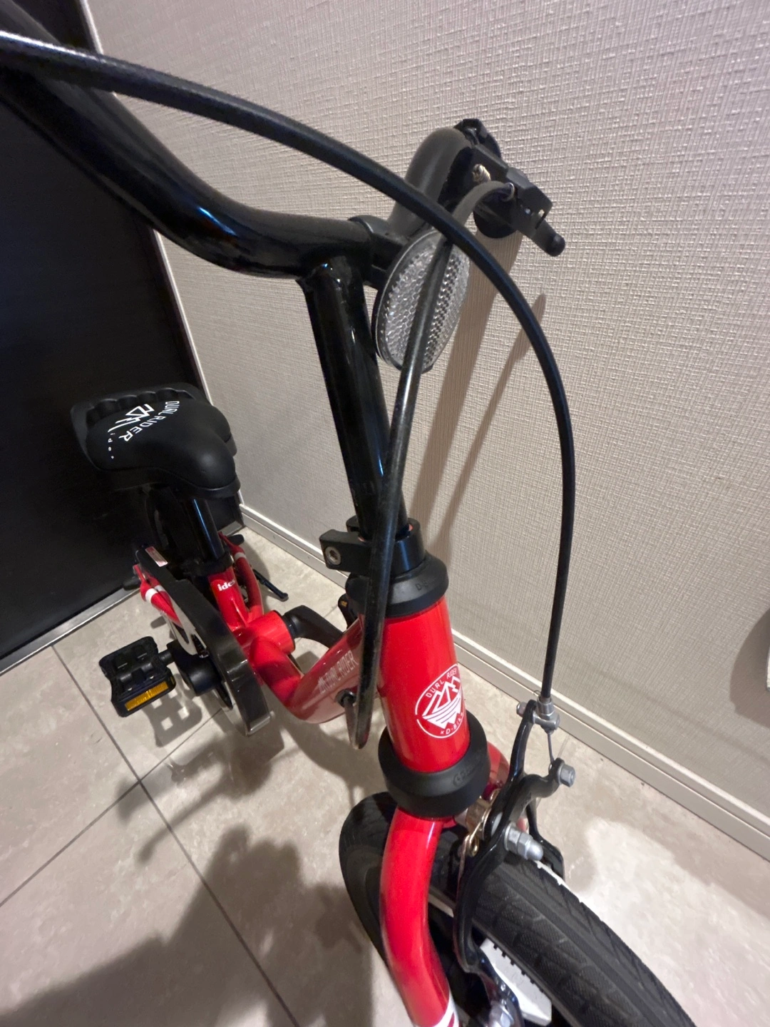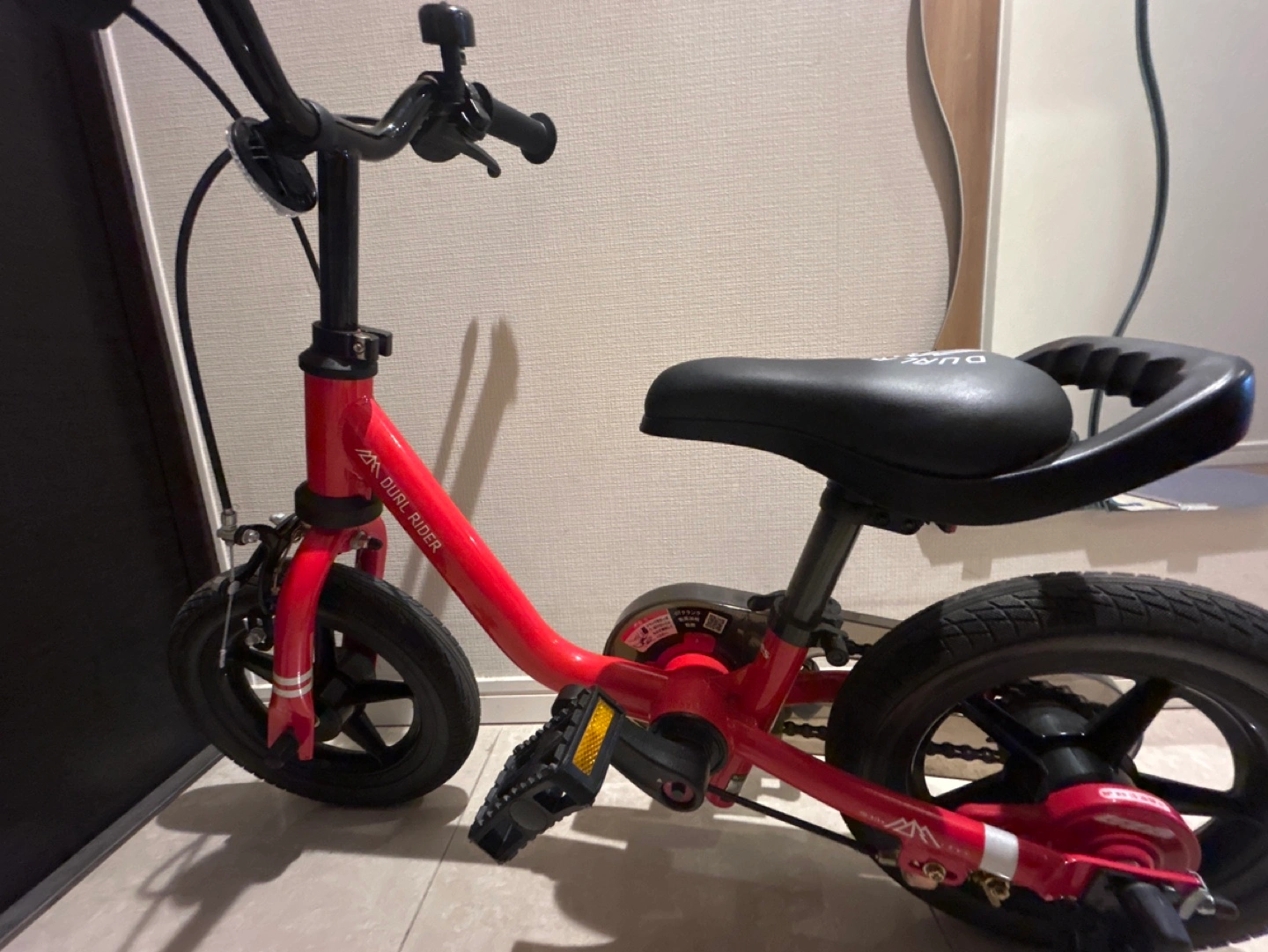 簡単にペダルを取り外し出来るキックバイクです。バランスバイクと自転車と両方として使用出来ます。 スタンド付きで自立します。 2025年の1月に購入し使用頻度は少なめです。 屋根のある屋外で保管していました。 ハンドルの支柱部分にキズ汚れあります。(写真をご覧下さい) 説明書、部品一式そろっています。 以下公式の説明です。 はじめての1台で、2つのできた! 2才半~年長さんまで乗れるペダル後付けキックバイク。 デュアルライダーなら、1台で「キックバイク」&「自 転車」をカンタンよくばりデビュー!まずは、キックバイクモードで「バランス」と「ブレーキ」の感覚を養おう!バイクに慣れたら「自転車モード」にチャレンジ! 工具不要【5秒】でいつでもどこでもカンタンにヘンシンできるから、子供の気持ちに寄り添って、楽しく自転車デビュー!