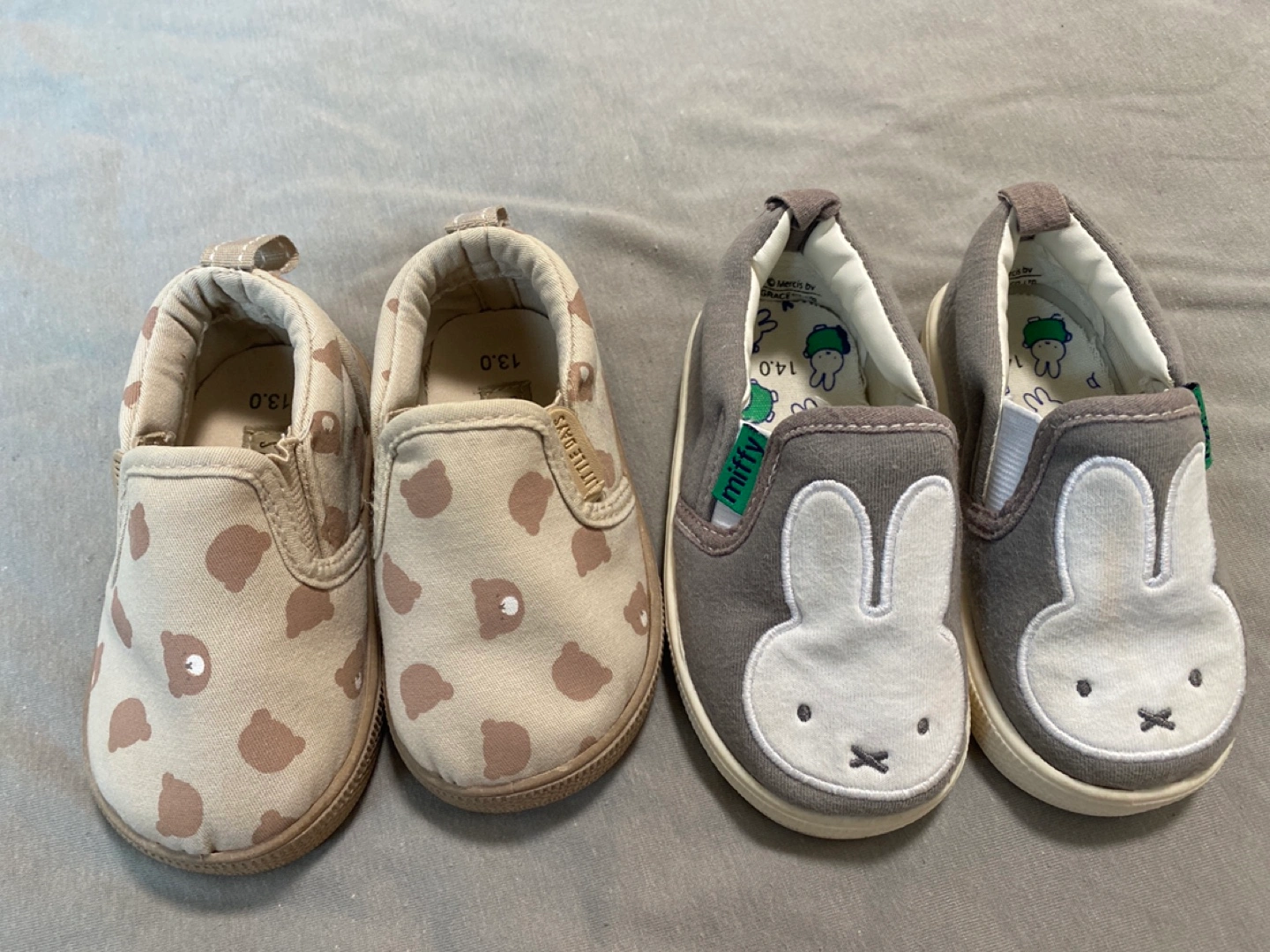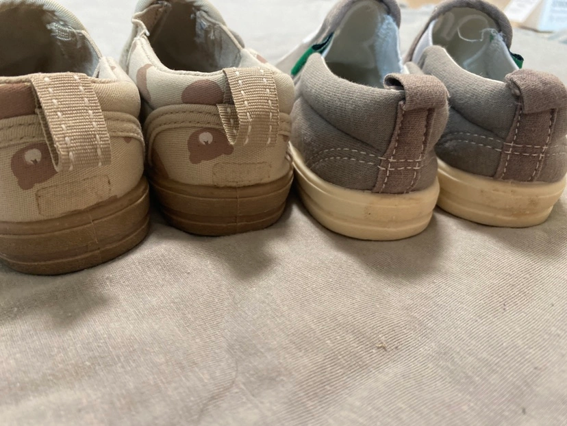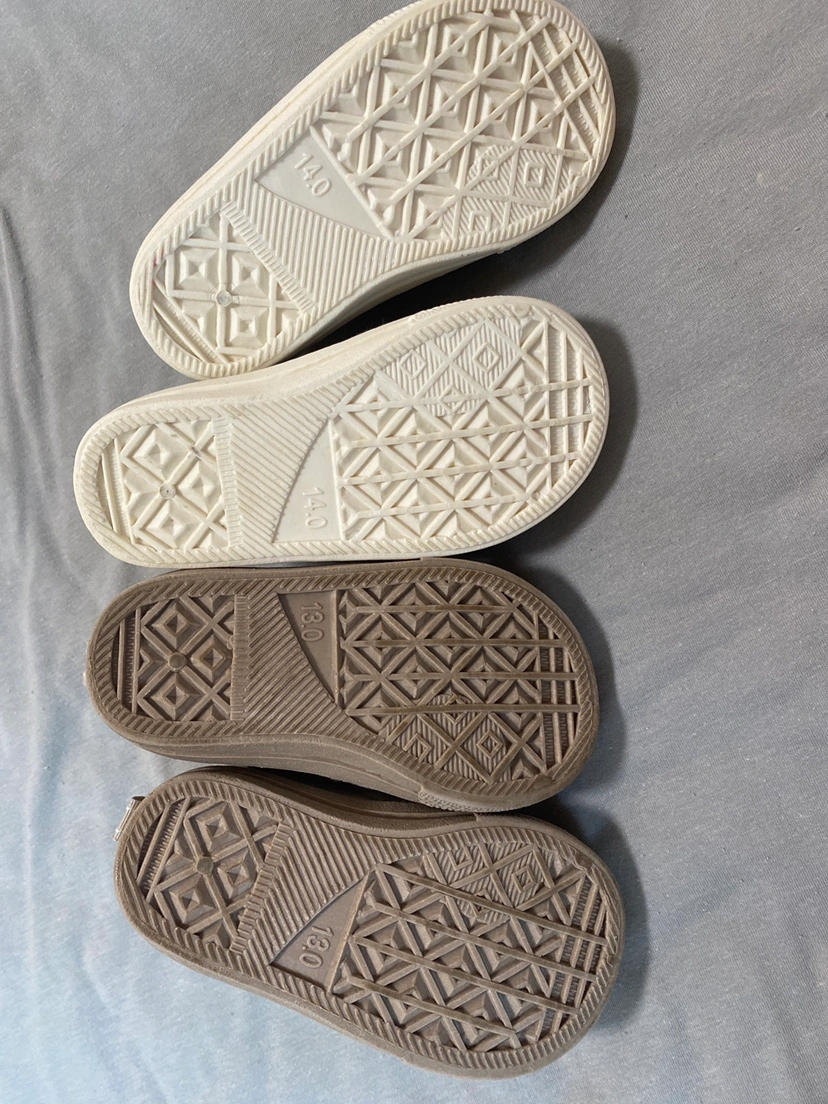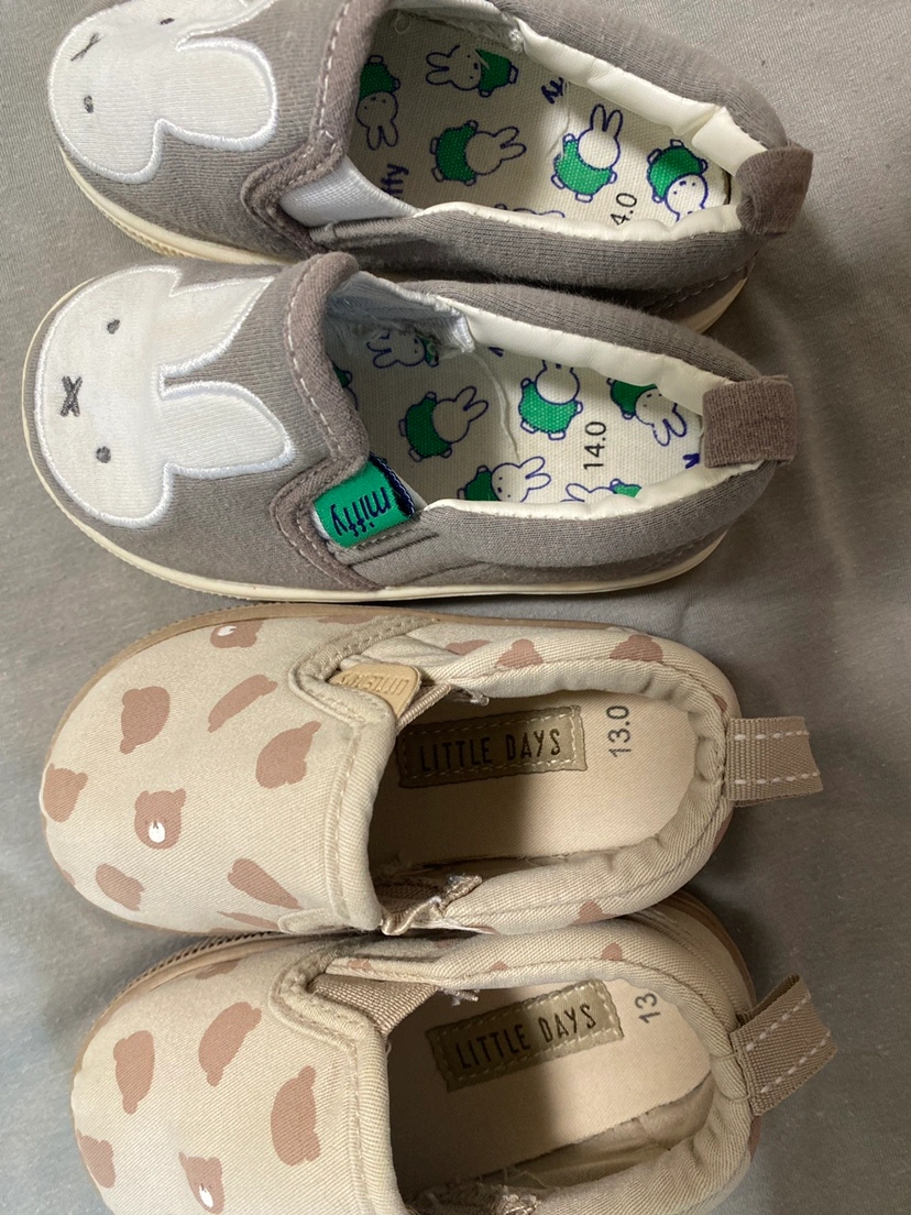 13cmと14cmのスリッポンタイプのシューズです。 保育園の上履きとして使用していました。 どちらも3ヶ月ほどの使用。ホームクリーニングして収納していたものです。 使用に伴うくすみ等はありますが、明らかに目立つような汚れや破損はありません。 かかと側に、名前シールを剥がした跡と若干のベタつきだけあります。ご容赦ください。 平日は仕事のため、 土日祝のお渡し希望です。