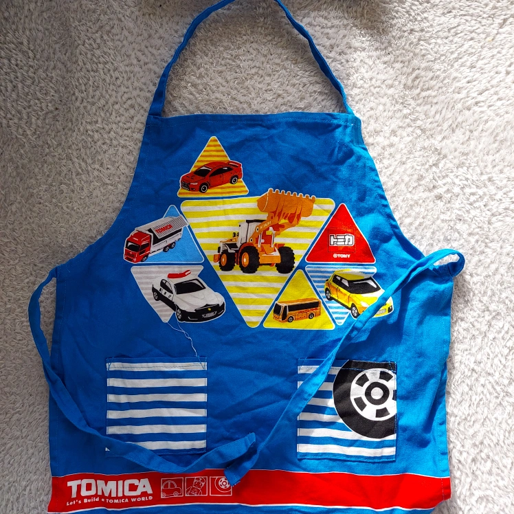 子供用のエプロンと三角巾です。 幼稚園の調理実習の時や家 で手伝いをする時に使っていました。 4~5年前に購入したものになります。 シワだらけなので、お渡しする際はアイロンを掛けてからお渡しします。 記名があるので、タグ部分は切り取ってお渡しするのも可能です。 トミカのエプロンなので、男の子や車が好きなお子さんがいる方におすすめです。 お渡し場所は、購入していただいた方と決められたらと思います。