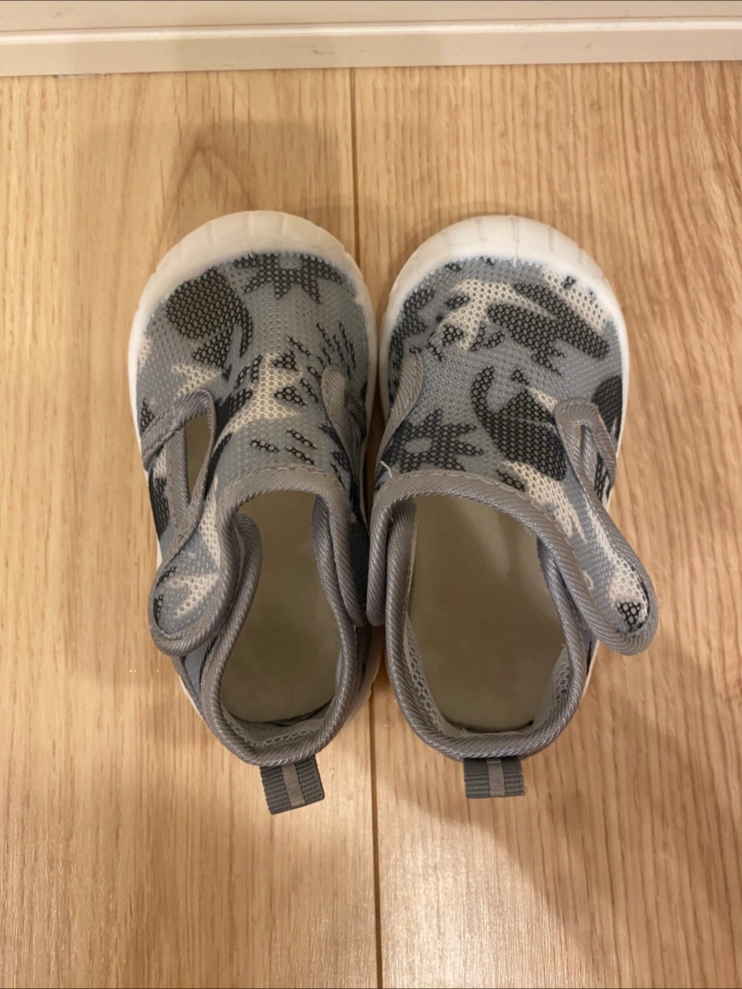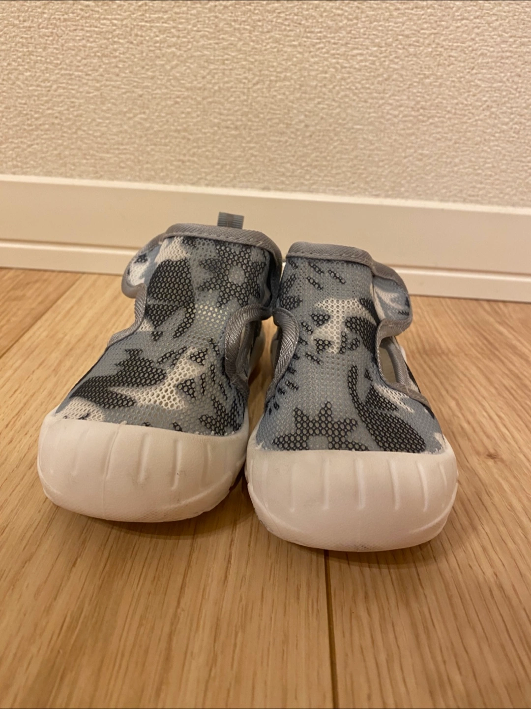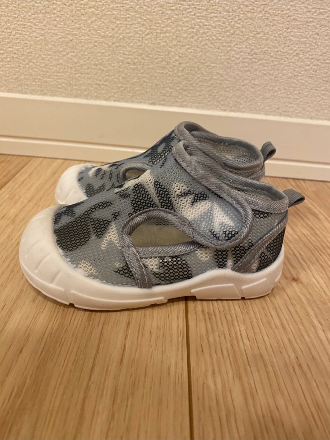 ・カラー:グレー、白 ・迷彩柄 ・マジックテープ式 ・13.5センチ ・メッシュシューズ ノンブランドです。 2、3回使用しました。 白地シリコン部分につま先あたりに多少汚れがあり、靴裏は汚れが目立ちます。 ただ微妙なサイズを買ってしまったため、すぐサイズアウトしてしまい、ほぼ履いていないので靴の中等は綺麗です。 まだまだ履けるため勿体無いので募集します。 夏にピッタリのメッシュシューズ つま先までしっかり覆われているので、水遊び時も足元を心配せずに履かせられます。 靴の安心感とサンダルの涼しさを兼ね揃えた便利な靴!今も別サイズで愛用しています。 おすすめです。