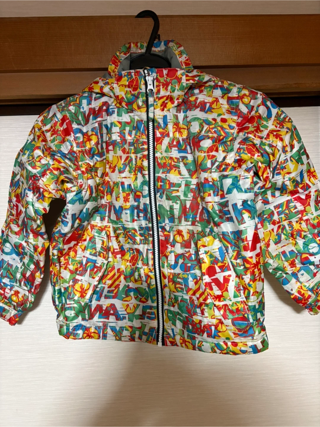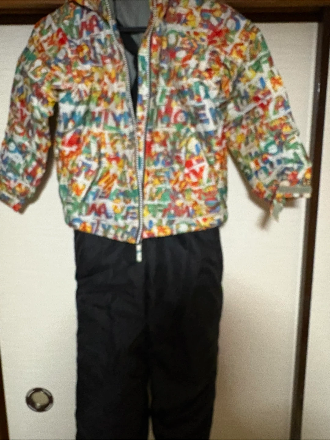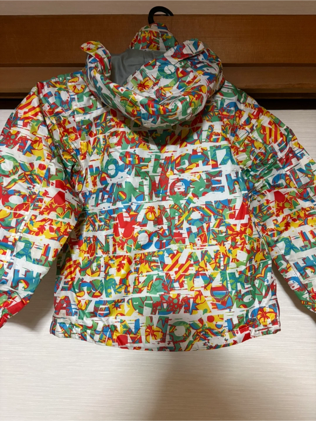 キッズのスキーウェアのジャケットです。 雪遊びで2回、保育園の登園で数回着用しました。 フードは取り外し可能です。 他で掲載しているスキーパンツとのセット売りも応じますので、お問い合わせください。 ・色:マルチカラー ・デザイン:総柄、英字プリント ・状態:若干の使用感あり。 中古品であることご了承ください