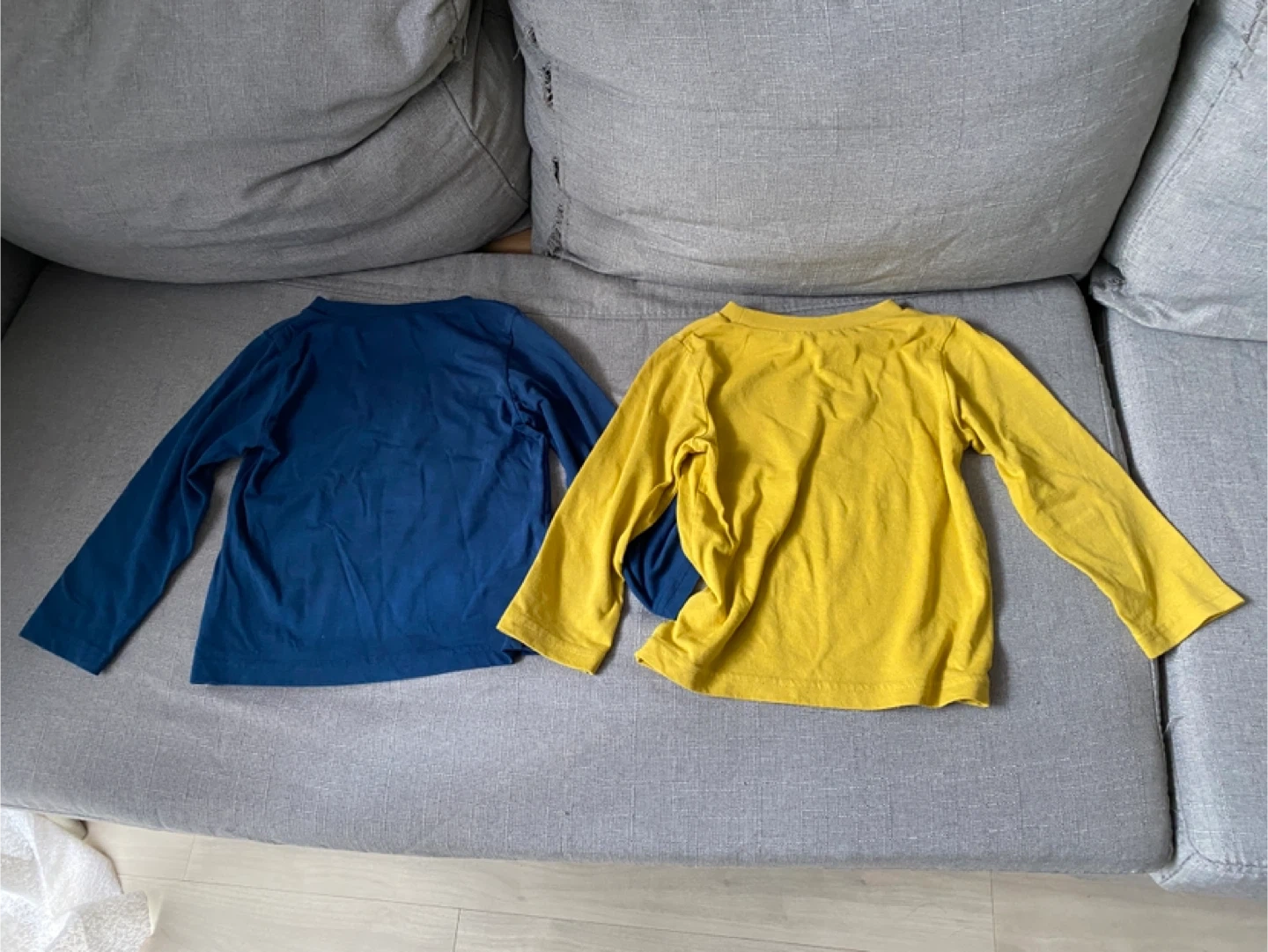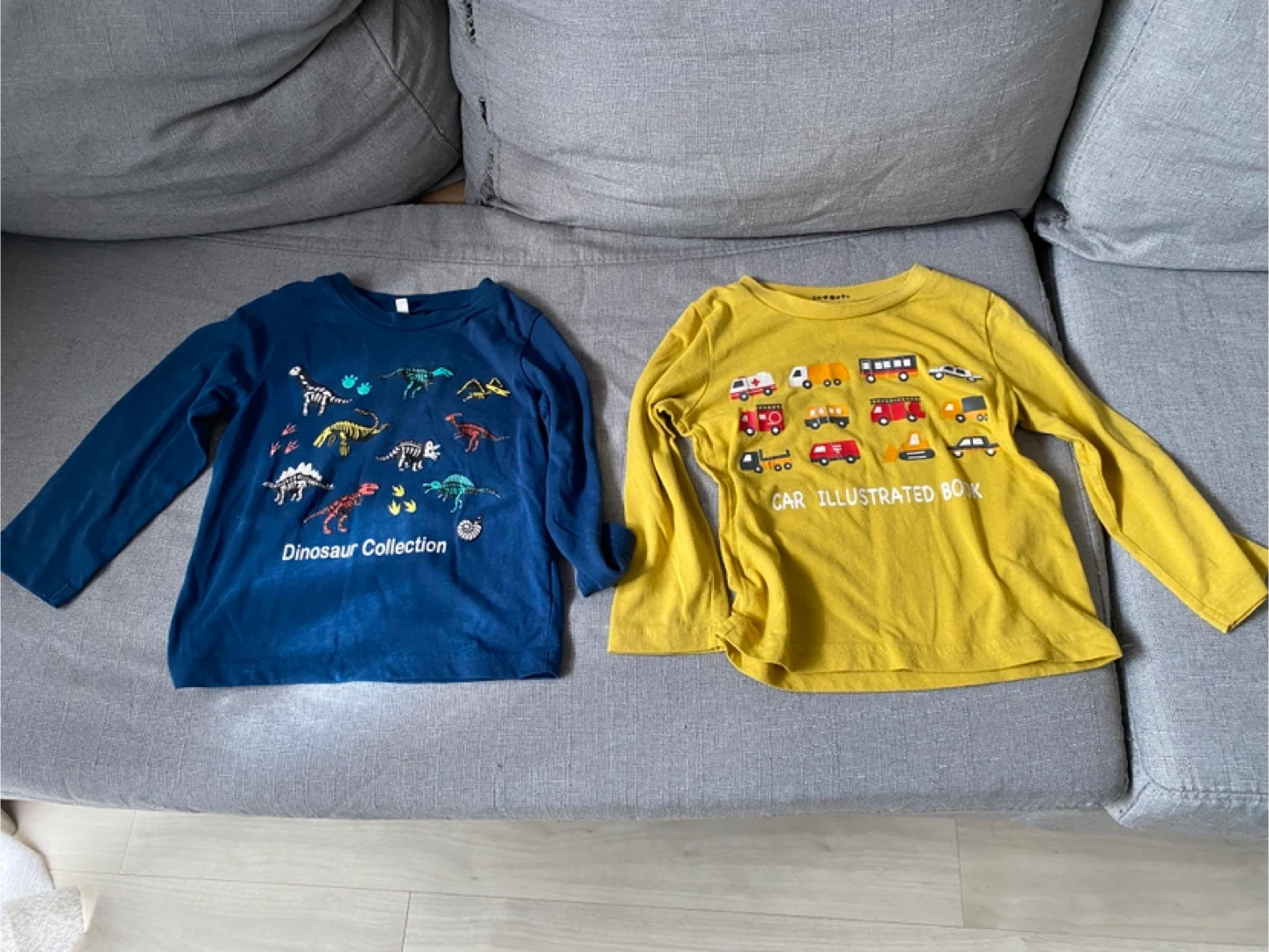 キッズの長袖Tシャツ2枚セットです ・色:青、黄色 ・デザイン:恐竜、車 ・サイズ:100cm ・使用感あり 中古品であることご了承ください 受け取り場所は基本的に綱島駅でお願いしています。 平日日中の受け渡しだと日時にかなり融通が利きます。