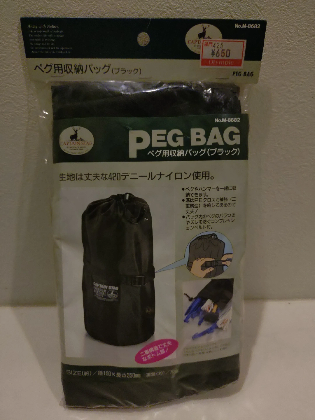 キャプテンスタッグのペグ収納バッグです 【情報】 ブランド:キャプテンスタッグ 商品名:ペグ収納バッグ(ブラック) 型番:No.M-8682 素材:ナイロン/420D(PUコーティング) サイズ:約150mm×350mm 重量:約70g 【状態】 新品、未開封 【付属品】 なし
