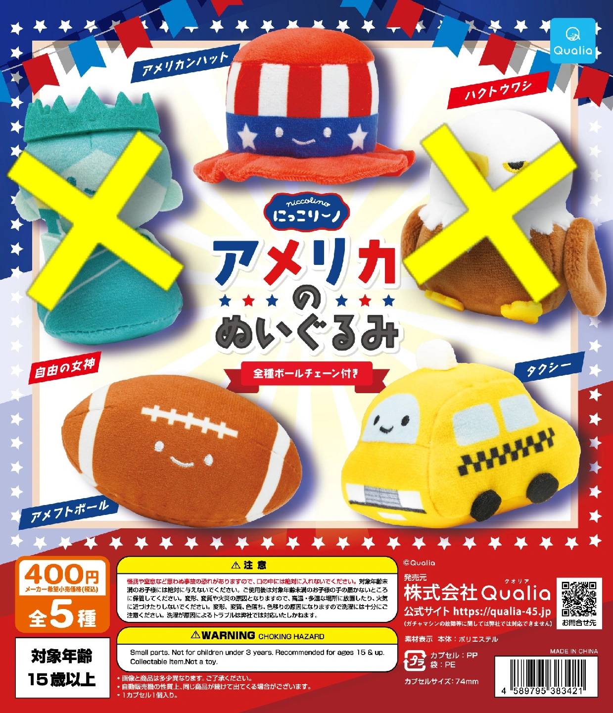 にっこり〜ノ アメリカのぬいぐるみ ✖印のモノはありません。 ・アメリカンハット…1個 ・アメフトボール…3個 ・タクシー…3個 ※定価:1個¥400(まとめ売り可) カプセルに入ったままの未開封、新品です。