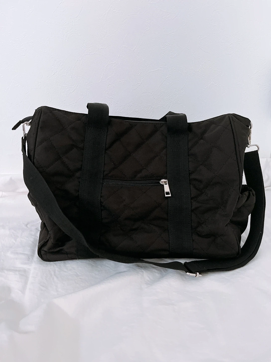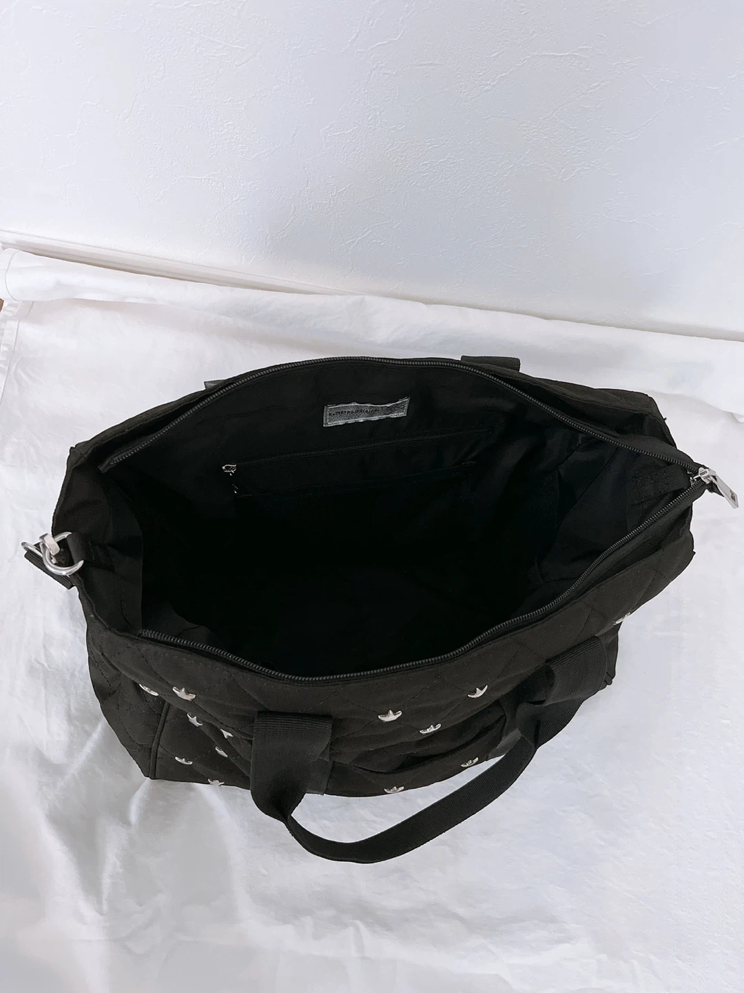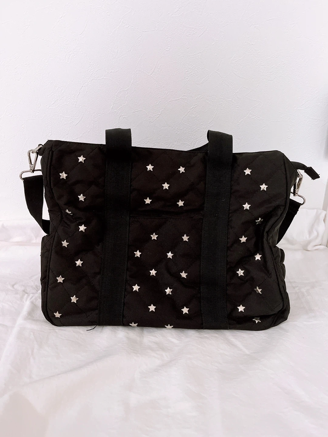 クマタンオリジナルのキルティングバッグです。 ・カラー:ブラック ・デザイン:星柄、キルティング ・状態:型崩れしてます。が 、使用していれば特に問題ないと思います。 中古品であることご了承ください クマタンのマザーズバッグです。 外側にポケットが4ヶ所、中側に5ヶ所あます。マグを横のポケットに入れたり使いやすかったです。 もちろんマザーズバッグとしてじゃなくても使えます。