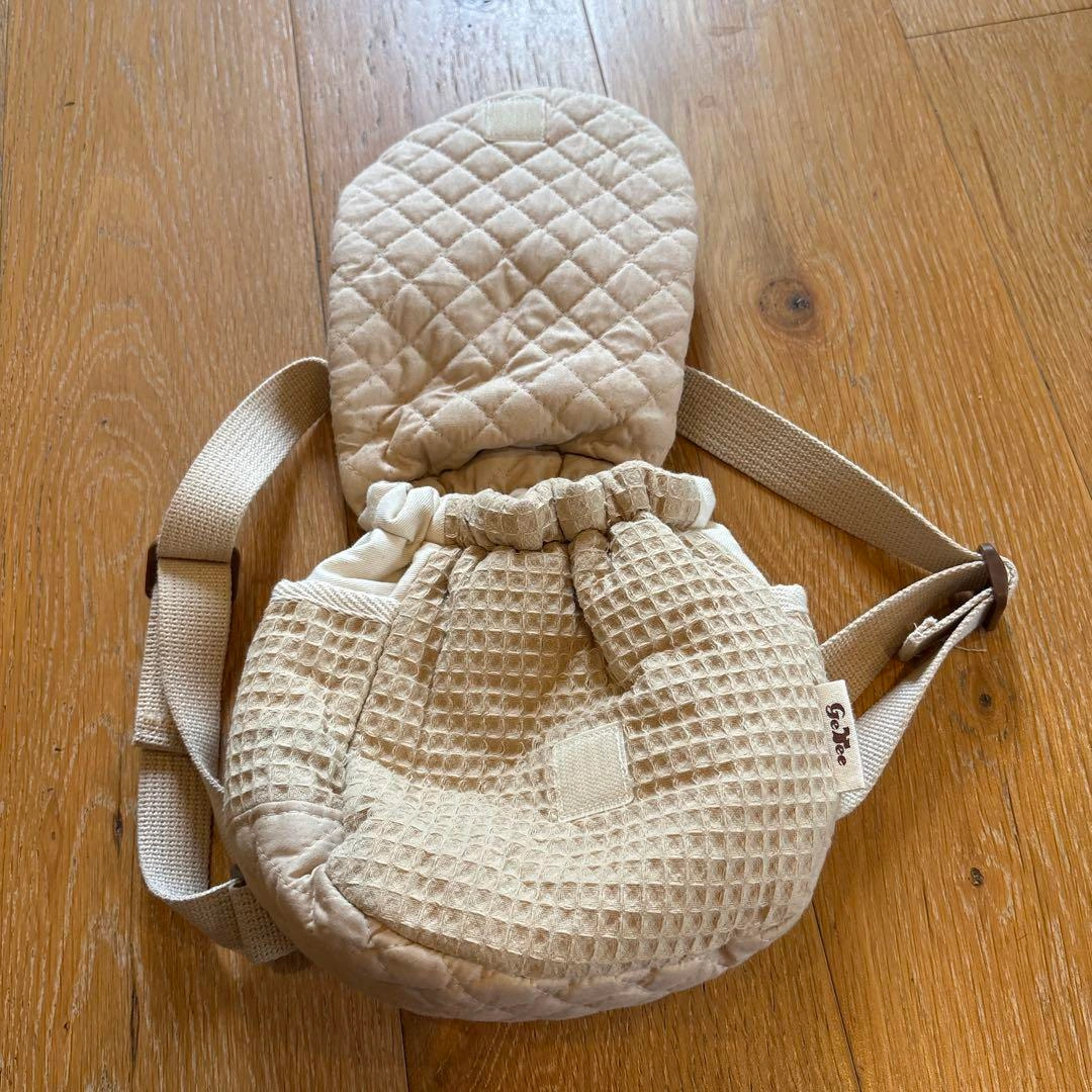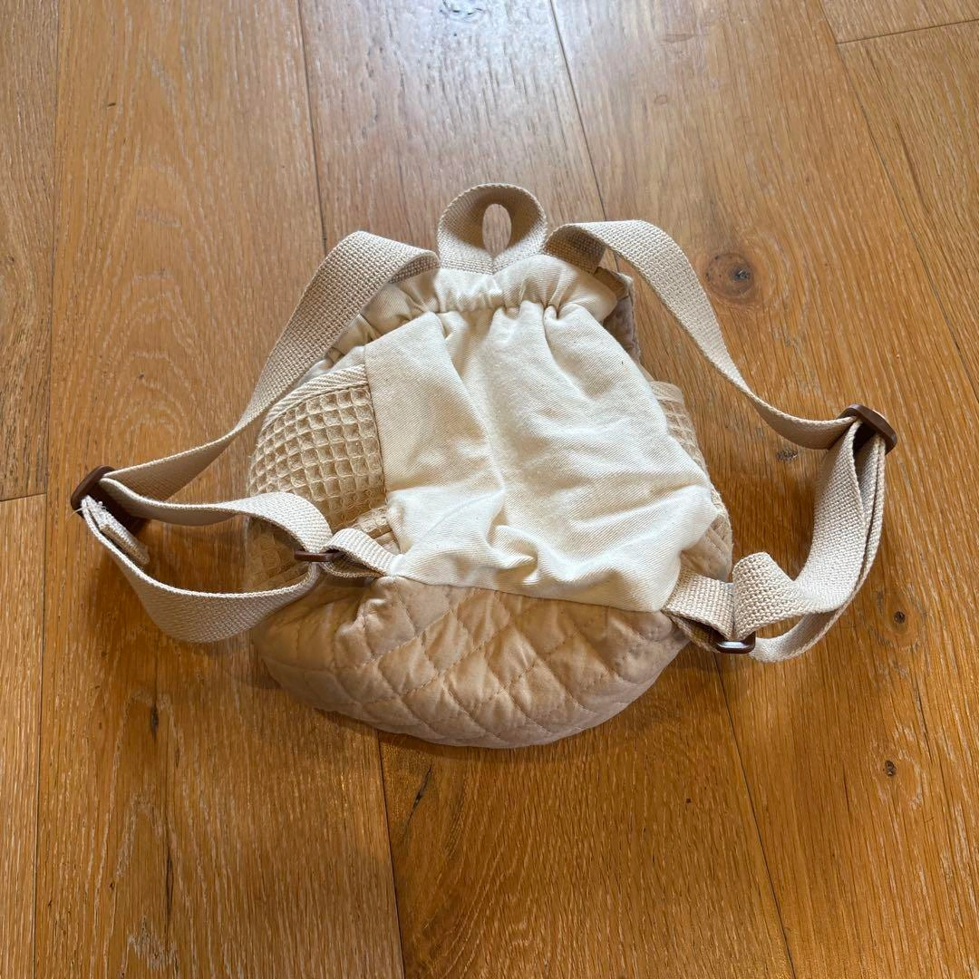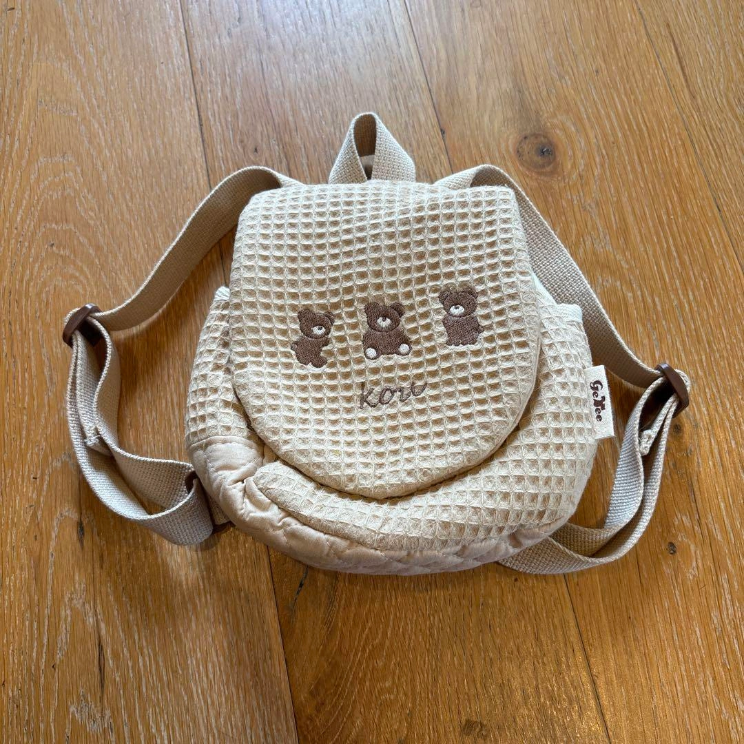 クマの刺繍が施されたベージュのリュック型バッグです。調整可能なストラップ付き。 大きさは縦横約20cmくらいです。 名入りではありますが、気にしなければ美品かと思います。 ご希望の方はお気軽にご連絡ください。