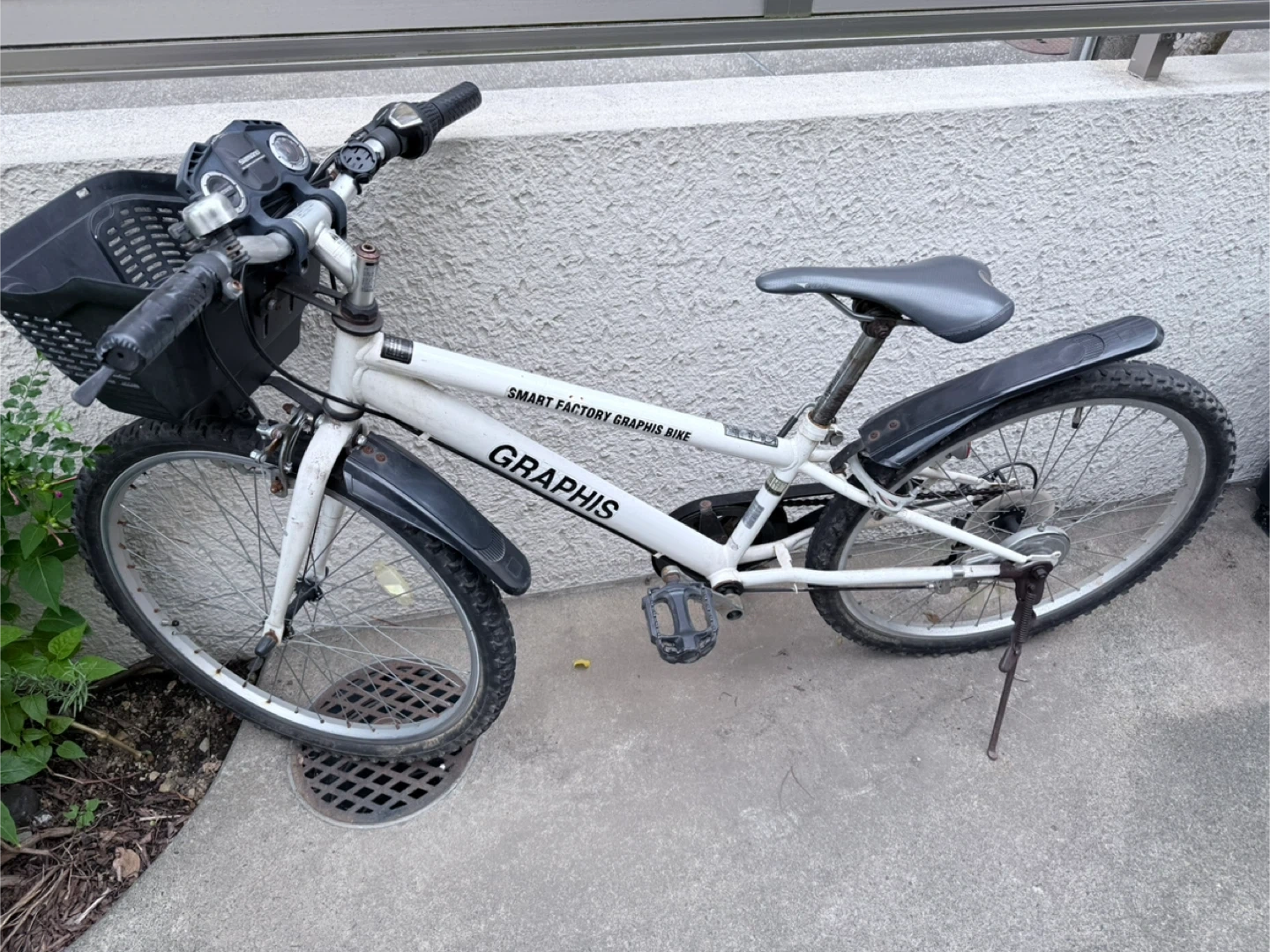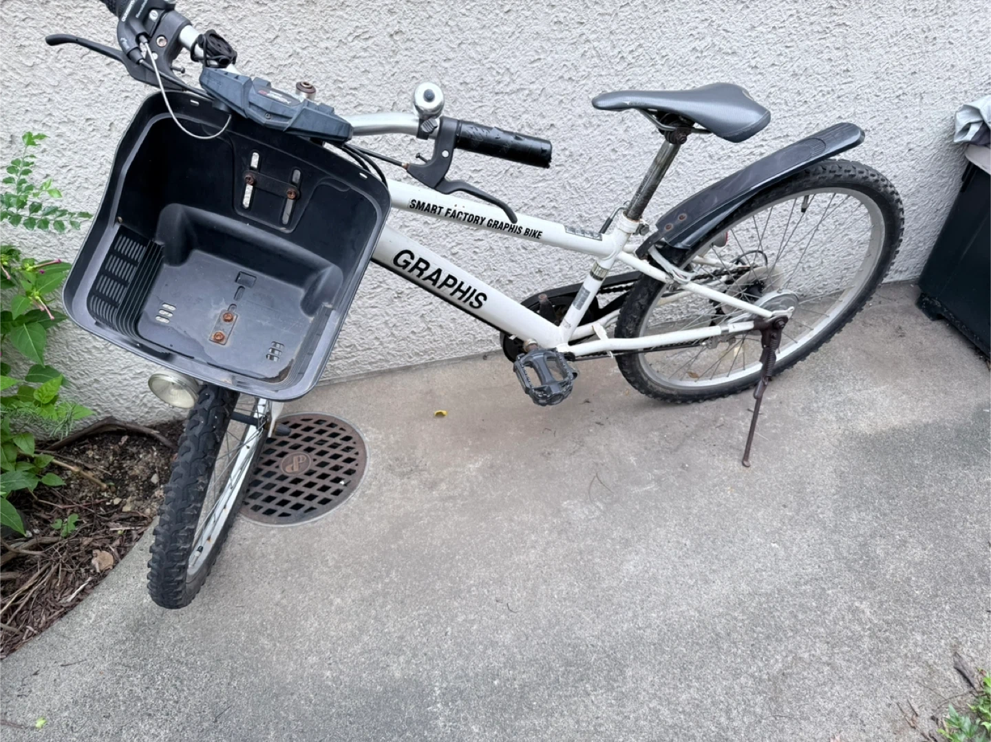 グラフィスの自転車です 小学生中学年から高学年にちょうど良いサイズです。6段変速です。 ライトが壊れているので、夜に使う時だけ100円ショップのライトつけていました。こちらは付けません。 持ち手のゴムが劣化していますので、ご了承下さい。 サビや汚れがある部分もあります、中古品であることご了承ください。 ・前カゴ付き ・使用感あり