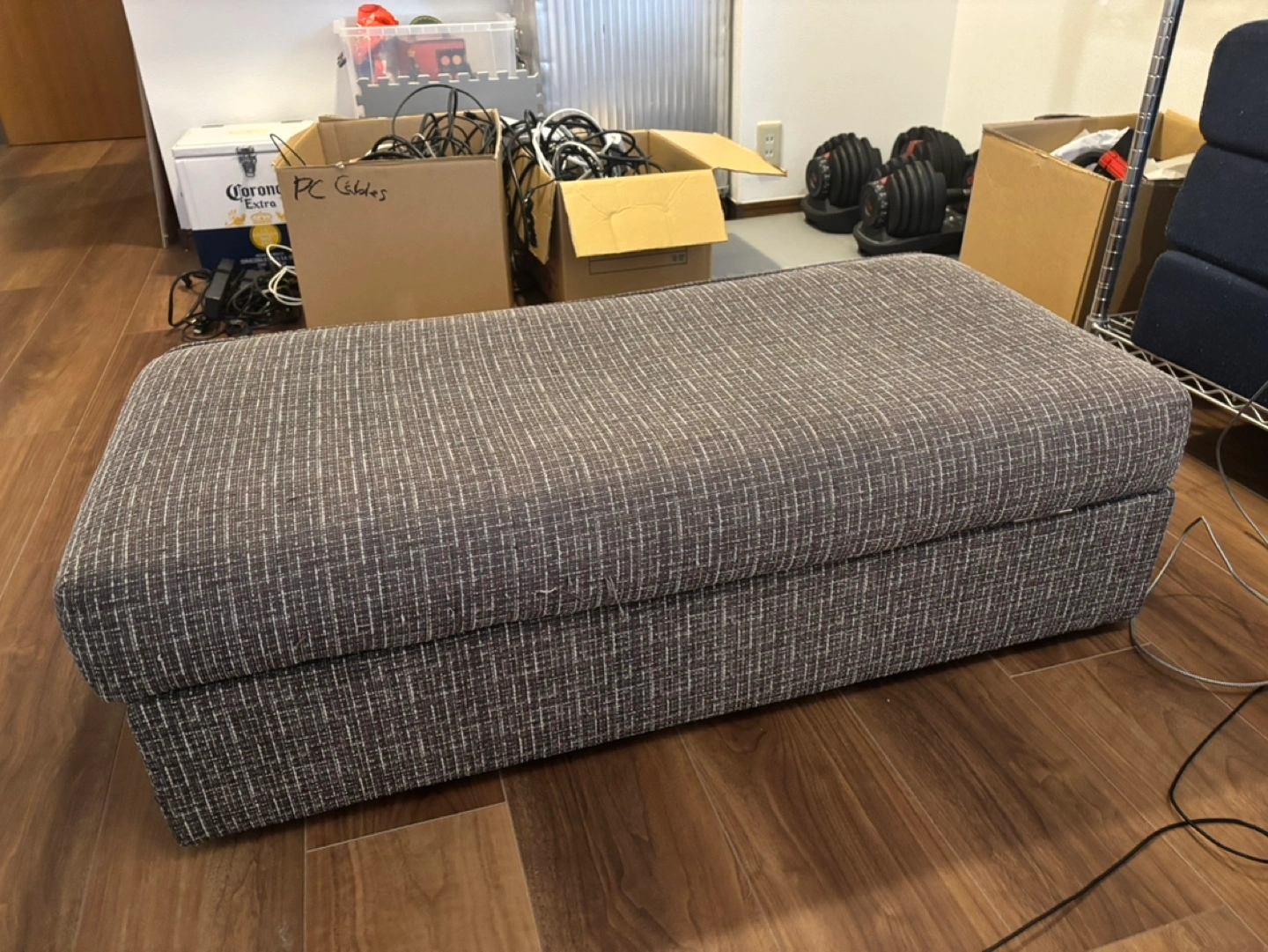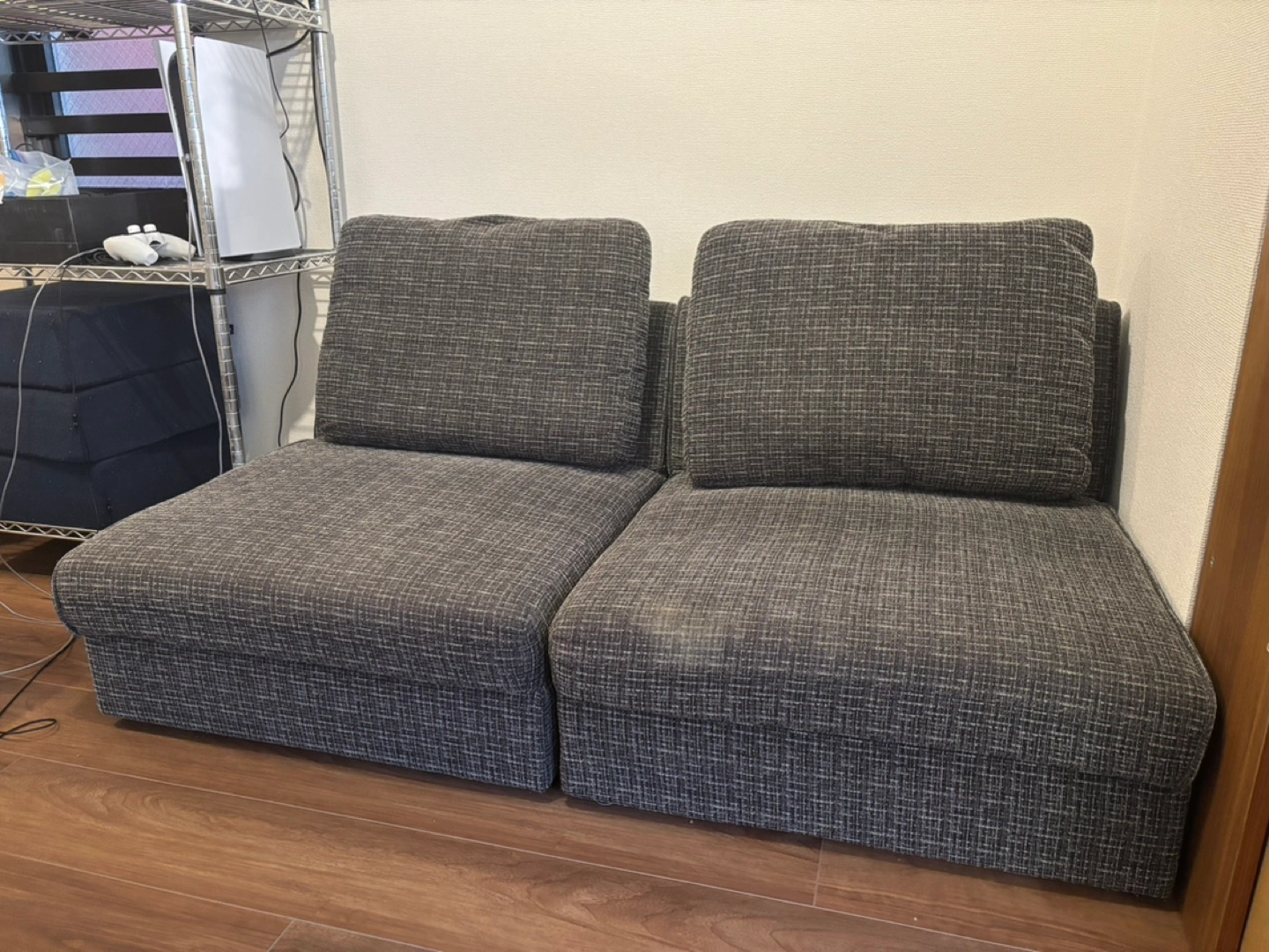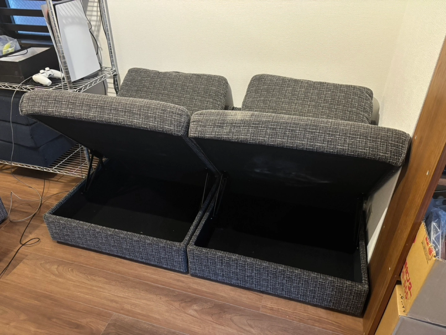2015年に楽天市場で買ったのソファです。 元値は75000円でしたが、もし欲しい方が居れば譲りたいと思います。 二つに別れる構造なので、別々に置くこともできます。 また、全部並べたらソファベッドにも出来ます。 枕が二つ付いております。 どれも収納スペースがあります。 使用感はありますが綺麗な方だと思います。色は写真で確認をお願いします。 喫煙者、ペットはおりません。 中古品ですので、ご理解の上購入をお願いいたします。 ソファーの状態: 使用感はありますが、シミ等はありません。一箇所もげ気味な場所はあります。写真でご確認ください。 オットマンの状態: 外見には何も問題ありません。金具は取り外しております。上のふたのような感じになっております。