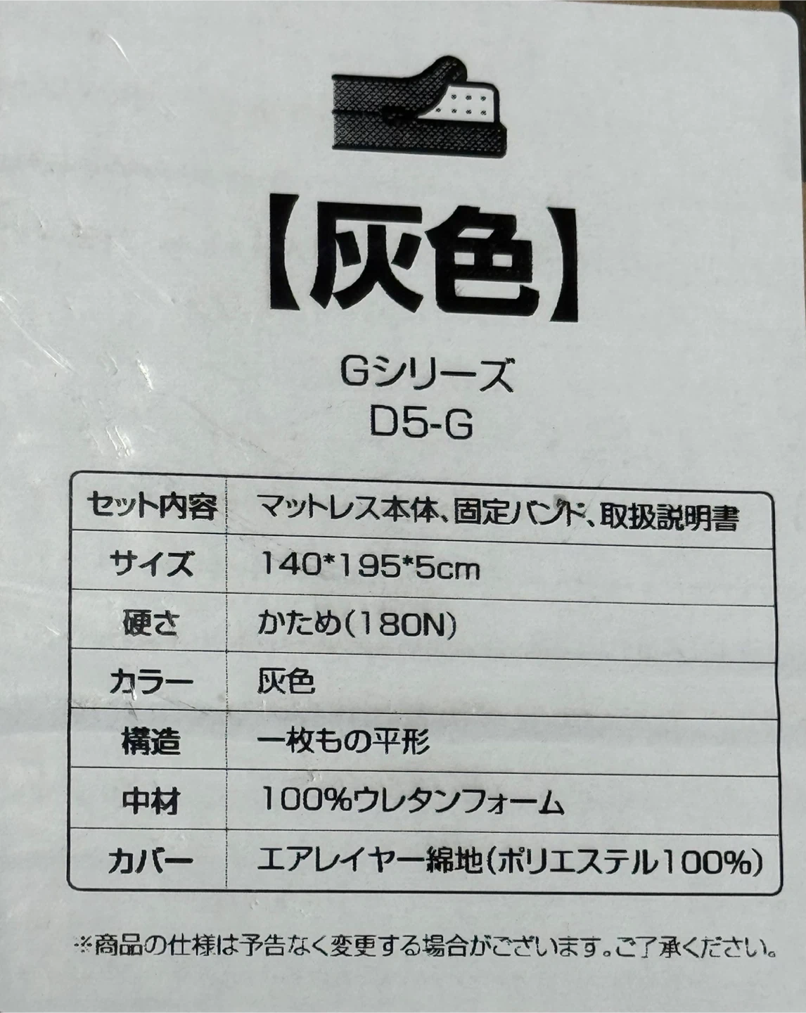 通気性の良いグレーのノンスプリングマットレスです。 - タイプ: ノンスプリングマットレス - 色: グレー - 取扱説明書: マットレス - サイズ:140×195×5cm 一枚もの平形で硬め【180N】のマットレストッパーとなります。中材はウレタンフォーム100%になります。カバーはエアレイヤー綿地で、ポリエステル100%です。 ご希望の方はお気軽にご連絡ください。