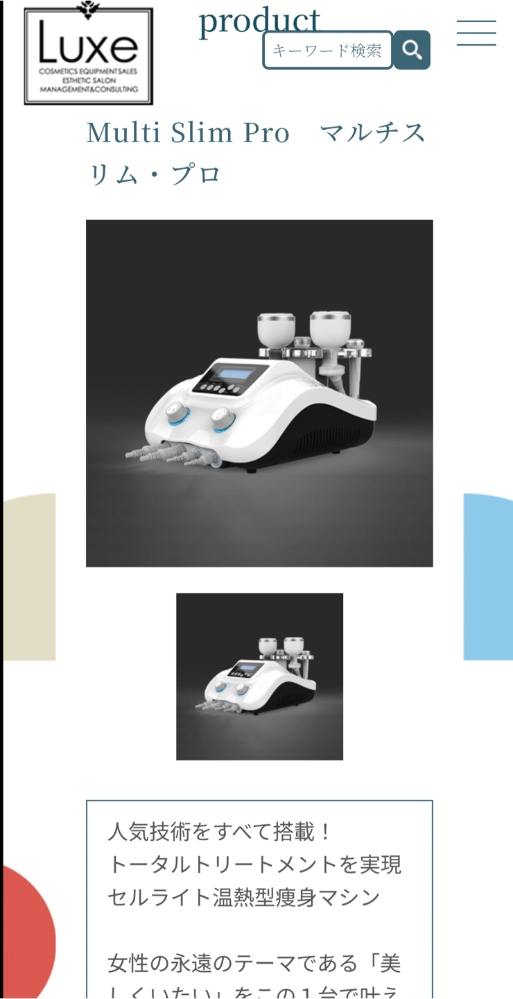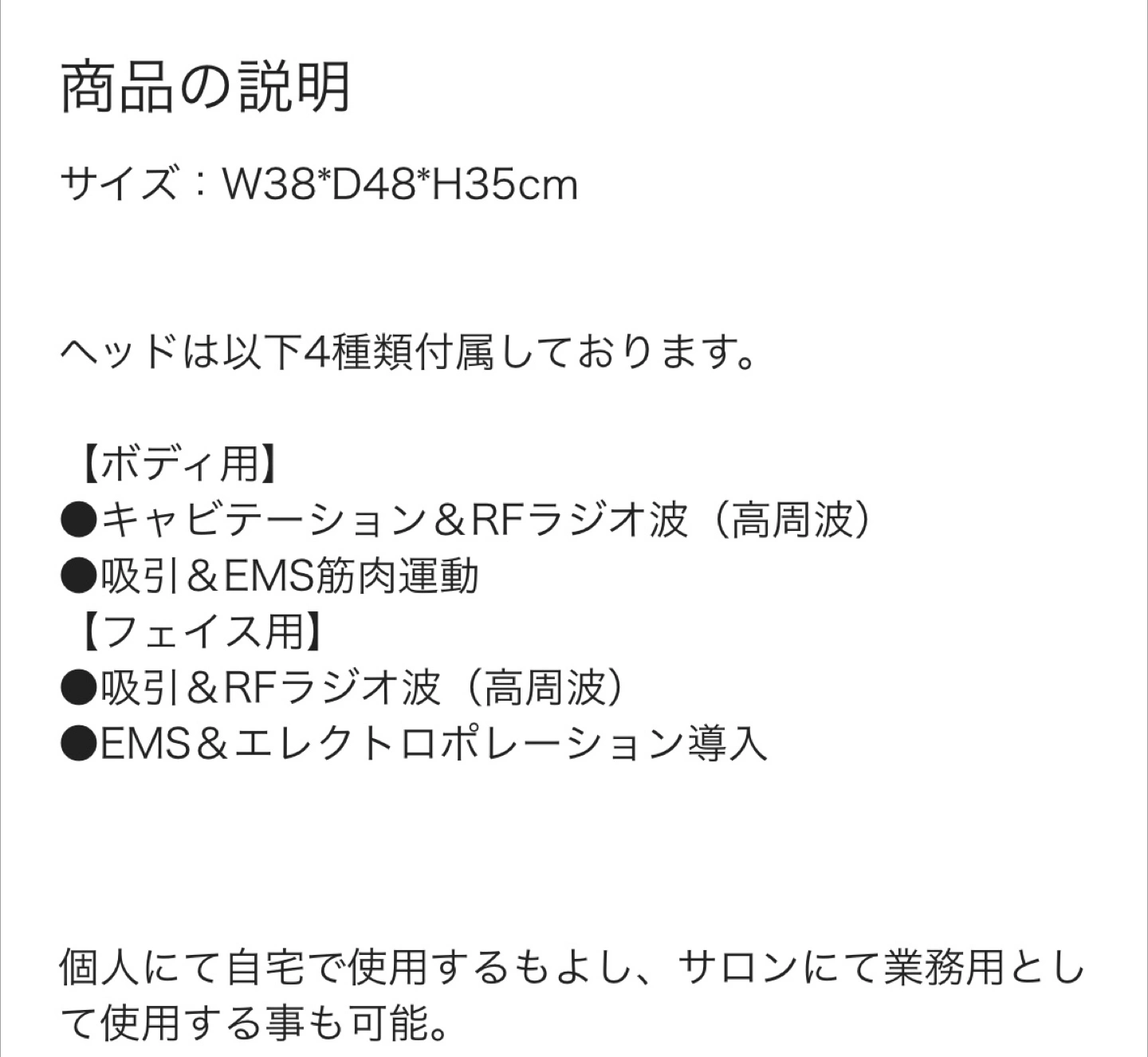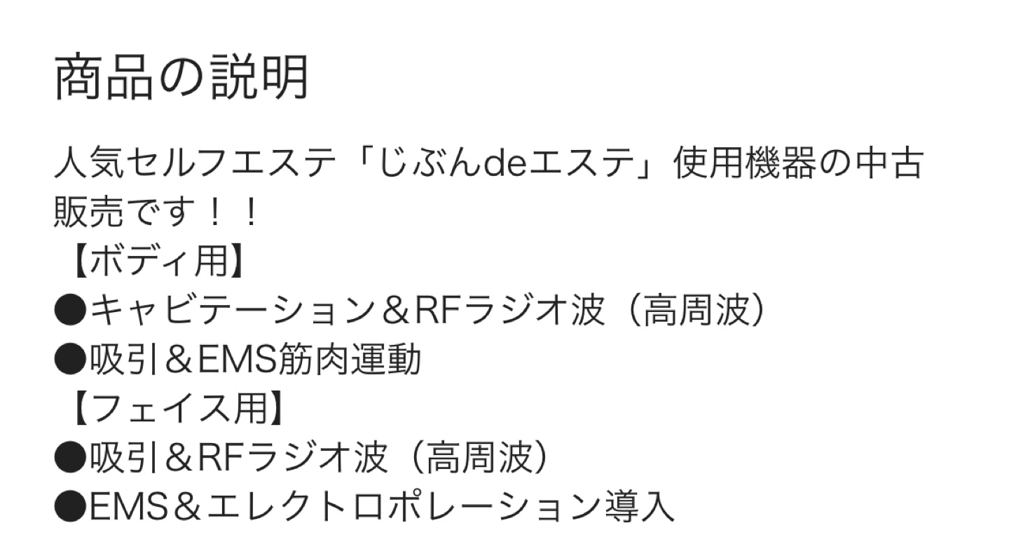 Multi Slim Pro リム・プロ 人気技術をすべて搭載。 トータルトリートメントを実現 セルライト温熱型痩身マシン 女性の永遠のテーマである「美しくありたいを一台で実現」 人気セルフェステ「じぶんdeエステ」使用機器の中古販売です。 中古で50万円でもsold outで人気でなかなか手に入りません ■吸引 脂肪やセルライトを揉みほぐしながら、リンパドレナージュを行います。 吸い上げることで、手の届かない骨の隙間の老廃物へも効果的。 •EMS 電気刺激により、筋肉の緊張と緩和を繰り返す方法。 筋組織の深部まで刺激することで、基礎代謝を上げ、筋肉強化と同時に引き締まった美しいボディラインを作ります。 #1: W38*D48*H35cm ヘッドは以下4種類付属しております。 【ボディ用】 ●キャビテーション&RFラジオ波(高周波) ●吸引&EMS筋肉運動 【フェイス用】 ●吸引&RFラジオ波(高周波) ●EMS&エレクトロポレーション導入 個人にて自宅で使用するもよし、サロンにて業務用として使用する事も可能。 定価80万円 使用頻度はかなり低めですが半額以下にお値下げ。 配送もお近くでしたら有料で承ります。 貸し出しレンタルもやっているのでお問い合わせください。