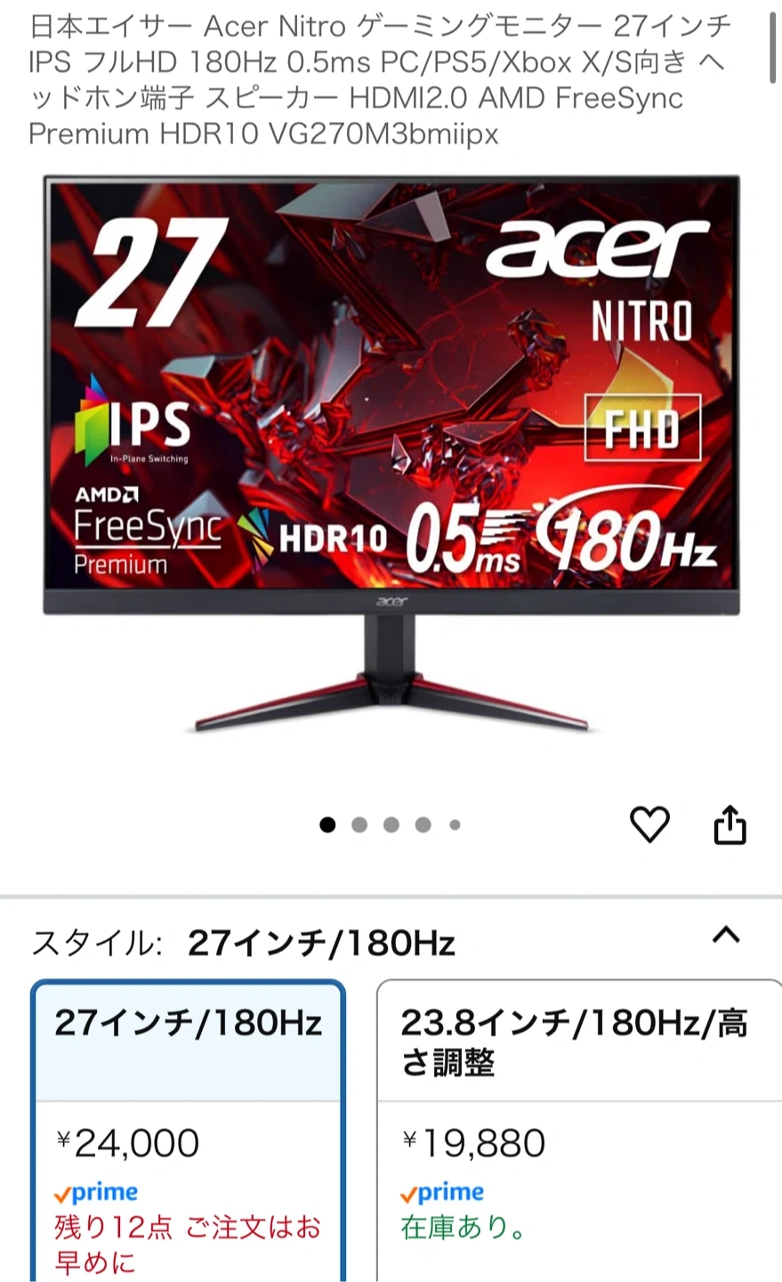 ゲーミングモニター 27インチ acer VG270M3bmiipx