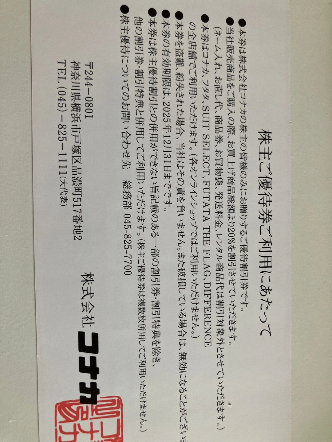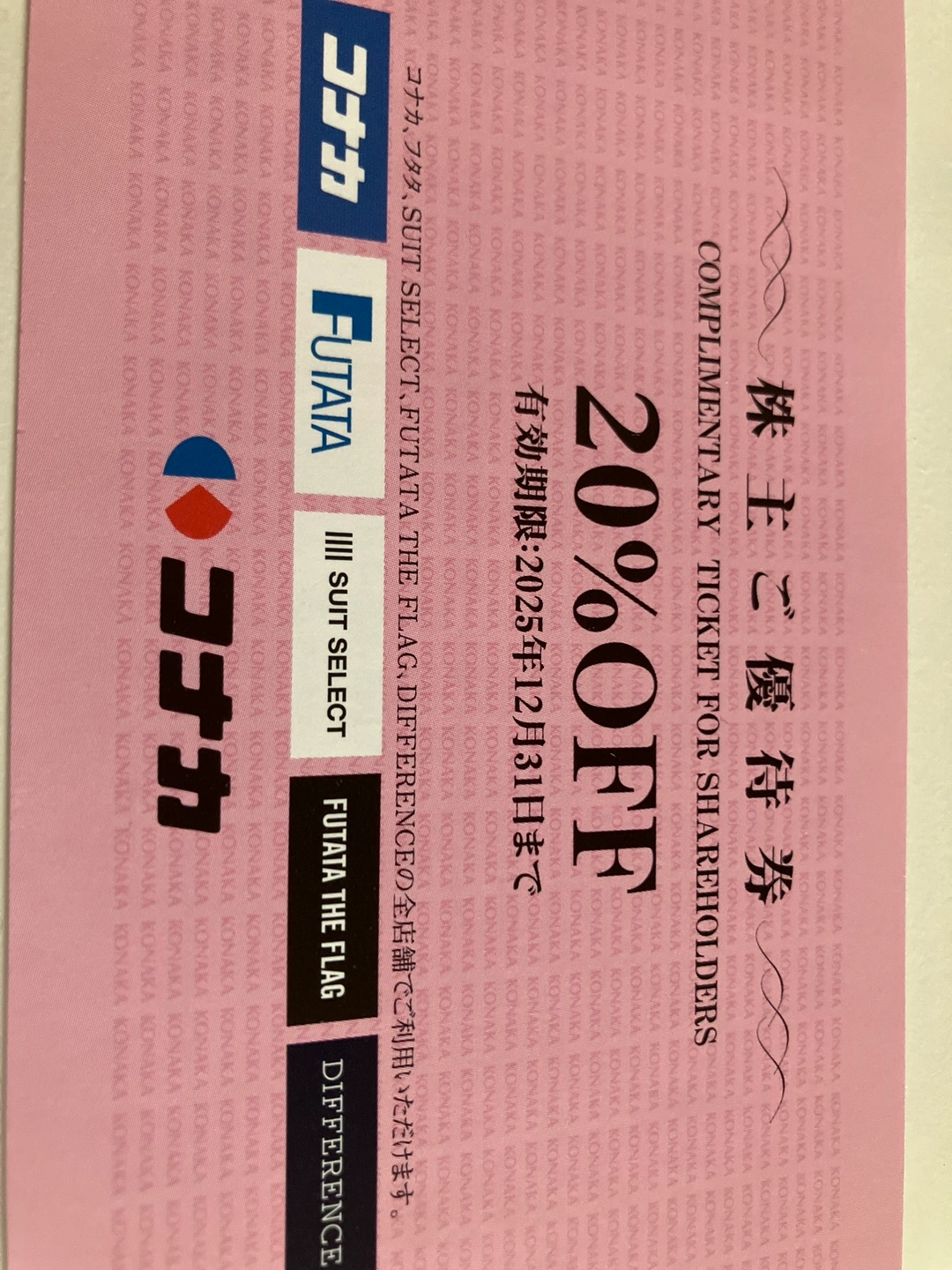 ・コナカ、フタタ株主優待券 ・20%OFF ・有効期限:2025年12月31日まで 2枚あります。 1枚当たりの価格になります。
