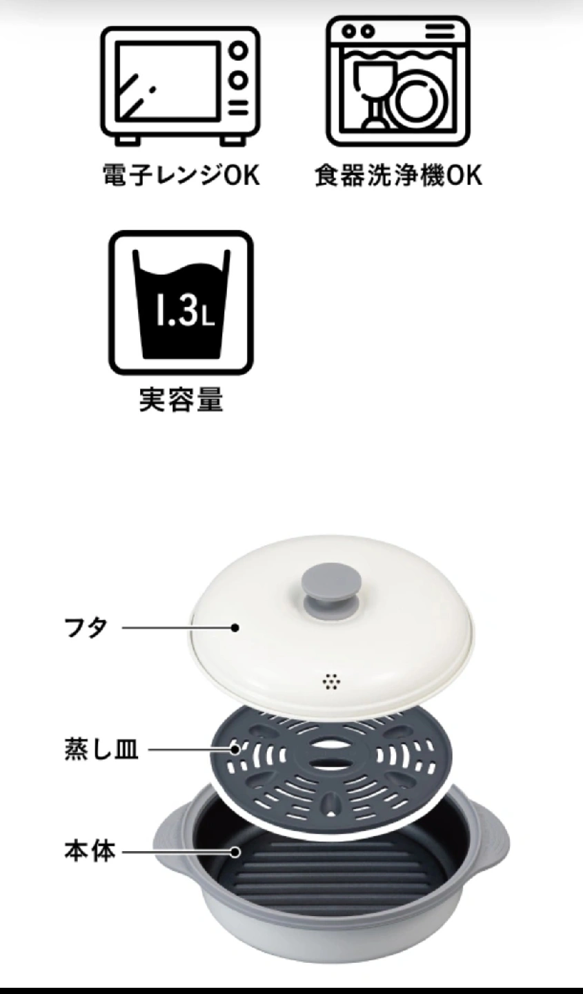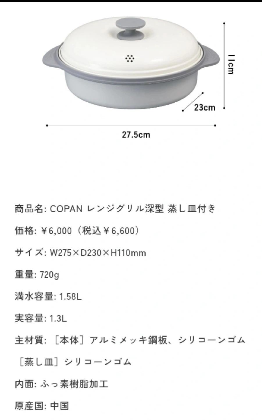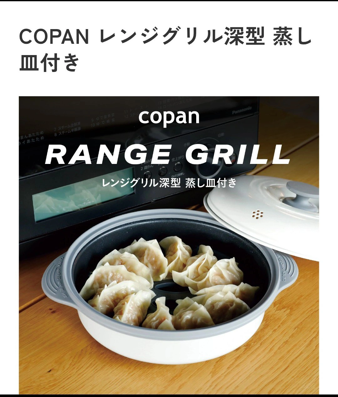 コパンのレンジグリル深型 蒸し皿付きです 【情報】 ブランド:コパン 商品名:レンジグリル深型 蒸し皿付き サイズ:W275×D230×H110mm 実容量:1.3L 【状態】 未使用品 【その他】 電子レンジ、食洗機OK 定価は6,600円でした。