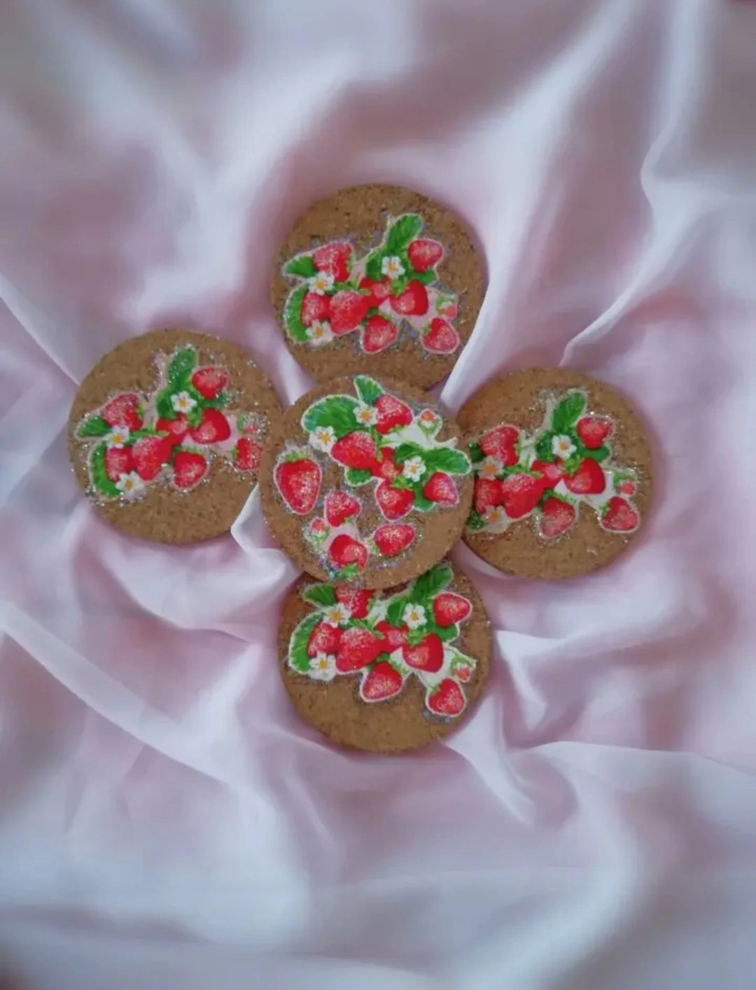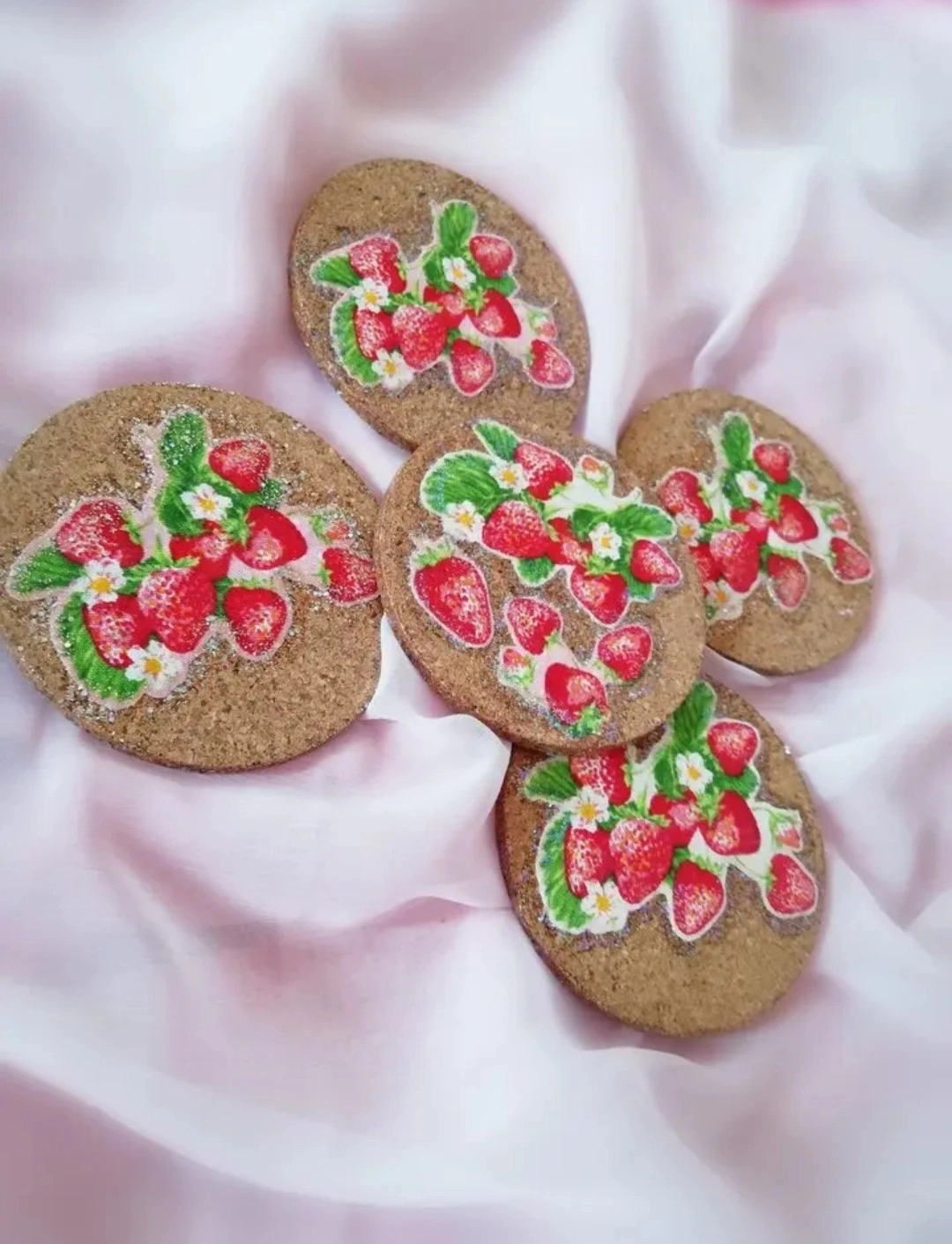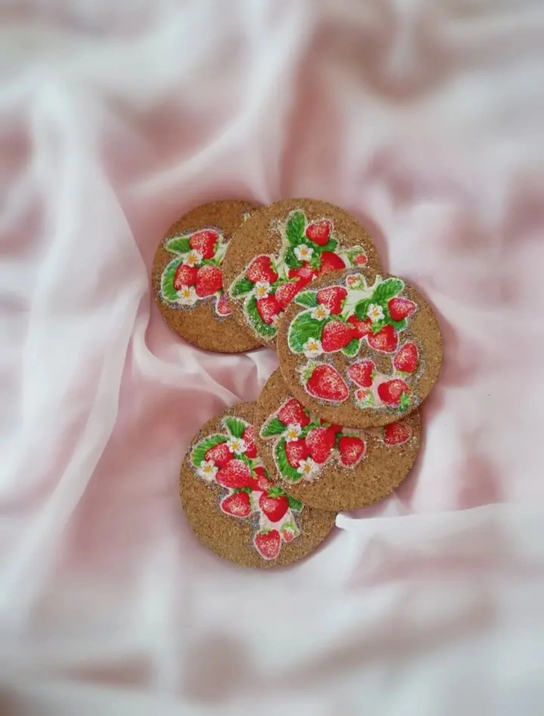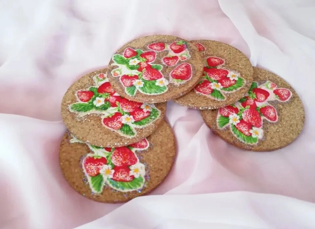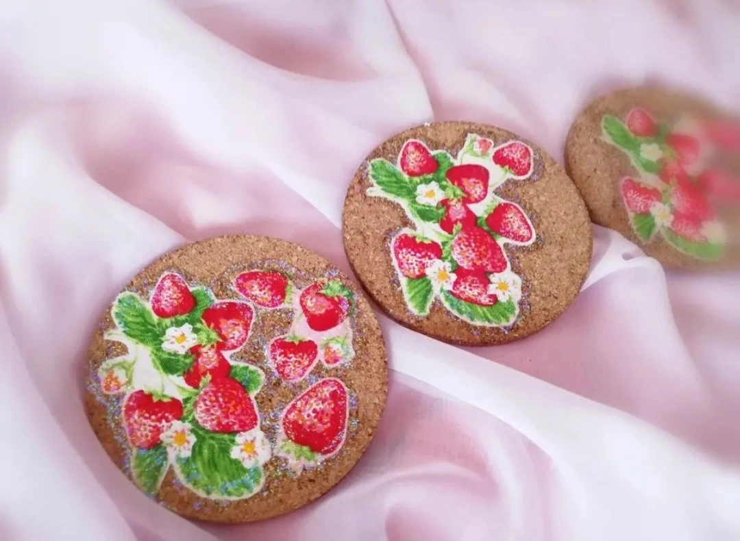 木からなるコルクから実りを願い、かわいいイチゴの模様をのせました。 実は、実りを意味するので願いが叶うよう願掛けしながら作りました。 木の素材は成長を意味します。 何か願いが合った場合、何気にこれを見ながらコースターとしてお使いください。 見た目にも可愛らしく作ったので気分も華やぐと思います。✨🍓✨ また、普段何でもない日常の中でこうしたものを使うことで何か特別感を感じたり、新鮮な気持ちになったりします。 私も自分で作った別のかわいいお気に入りのコースターを使っていますが、気分が上がります⤴✨ そうしたちょっとのことでも日常気分が上がれば波動も上がりますよね。何気ないものにもさり気なくかわいいものや特別感を感じさせる物を使うのはとても大切にだと思います。 心も豊かになれば、内面が魅力的になることにも繋がると思いますし。 ちょっと気分を上げて⤴波動を上げてみませんか?(*´ω`*) 他のサービスにも出品しているので突如として削除することもございますm(_ _)m