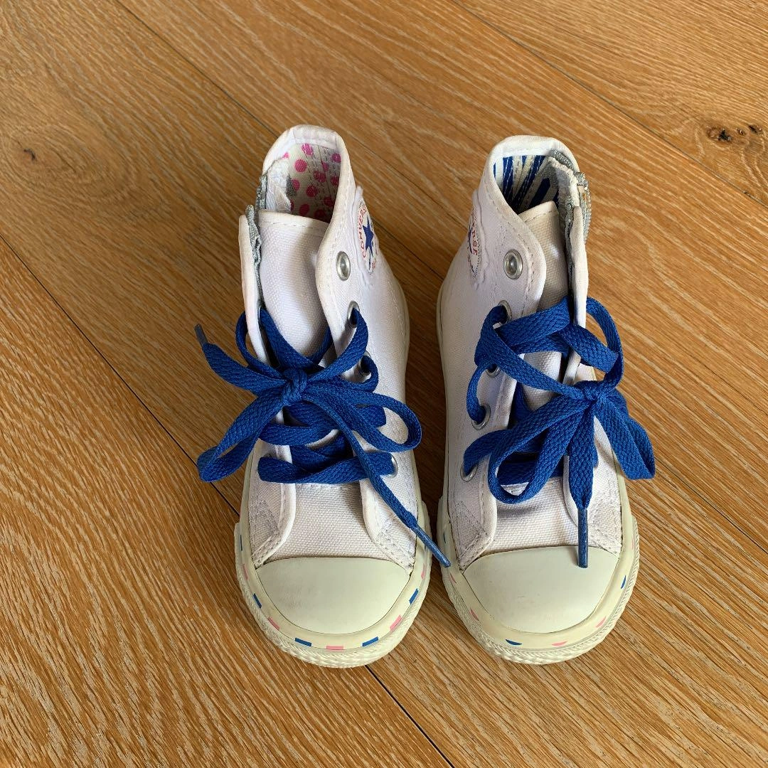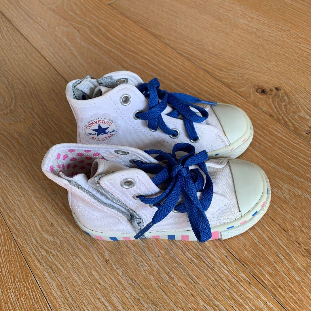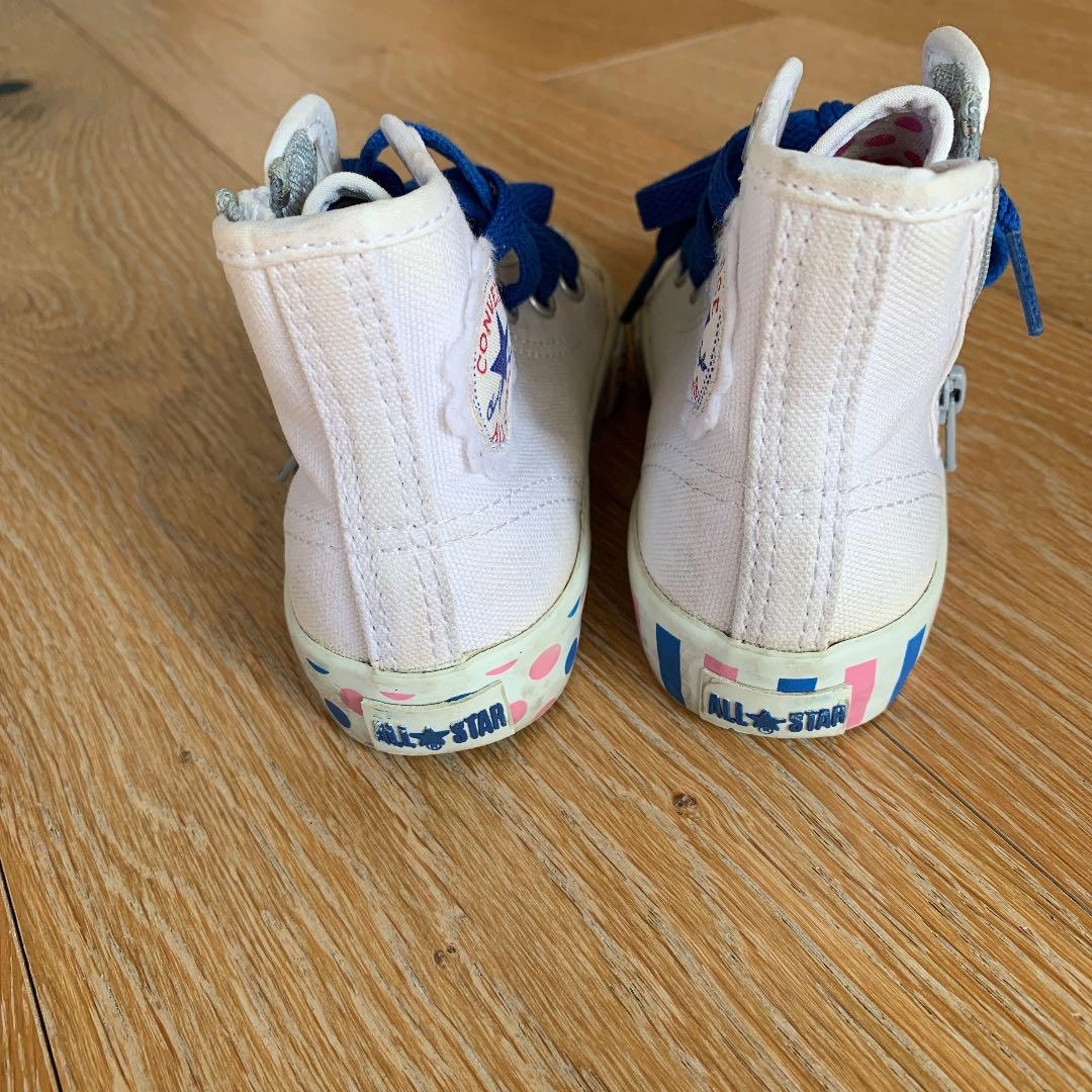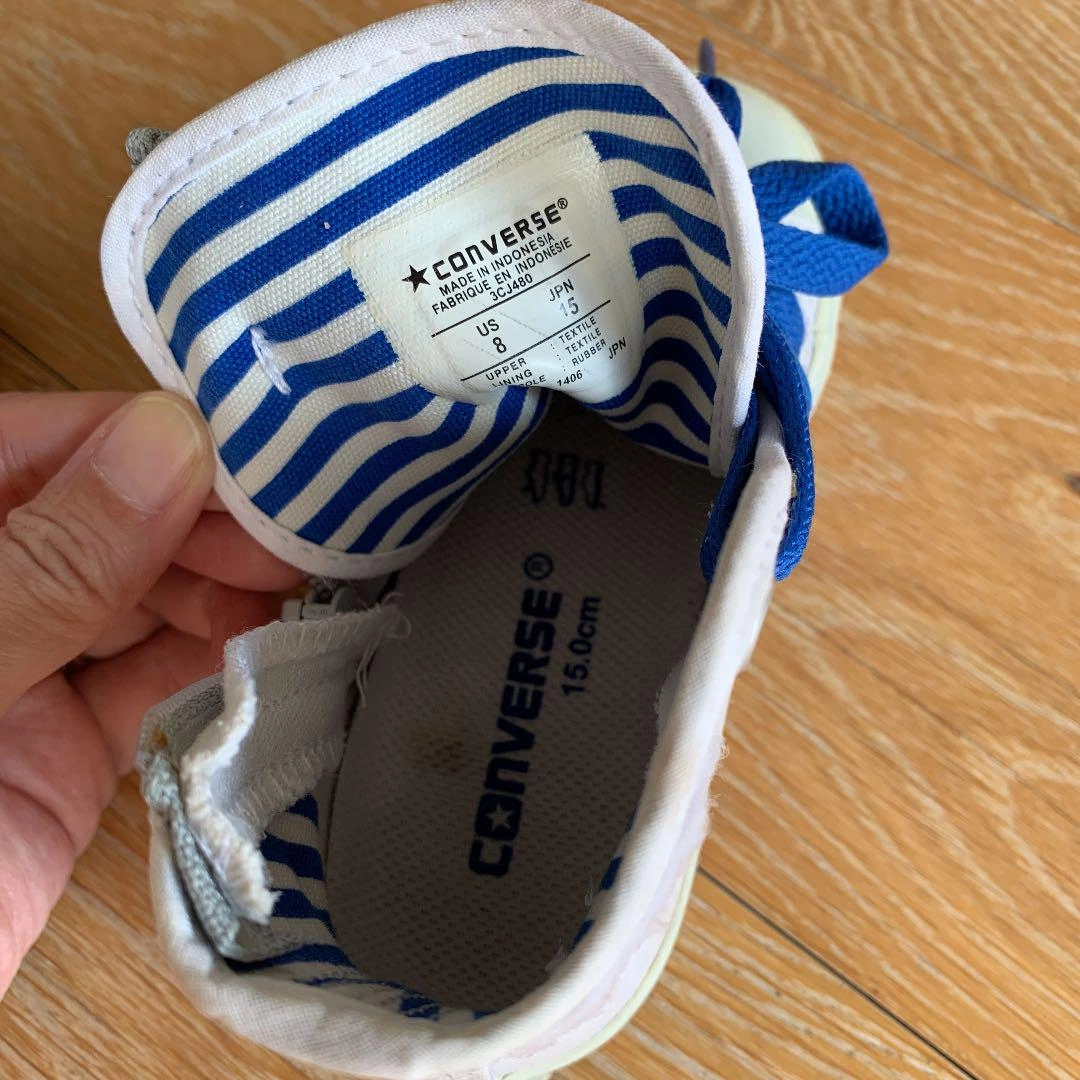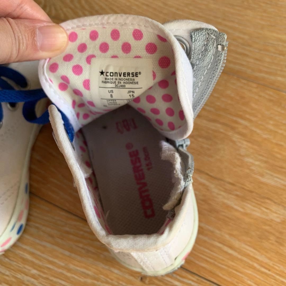 コンバース オールスター 子供用のハイカットのスニーカー、15cmです。 お下がりでもらったものですが結局履かず、保管していました。 中の柄がそれぞれ違ったり、横のラバーの部分がドットだったりと可愛らしいです。 横にファスナーが付いているので着脱はしやすいと思います。 季節感···春、夏、秋、冬 履き口···面ファスナー スニーカー型···ハイカット 素材···キャンバス カラー···ホワイト 柄・デザイン···無地 ご希望の方はお気軽にご連絡ください。