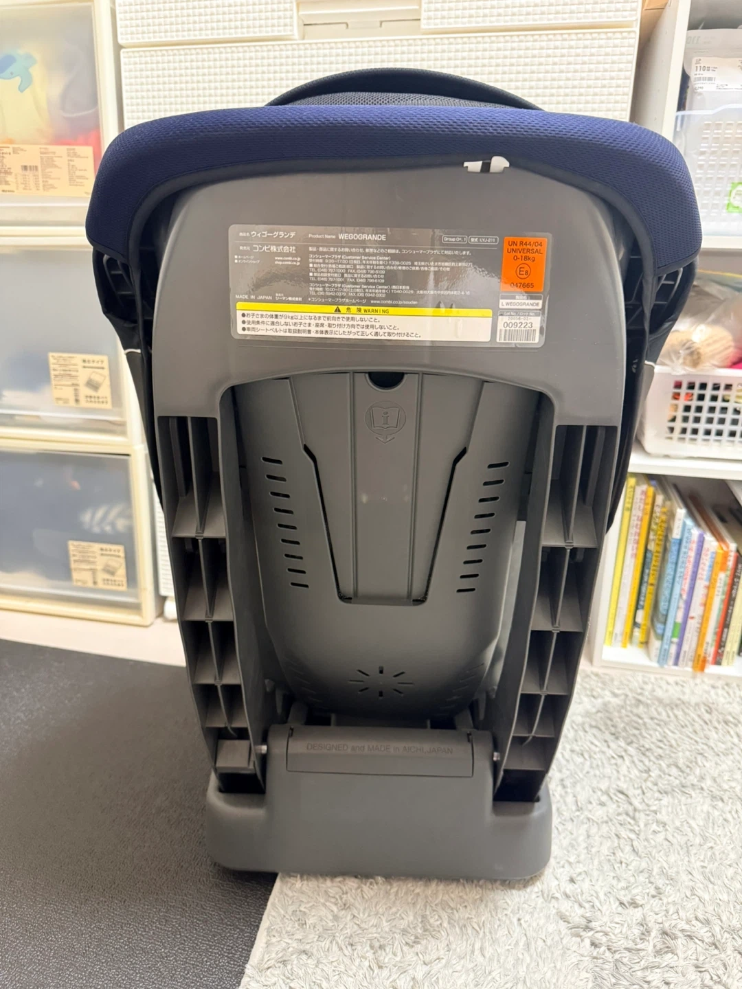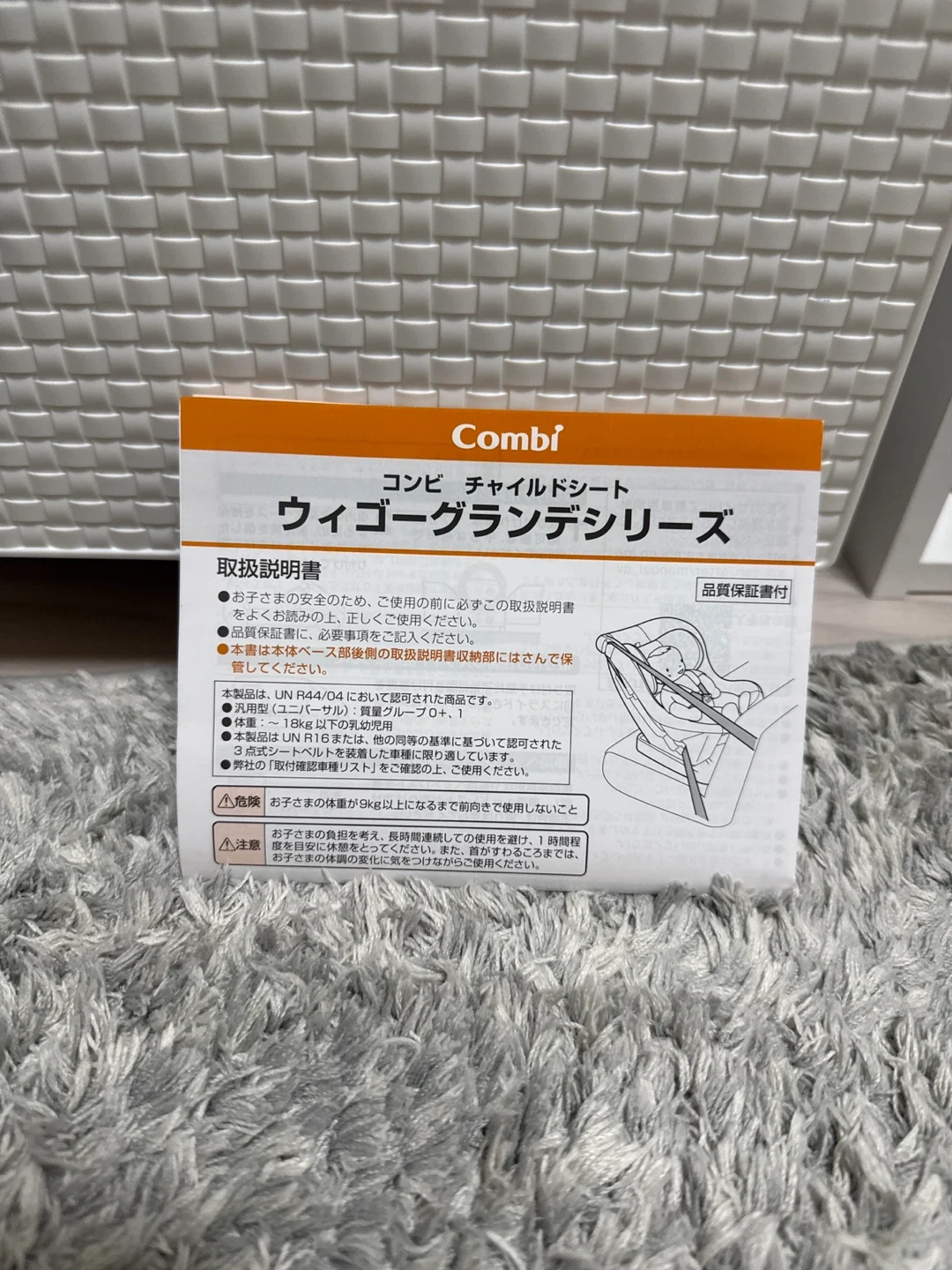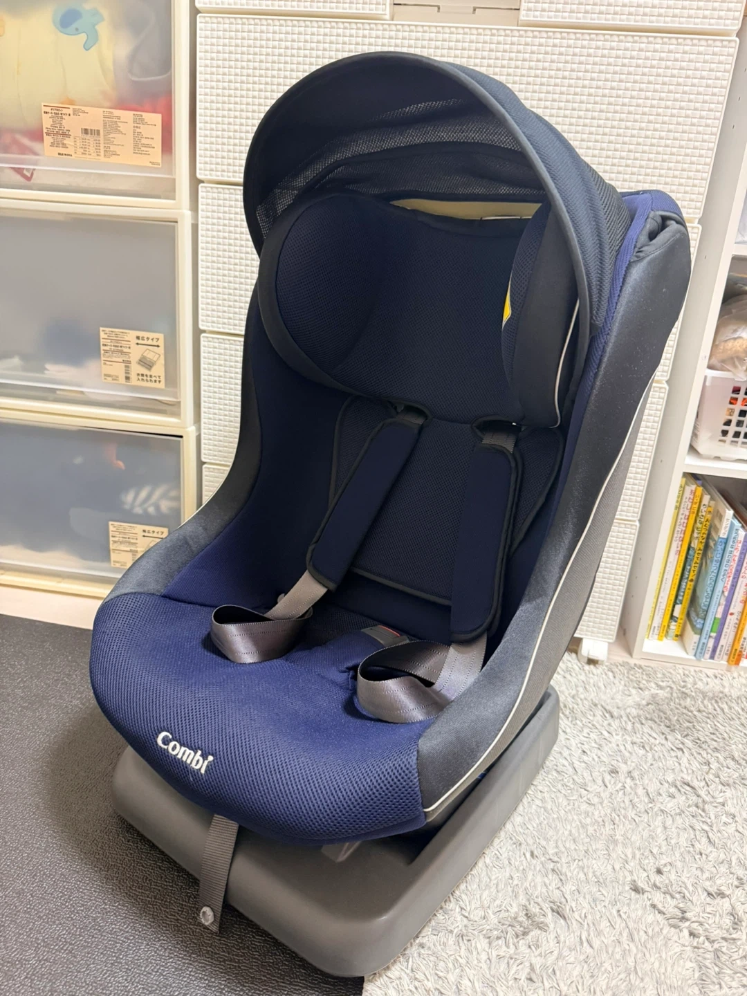 コンビのチャイルドシートです 製品名: ウィゴーグランデ サイドプロテクション エッグショック DK 製品URL: https://www.combi.co.jp/store/endcarseat/wego/g/g117602/?srsltid=AfmBOoqQS5h3O15ASczpsXOg-Wvy3Y0PLCWRgX62d4MPBB_81OlBR6Za レンタカー利用時にのみ使用しておりました。 トータルで10回程度しか利用しておらず、また子供を本商品に乗せているとき、お漏らしもしたことがないので、清潔感を保てていると思います。 車特有の匂いがついてる程度です。 ・色:ネイビー ・使用感少なめ ・全体的にきれい ・説明書有り 写真6枚目は、お子さんの体重が7kg未満の時に使用する付属のインナークッションになりますが、こちらは未使用になります。 製品ホームページによると、適応は「新生児〜4歳頃(適応体重18kg以下)」と記載がありますが、実際使用すると3歳ぐらいが最大にも思えます。 中古品であることご了承ください。 破損など見られず正常に使用できますが、ご購入後は自己責任でご使用ください。