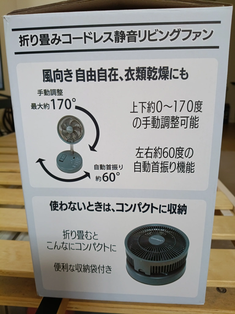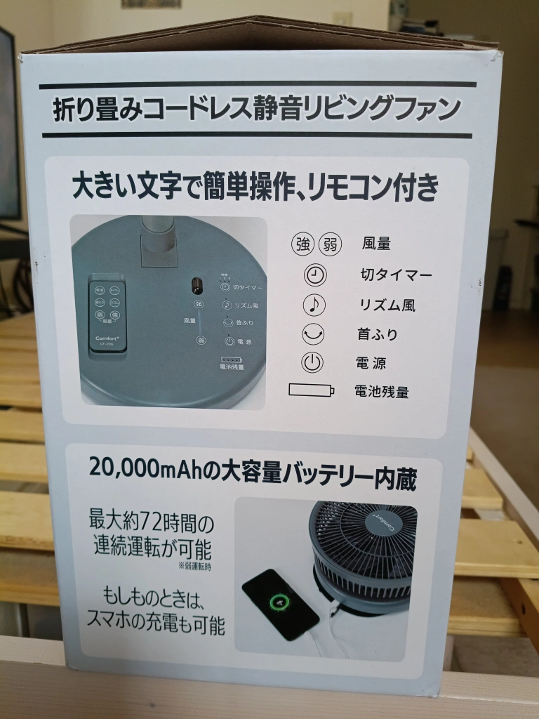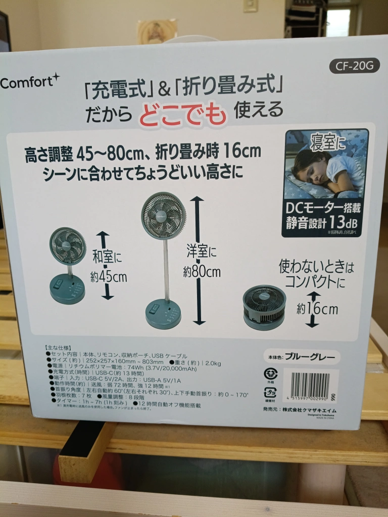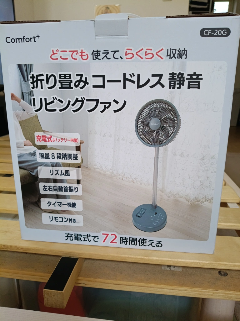 コンフォートプラスのリビングファンです 【情報】 ブランド:コンフォートプラス 型番:CF-20G タイプ:折り畳みコードレス静音リビングファン 高さ調整:45〜80cm(折り畳み時16cm) 色:ブルーグレー 電源:充電式(バッテリー内蔵) バッテリー容量:20,000mAh 【機能】 風量8段階調整 リズム風 左右自動首振り タイマー機能 リモコン付き 【状態】 未使用品 中古品であることご了承ください 2度程使用しました。一度お譲りした所、充電がされないと返却されましたが、きちんと充電が出来ます。