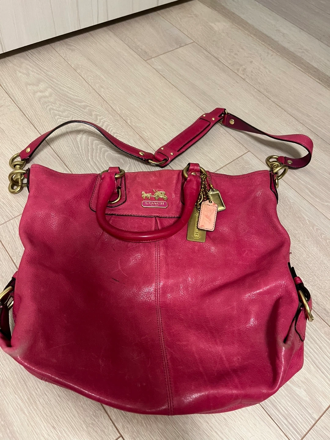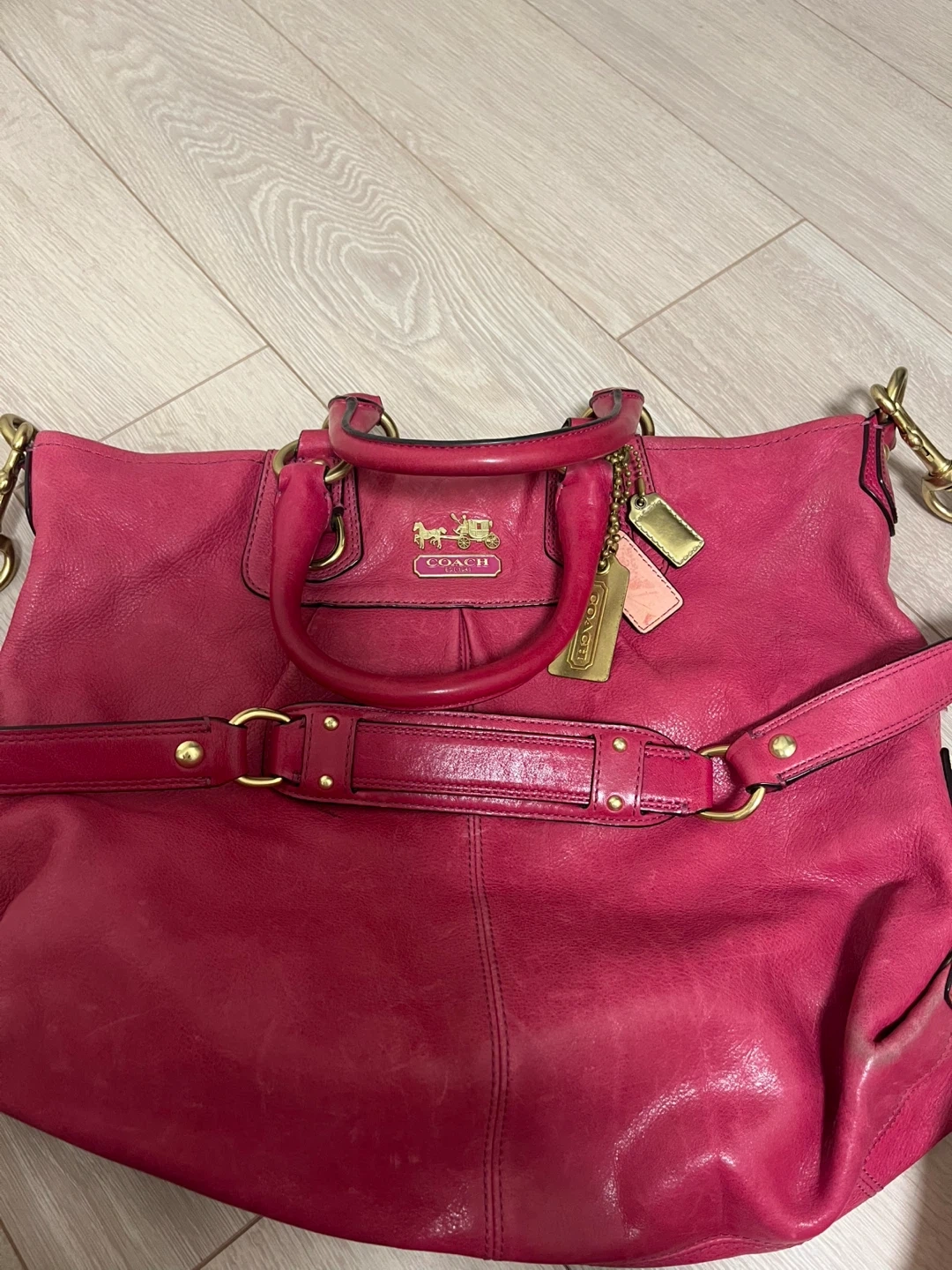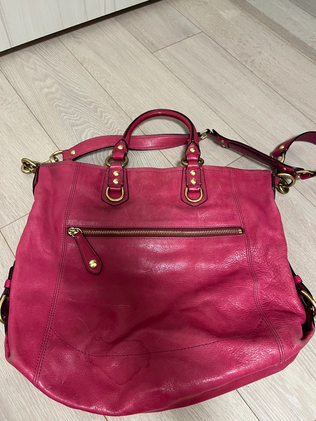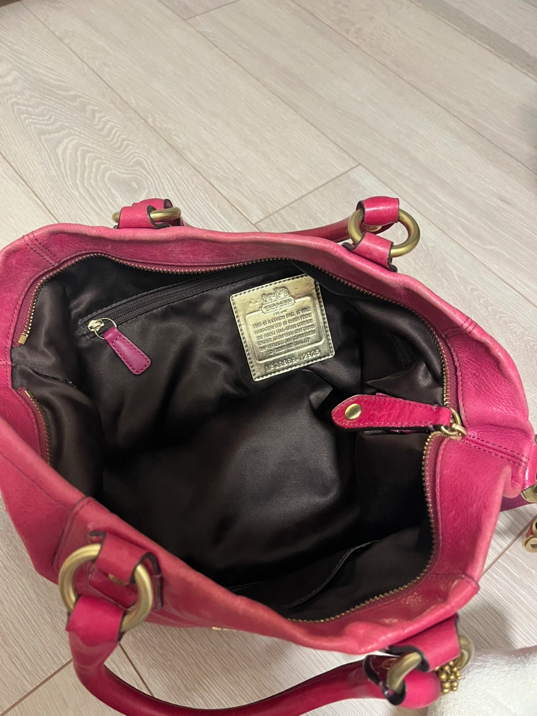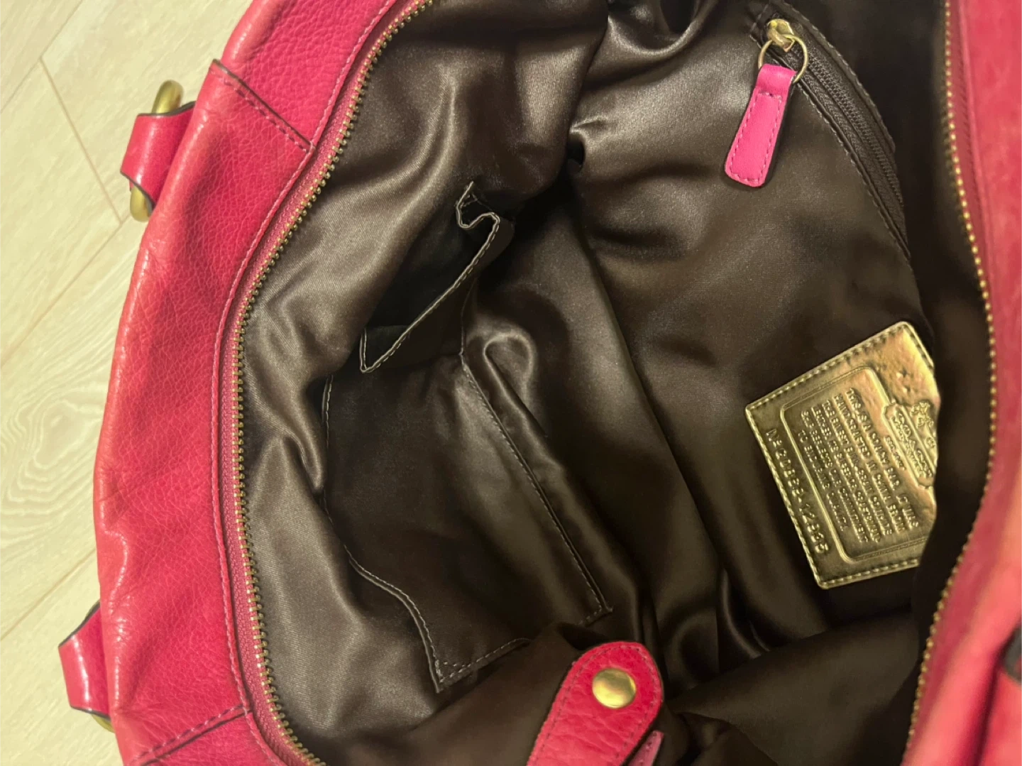 コーチのハンドバッグです。 ・カラー:ピンク ・素材:レザー ・使用感あり ・全体的に擦れ、キズあり ・内側にシリアルナンバーあり(A1220-F19626) 中古品であることご了承ください