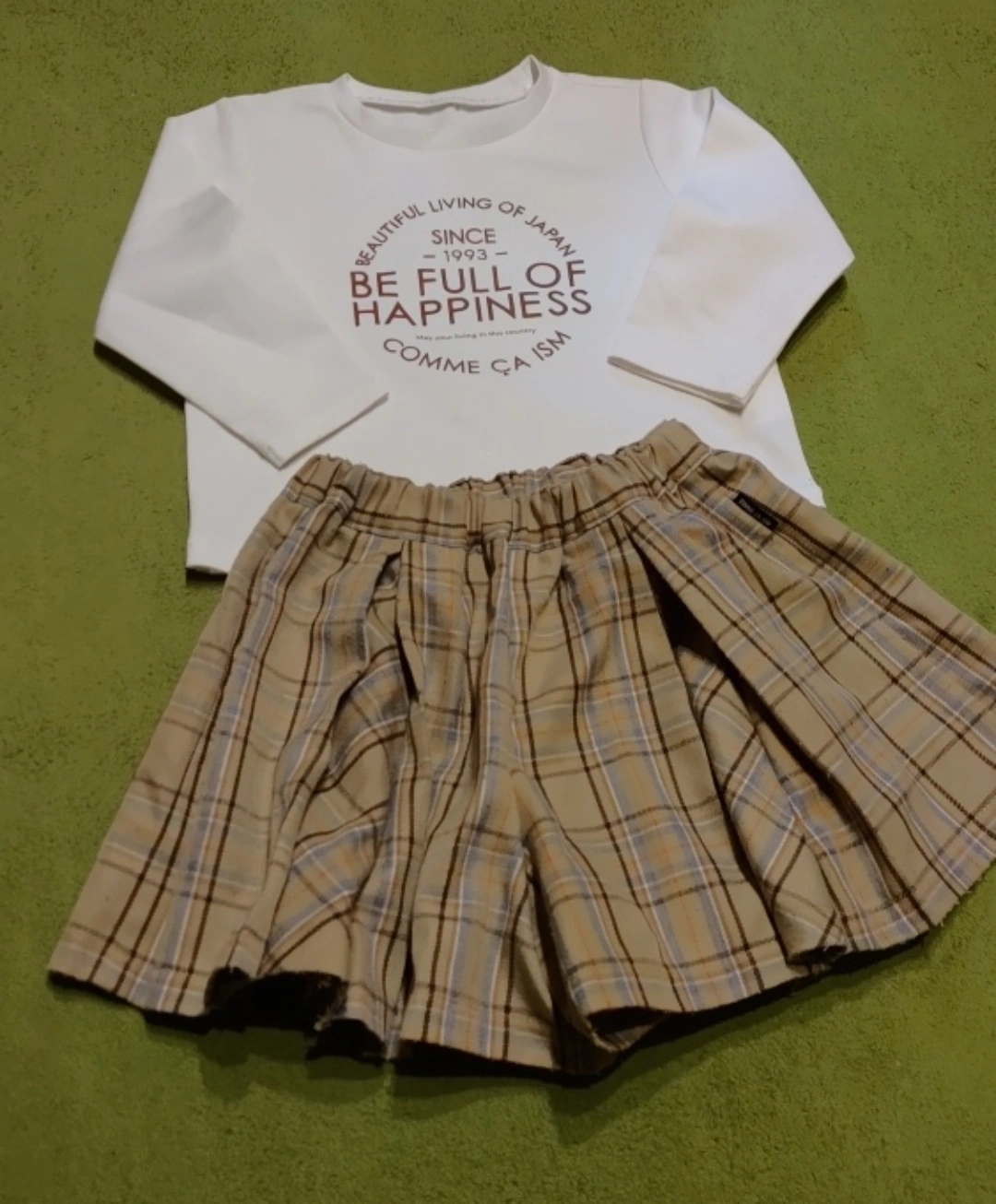 コムサイズムの中綿入りアウター 長袖シャツ チェックキュロットスカート 【情報】 ブランド:コムサイズム サイズ:90cm(身長90cm、体重13kg) 型番:23-99BA43 【状態】 一部シミあり(写真参照) 使用感あり 中古品であることご了承ください