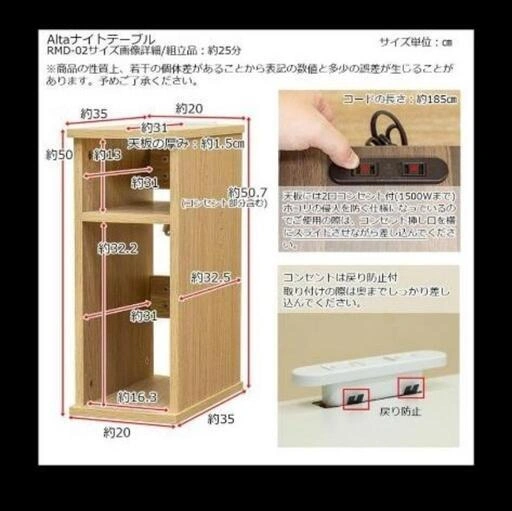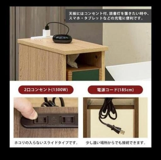 サイドテーブル、ナイトテーブルです。 オープンタイプ2段、コンセント付き。 中古品。 同じものが二台ございます。 値段は一台分です。 色は写真①のナチュラルです。 多少のスレ等はありますが、状態は良いと思います。 ご希望の方はお気軽にご連絡ください。