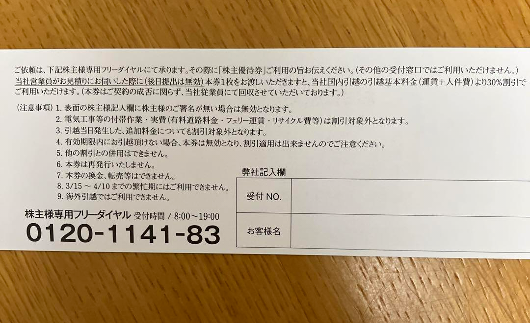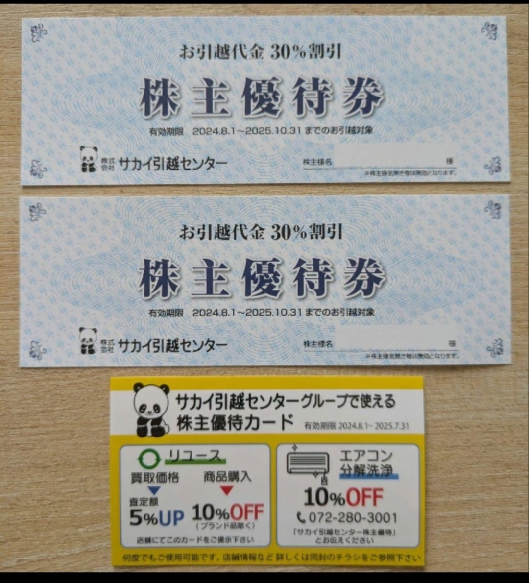 サカイ引越センターの株主優待券です。 ◯お引越し代金30%割引券×2枚 有効期限:2024年8月1日〜2025年10月31日 ◯株主優待カード×1枚 有効期限:2024年8月1日〜2025年7月31日 前回お取引いただいた方には無料で差し上げます。