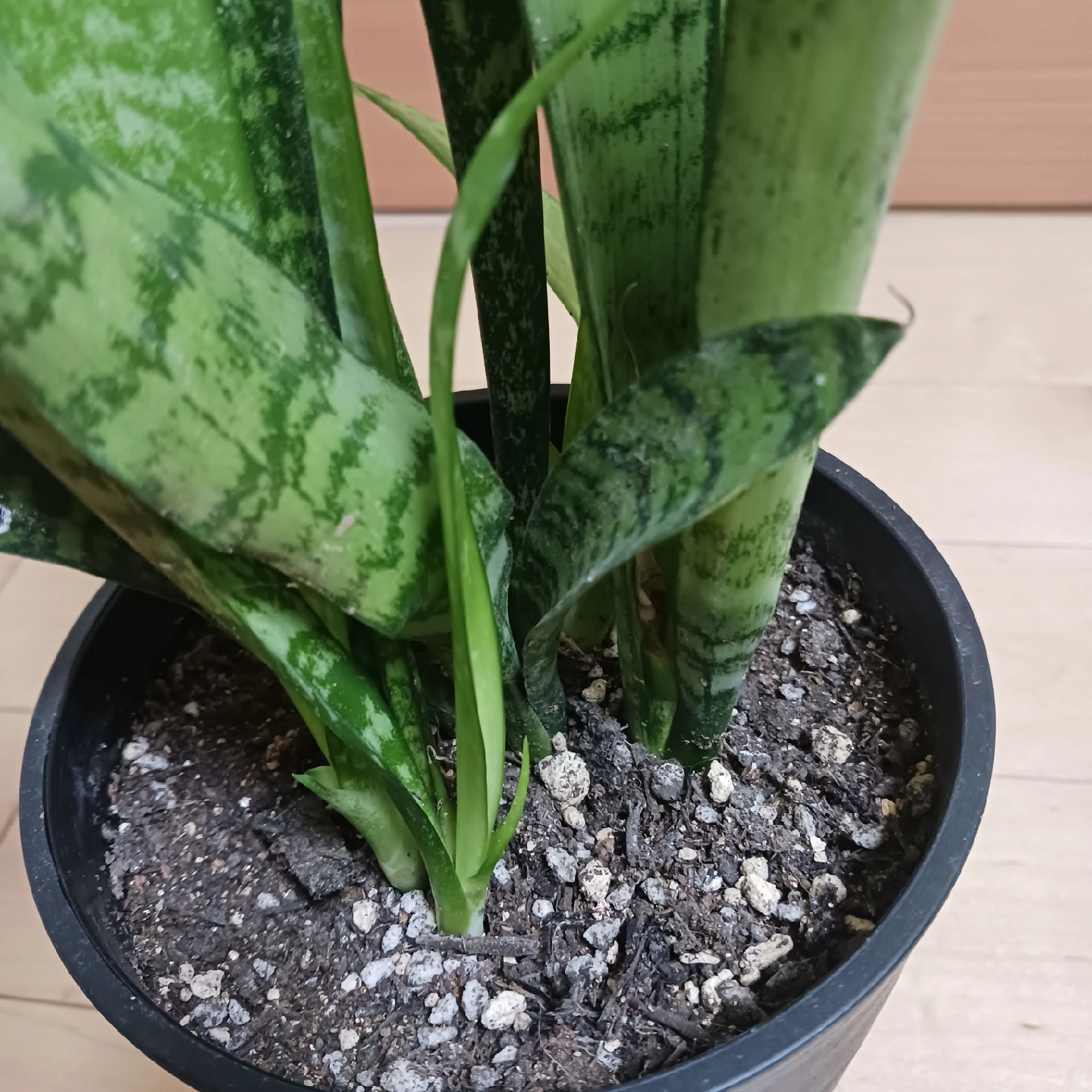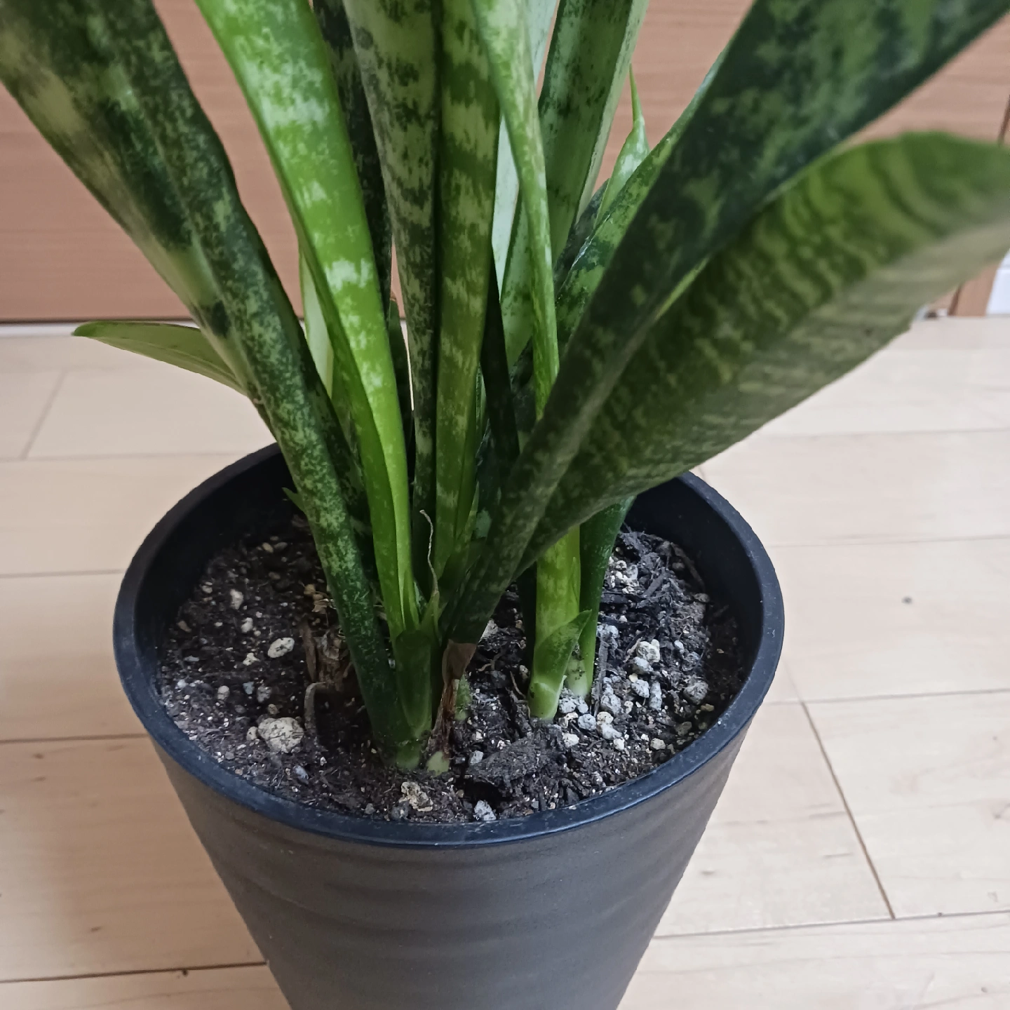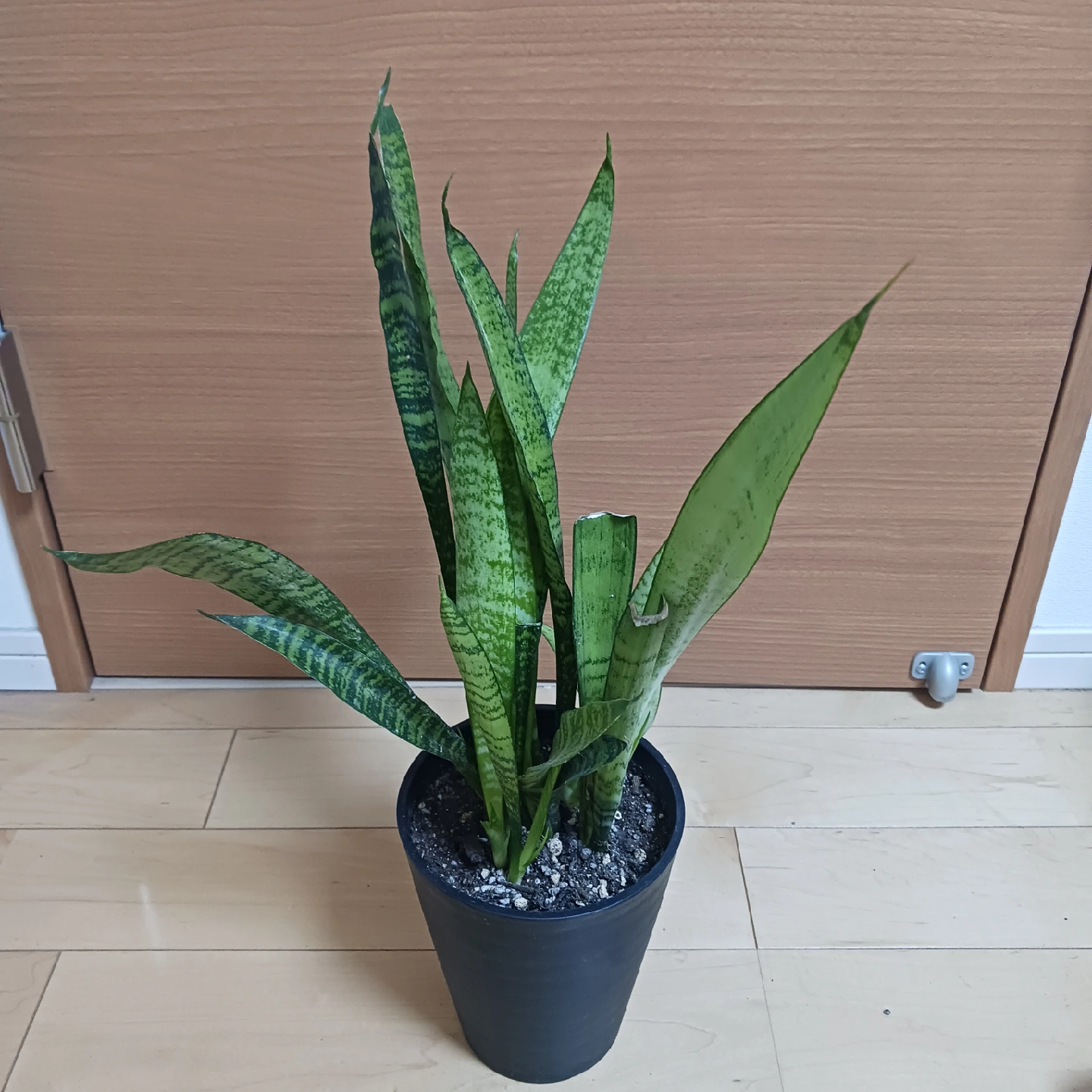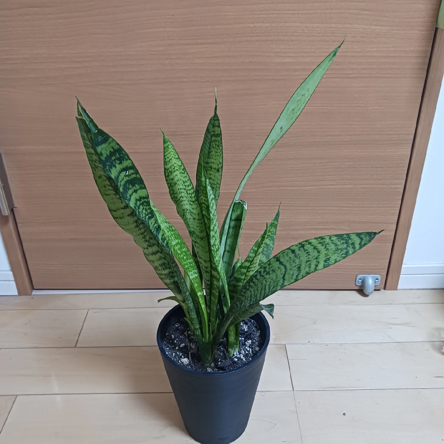 黒のプラ鉢に6株ほど植わっています。 鉢のサイズ:横幅14.5cm 高さ(深さ)17cm 植物サイズ:横幅17cm 高さ(鉢込)60cm 水受け皿はありません。 使用している土は、市販の草花用の培養土にバーミキュライトを追加したものです。 品種:サンセベリア(サンスベリア)•ゼラニカ 置き場:レースのカーテン越しなど、直射日光の当たらない明るい場所 水やり:控え目。土の中までしっかり乾いてから。表面の土が乾いているか必ず確認してから与えます。 ご希望の方はお気軽にご連絡ください。