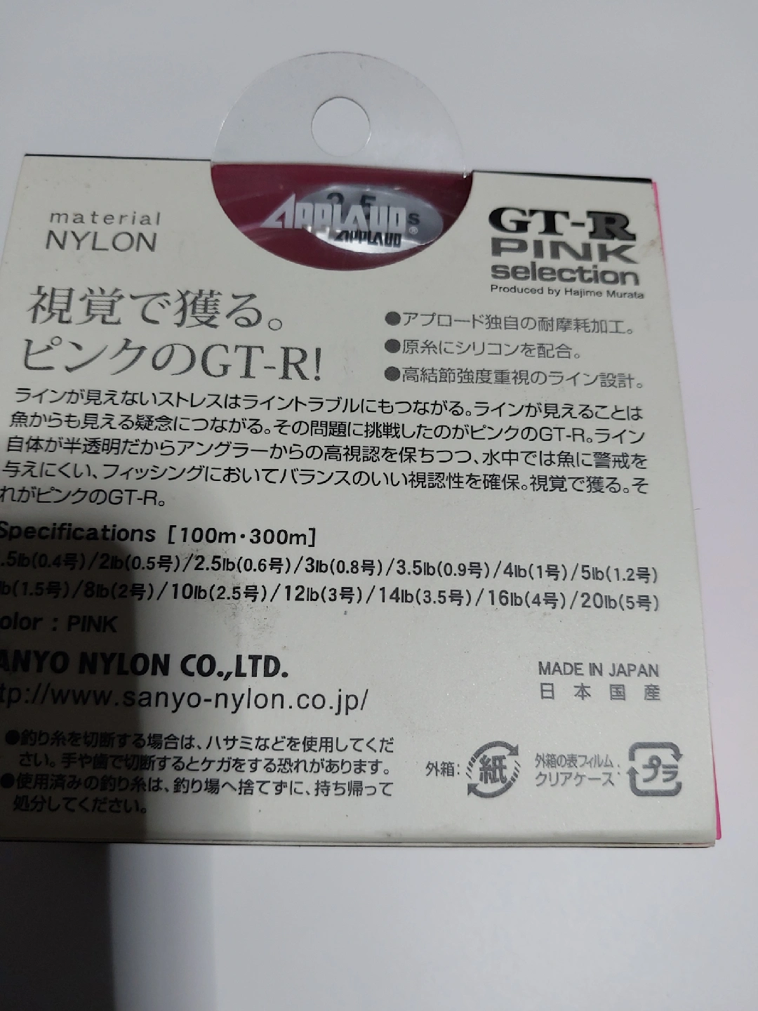 サンヨーナイロンの釣り糸です 【情報】 ブランド:サンヨーナイロン 商品名:GT-R ピンクセレクション 強度:2.5lbs(0.6号) 長さ:300m 定価:2,400円 【状態】 未使用品