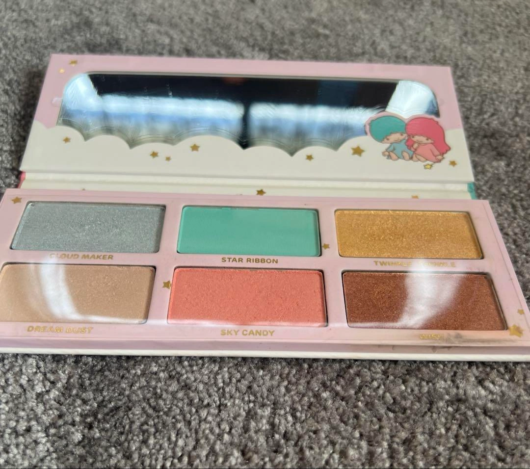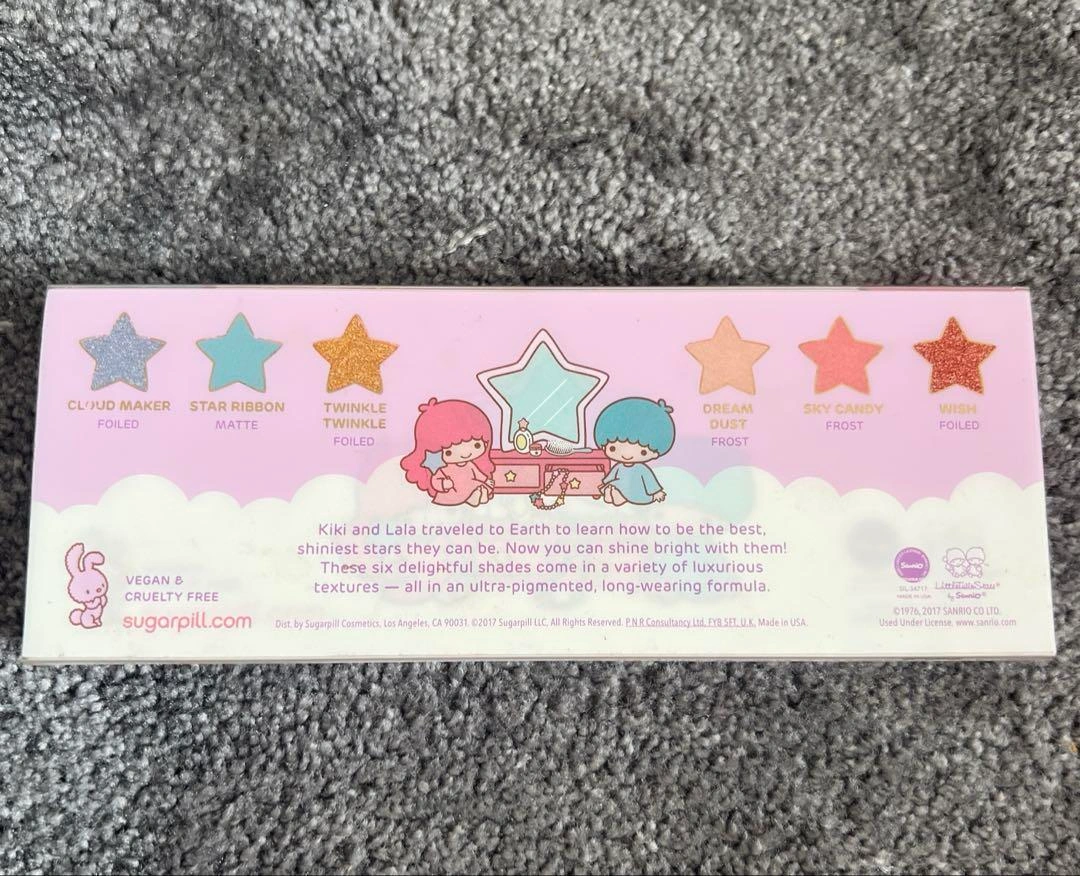アメリカのコスメブランド シュガーピル と サンリオ・キキララ の限定コラボ商品です。 アイシャドウとしてはもちろん、色によってはチークやハイライトとしてもお使いいただけます。 ※お子様用ではございません。 カラー内容 •シマー:ブルーシルバー •マット:キキブルー •シマー:イエローゴールド •シマー:ベージュ •シマー:ララピンク •シマー:コッパーブラウン 個人輸入品のため、日本国内では非常に入手困難な希少アイテムです。 パレットは厚紙製のため、汚れがございます。あらかじめご了承ください。 ご希望の方はお気軽にご連絡ください。