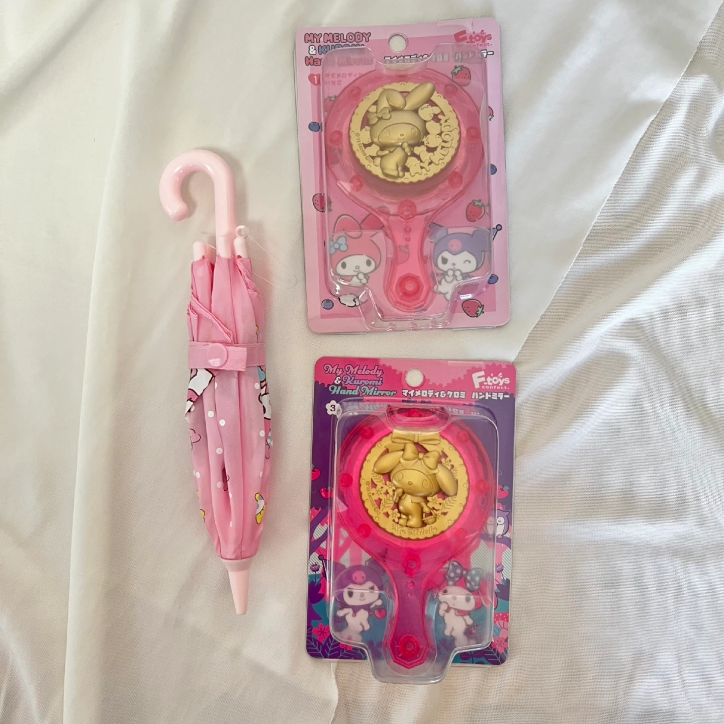 ・マイメロディ、クロミ ・ハンドミラー 2点 ・傘 1点 ・F.toys サンリオのマイメログッズ3点セット ぬいぐるみ用、ディスプレイ用の小型の傘 手鏡 ハンドミラー 2種類 ※お菓子はついていません。 傘はしばらく保管していたため折り跡がついています。 新品未使用 自宅保管のため、神経質な方の購入はご遠慮ください。