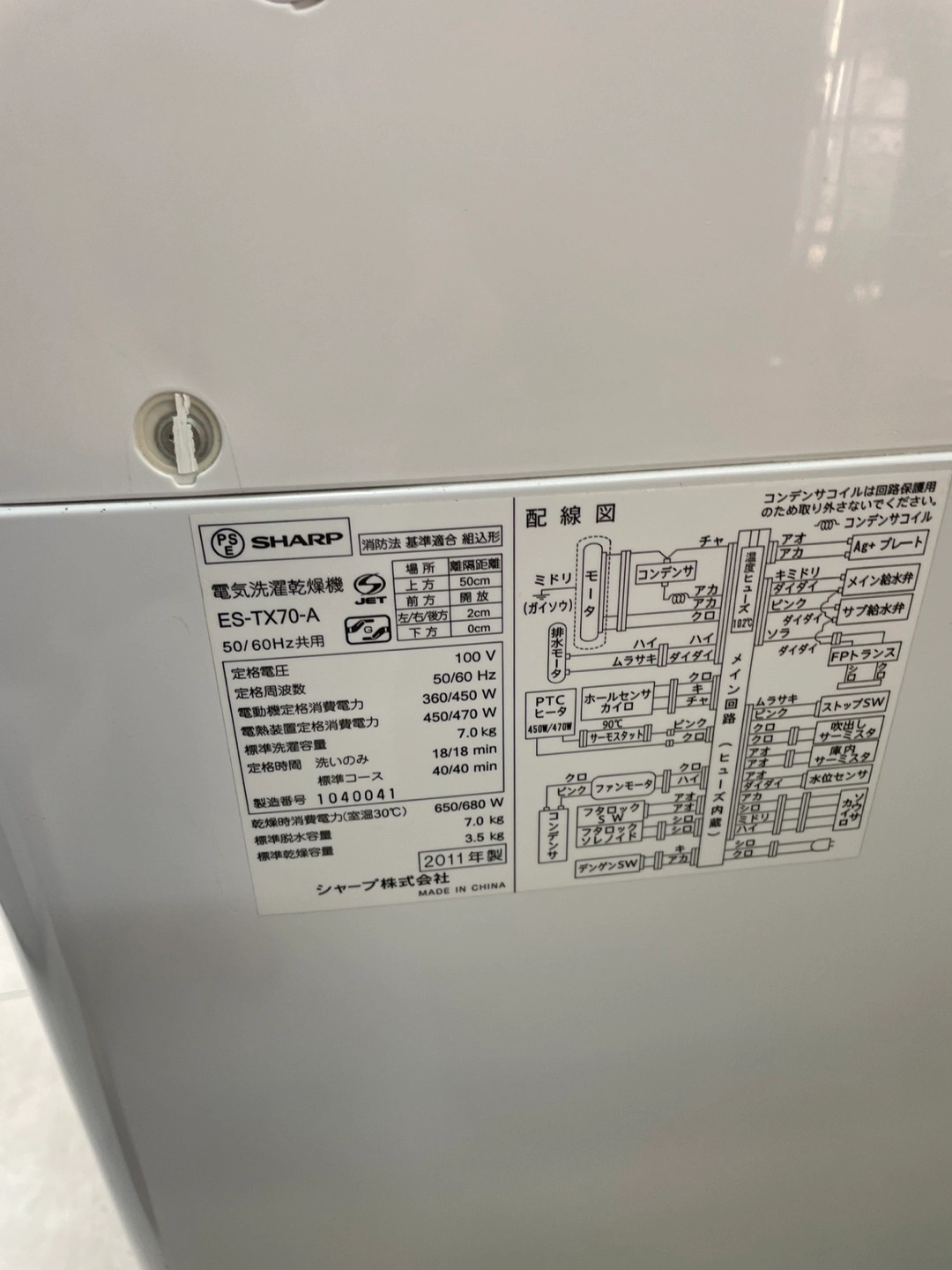 あたたかさ【情報】 ブランド:シャープ 型番:ES-TX70-A 標準洗濯容量:7.0kg 乾燥容量:3.5kg 配達: 有料で配達もできます。