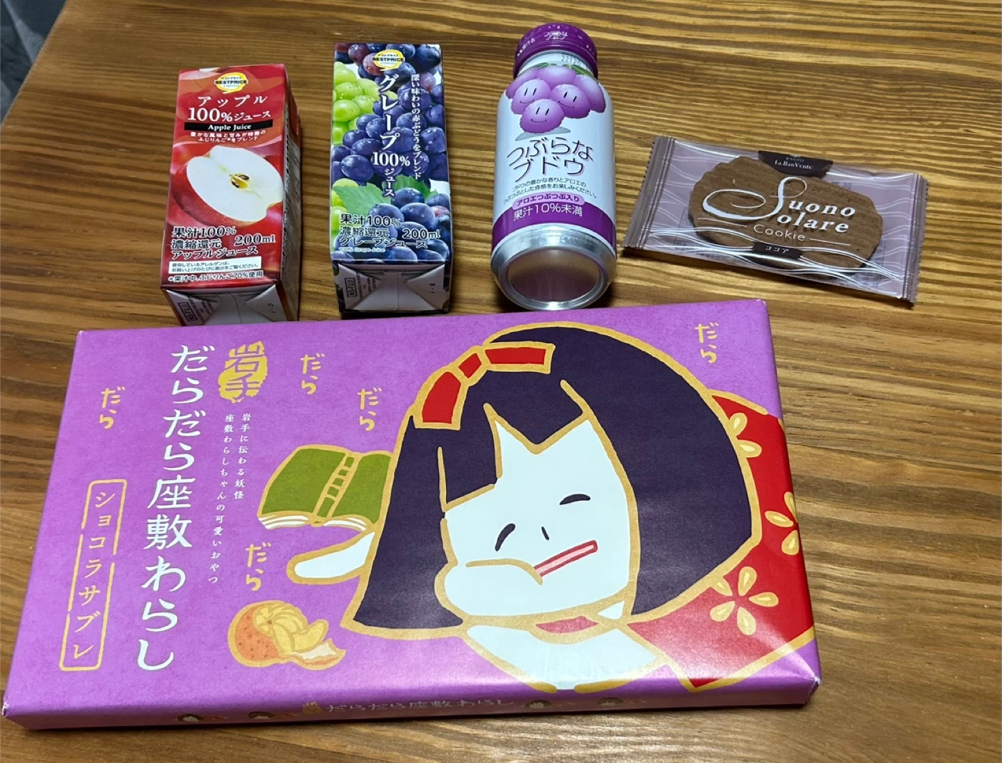 岩手 だらだら座敷わらし ショコラサブレ 12個 賞味期限 2026.01.15 京都 ラパンヴェント ココアクッキー 賞味期限 2025.12.27 つぶらなぶどう アロエ入り 賞味期限2026.3 アップル100%ジュース 賞味期限 2026.1.11 グレープ100%ジュース 賞味期限 2026.4.24 受け渡しは京王線沿線希望ですが、仕事の日程によって別路線を利用することがあるので、日程によっては中央線や他の路線なども可能なこともあるのでコメントからご相談下さい