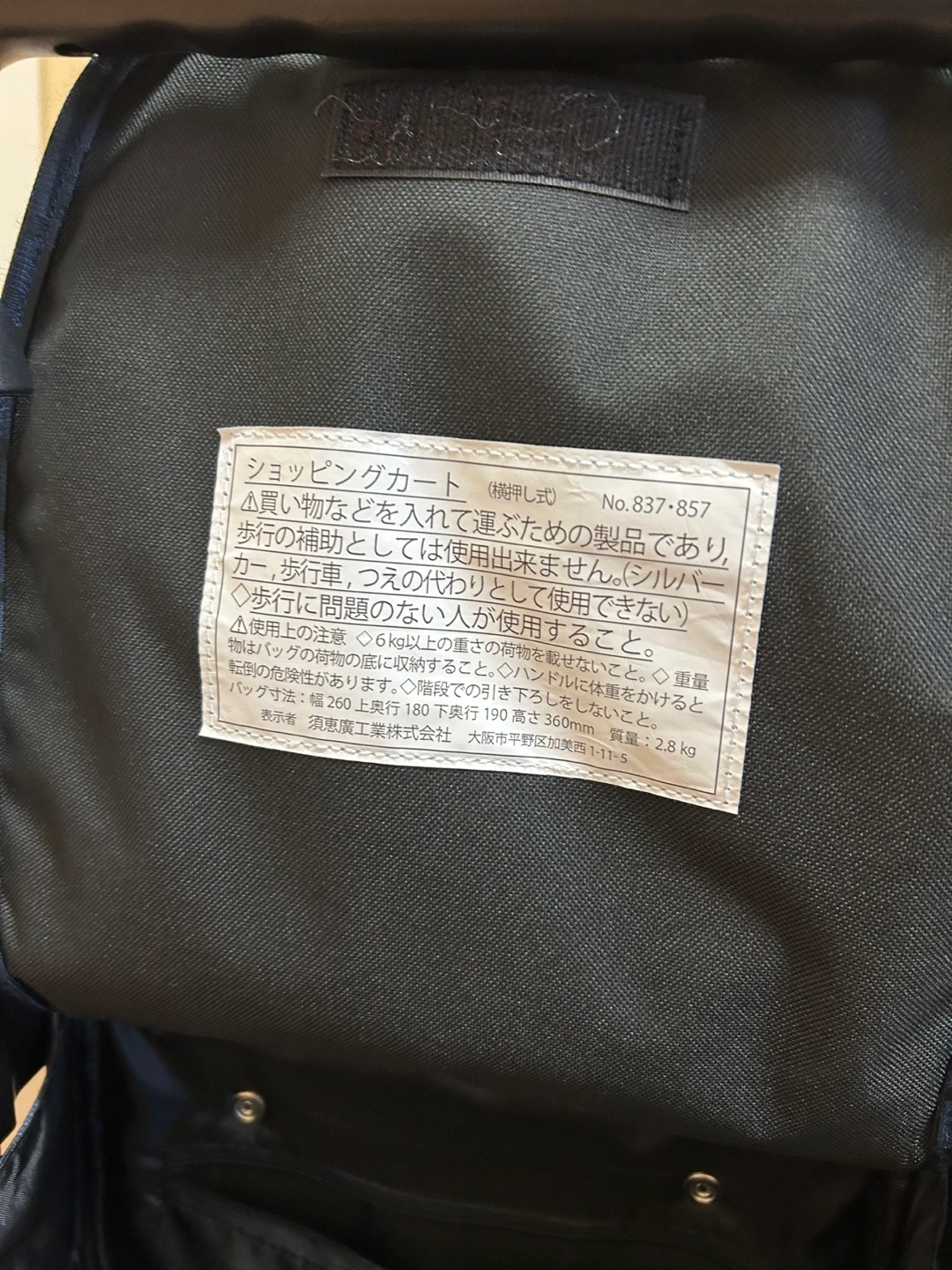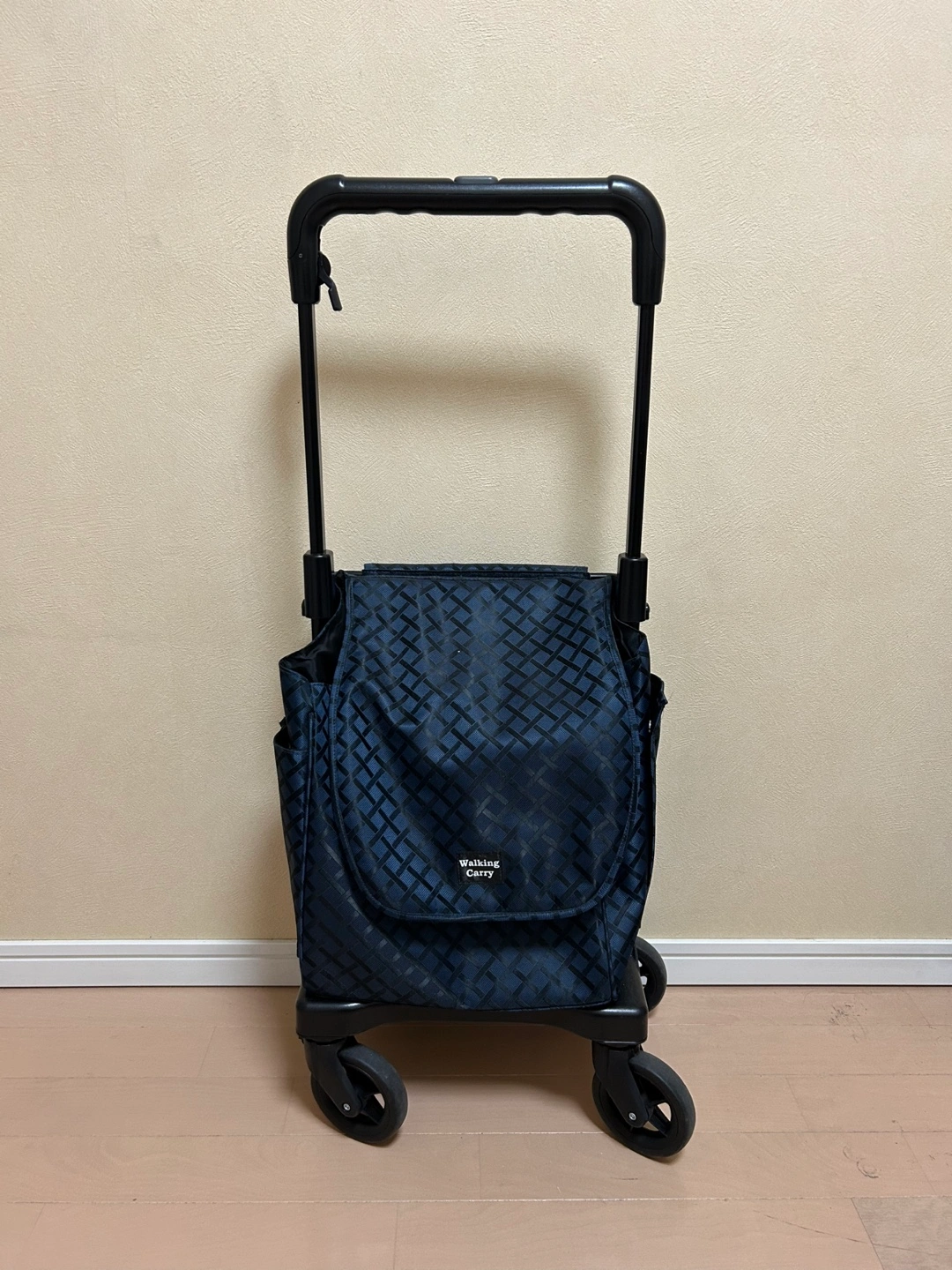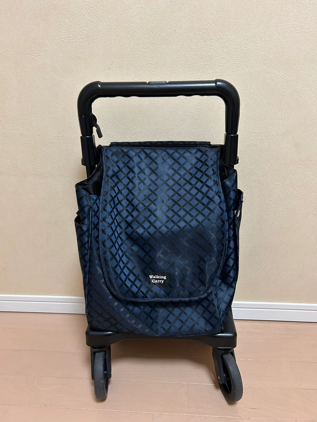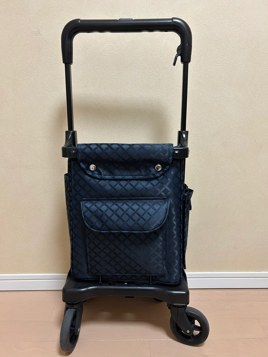 横押し式のショッピングカートです。 とてもしっかりした作りですし、おしゃれな感じだと思います。 日常のお買い物でしたら充分に入り便利です。お米5キロ余裕で入れられます。 バックのサイズと注意事項は10枚目の写真に書いてあります。 高さは 一番高くして(写真1枚目)車輪下から取手まで、約86センチ 一番低くして(写真2枚目)車輪下から取手まで、約65センチ カバンの下の枠が約33×22センチくらいです。 車輪4輪とも360度回転します。 手元に車輪を固定するレバーがあるので、坂などで置いておきたいときにロックできて便利です。 サイドにポケットがあり水筒など入れられます。 外の裏側に大きめポケットあり 中にもジッパー付きの内ポケットあり 見た目も綺麗で大きな傷などありません。 お気軽にお問い合わせくださいね。