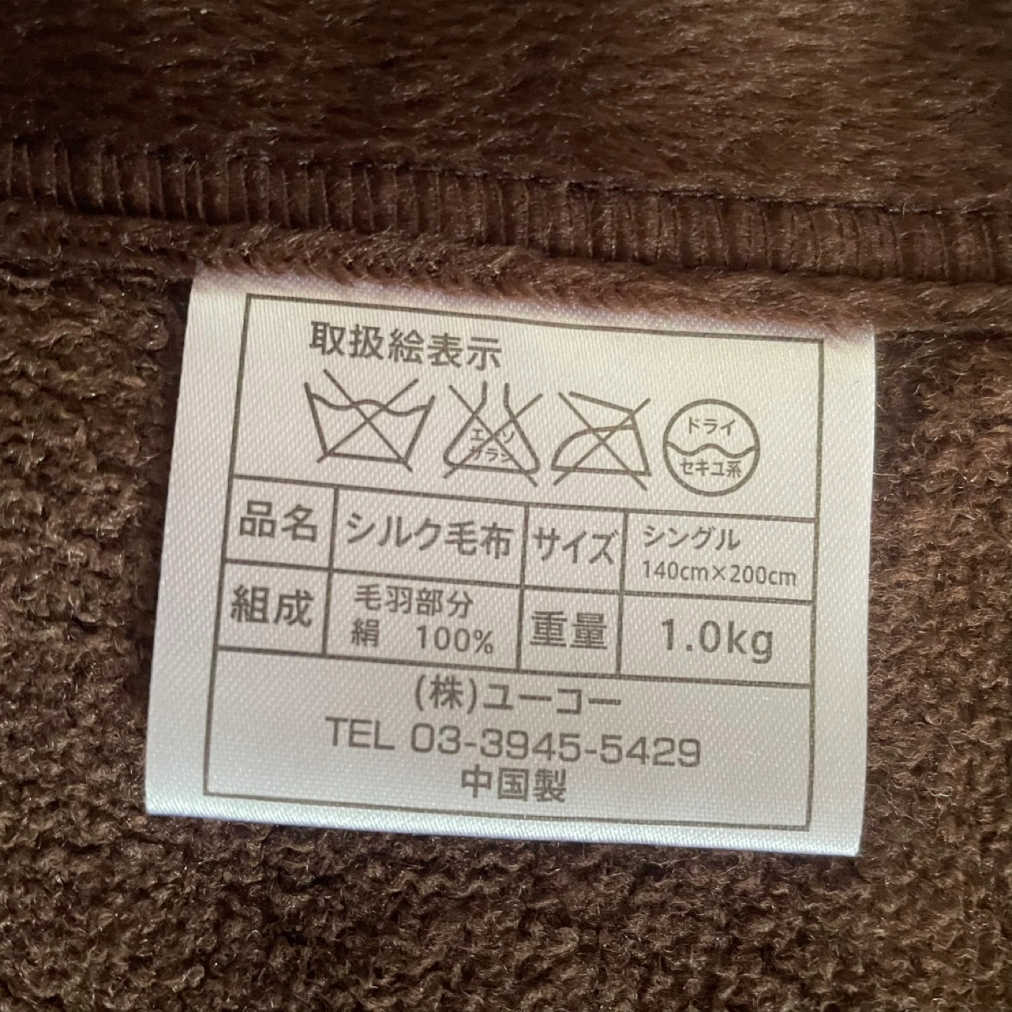 ・カラー:ブラウン系 ・サイズ:シングル(140cm×200cm) ・重量:1.0kg ・素材:毛羽部分 絹100% サイズは布団のシングルサイズですが、毛足が短いので、畳むと通常の毛布よりも7割程の大きさになります。 その為、保管の際場所を取りませんので、予備、車、アウトドア(キャンプ等)防災グッズにお使い頂けるかと思います。 待ち合わせ場所は三鷹、吉祥寺、西荻窪、武蔵関、上石神井、東伏見、大泉学園辺りでお願いします。