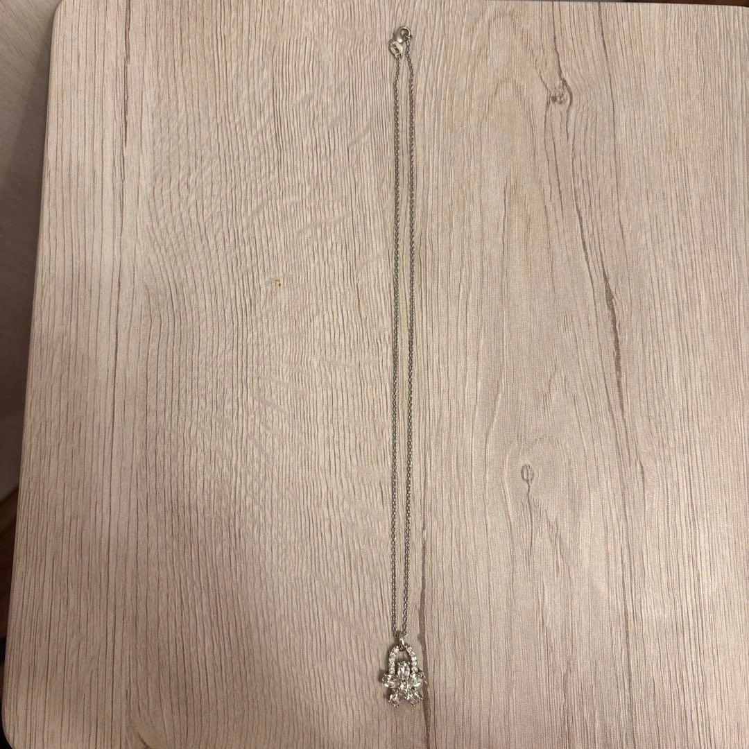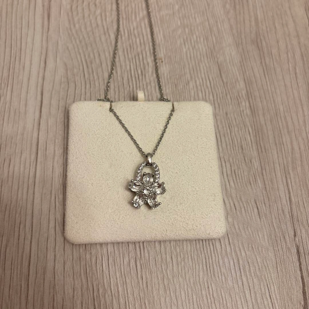 ・45cm ・2回ほど使用 ・変色なし ・本体のみの発送 10年ほど前に頂いた物で素材は不明ですが、全く変色しておりません。 石部分はおそらくジルコニア等と思われますが、高見えすると思います。 お花モチーフのシルバーネックレス、クリスタル風ストーン付きで華やか。 - デザイン: お花モチーフのペンダント - 素材: シルバー色の金属 - チェーンの長さ: ロングチェーン - 装飾: クリスタル風のストーン付き ご希望の方はお気軽にご連絡ください。