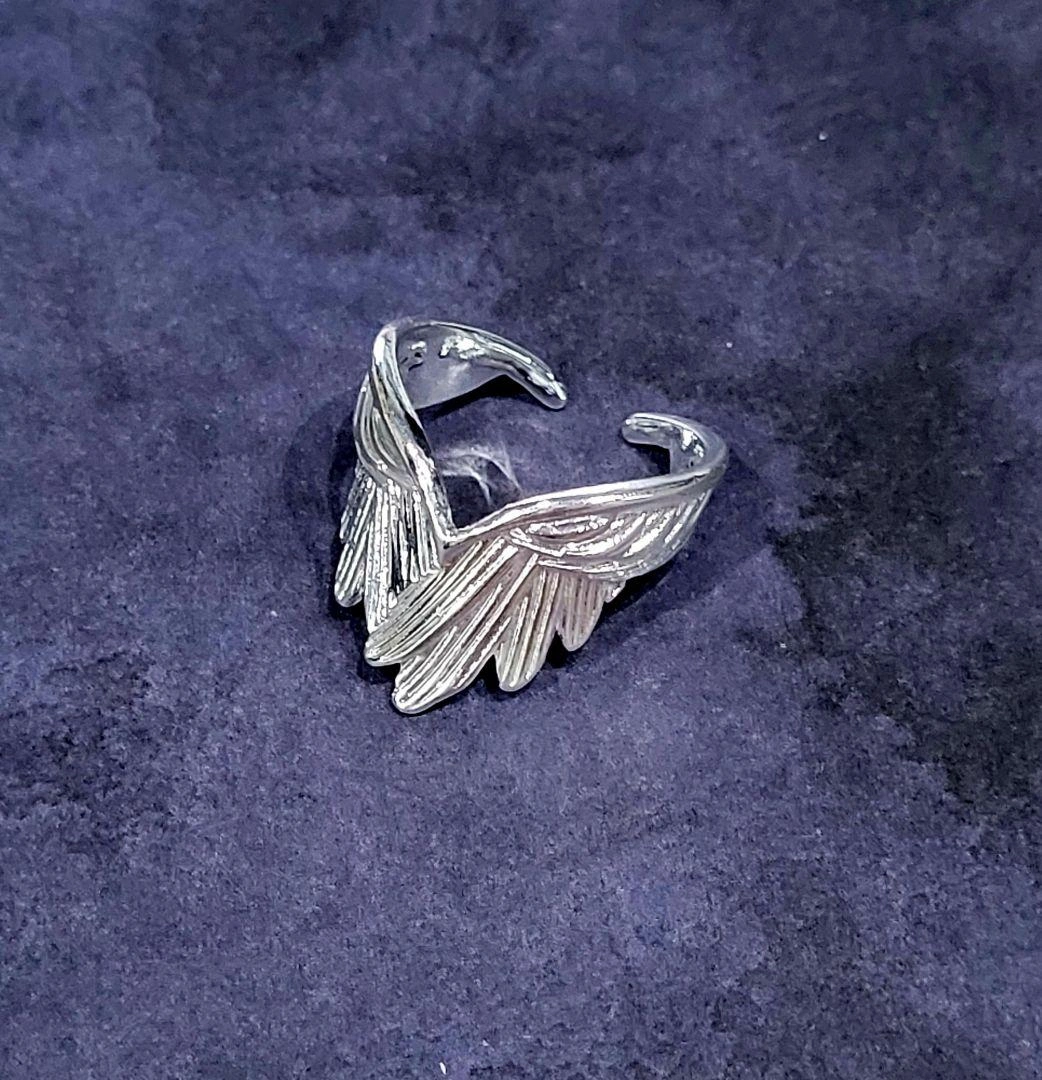 ご覧頂きありがとうございます(❁ᴗ͈ˬᴗ͈) 翼をモチーフにしたシルバー調のリングです。 存在感のあるデザインで、カジュアルにもゴシックやファンタジー系のコーデにも合わせやすいアイテムです。 ・重量:約4.8g ・直径:約2cm ・サイズ調整可能(フリーサイズ) ユニセックスで使用できるデザインなので、ペアリングやファッションアクセントにもおすすめです。 他のページにウィングデザイン のピアスもございますので よろしければぜひご一緒にm(_ _)m