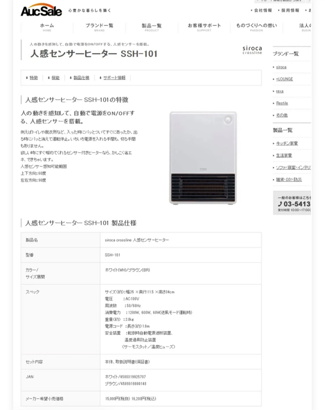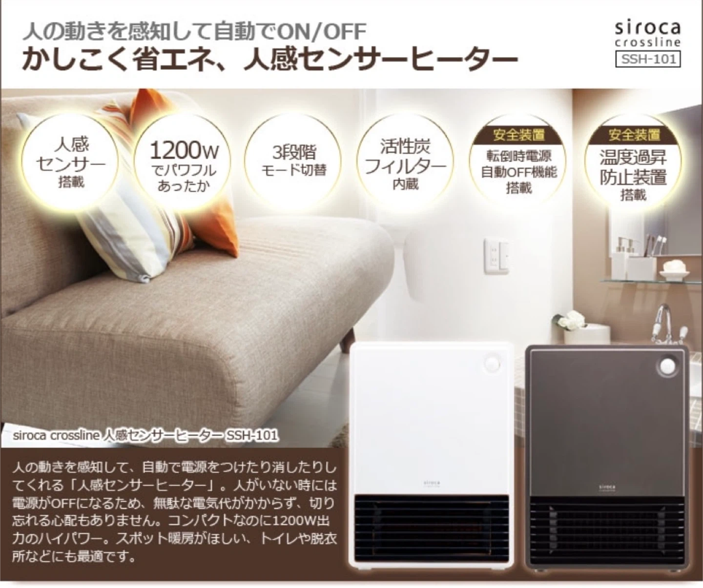 シロカの人感センサーヒーターです 新しい物を購入したので出品します。 人感センサー付、転倒防止機能付き 暖かくて重宝しました。 定価16200円(税込) 【情報】 ブランド:シロカ 型番:SSH-101 年式:2016年製 定格電圧:100V 定格周波数:50/60Hz 消費電力:600/1200W 色:ブラウン 【状態】 使用感あり 中古品であることご了承ください