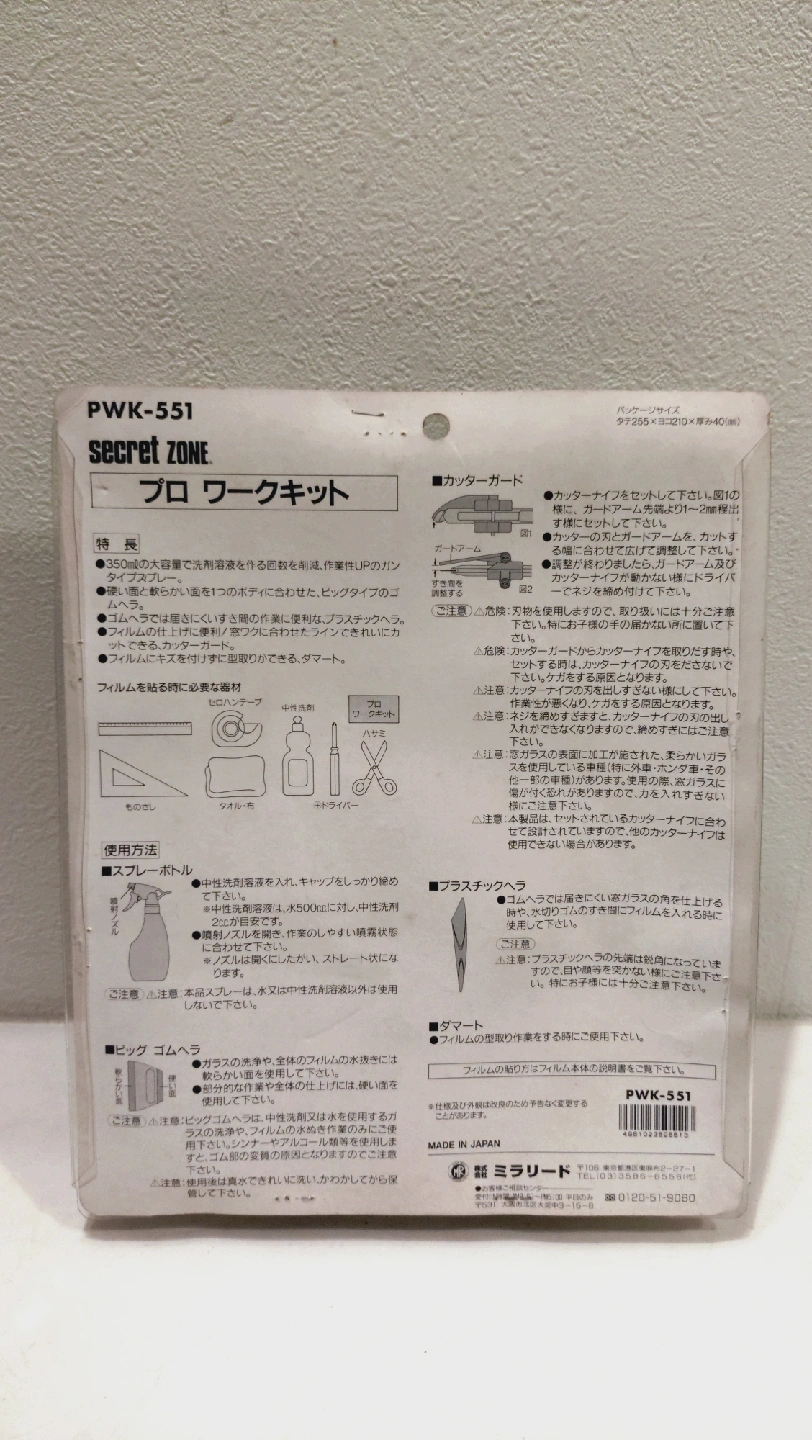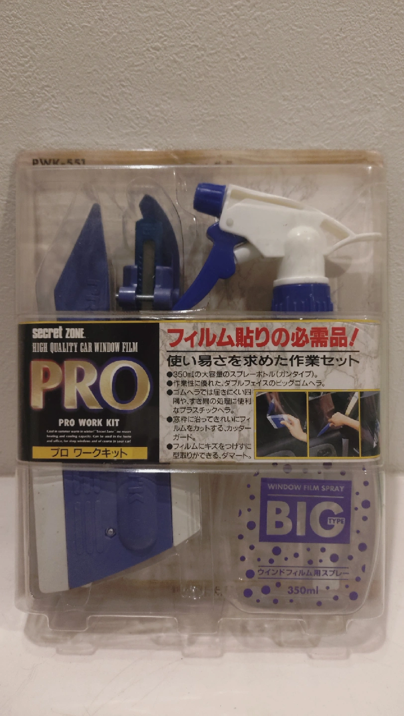 カーフィルム貼り付け用工具セットです。 【情報】 ブランド:シークレットゾーン 商品名:PRO WORK KIT 容量:350ml(スプレー) 【内容物】 ・スプレーボトル ・カッターガード ・プラスチックへラ ・ビッグゴムヘラ 未使用未開封
