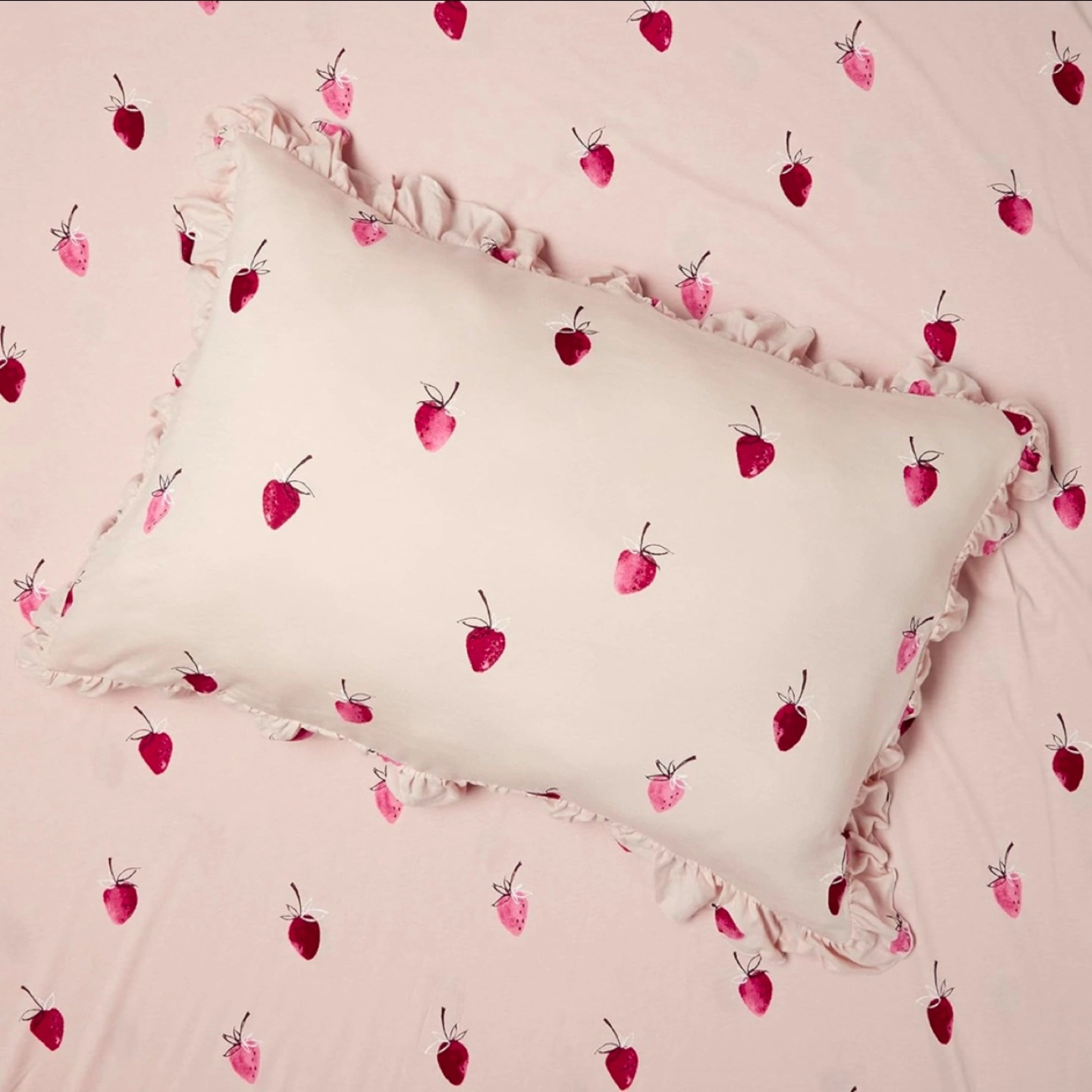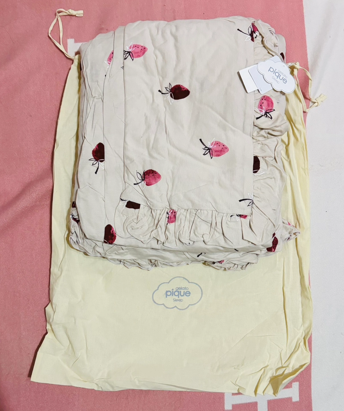 お色·BEG サイズ・ダブル 【新品・未使用・タグ付き】 セット内容:掛け布団カバー/ボックスシーツ/枕カバー こちらは4.5年前のストロベリーのカバーになります。 柔らかな水彩タッチで描いたストロベリー柄や、チェリー柄など。 布団カバーや枕カバーにはフリルがついており、ロマンティックなムードを楽しむことができる。フリルのないすっきりとしたデザインには、テディベアのぬいぐるみを描いたベアモチーフや、ソフトクリーム柄など、楽し気なデザインが揃う。