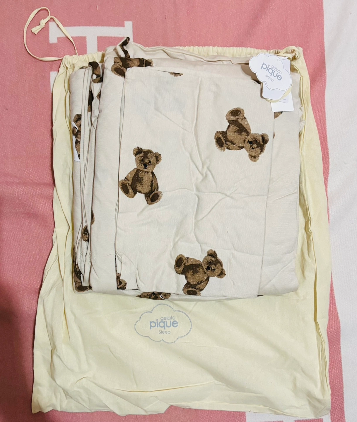 ジェラートピケ【Sleep】(ダブル)ベアモチーフ 3点 SET お色·BEG size・ダブル 【新品・未使用・タグ付き】 こちらは4.5年前のテディベアの寝具セットになります。 【ふわふわなテディベアに包まれるダブルサイズ寝具3点セット】 【Design/Styling】 「gelato pique」のふわふわモコモコのテディベアのぬいぐるみに包まれているような、優しく幸せな風合いの寝具シリーズ。ダブルサイズの掛け布団カバー、ボックスシーツ、枕カバんーの3点セットです。吸湿性に優れたコットンレーヨン素材を使 用し、柔らかくしなやかな風合いは肌が喜ぶ寝心地。