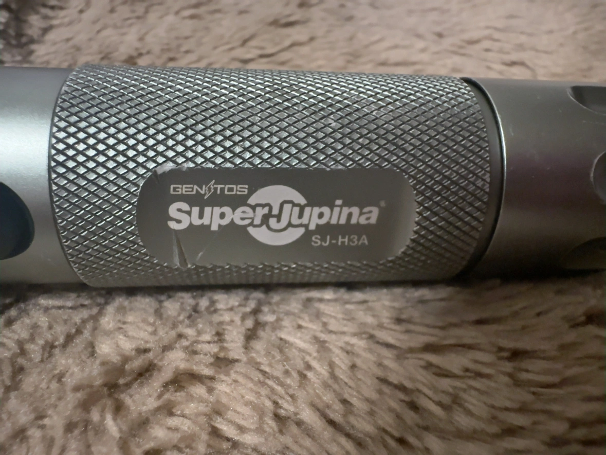 ジェントス Super Jupina (SJ-H3A)ハンディLEDライトです。 2005年発売と少し古いですが日亜製1.5WLED搭載で明るさはあります。 長い事使用せず保管していましたので埃、汚れ小傷はあります。 美品ではありません、専用ホルダ ー(ベルト通し穴有り)付属。 近隣お渡し日時や場所お気軽にお声掛けください。 他サイトにも出品しておりますので、どちらか早い方を優先させて頂きます。 仕事用、また犬の夜間散歩用などに如何でしょうか。