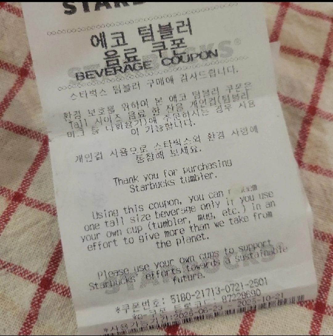 スターバックスのドリンククーポンです。 スターバックスタンブラー購入特典のドリンククーポン。自分のカップ使用時に1杯のドリンクが無料。 韓国スタバのフリードリンククーポンです。 - クーポンタイプ: ドリンククーポン - 使用条件: 自分のカップ使用時のみ有効 - 特典内容: 1杯のドリンク無料 - 有効期限: 2025.10.21 - 購入特典: スターバックスタンブラー購入時の特典 ご覧いただ きありがとうございます。 ・スターバックスのタンブラー購入特典 ・Tallサイズのドリンク1杯と交換可能 ・使用期限:2025年10月21日