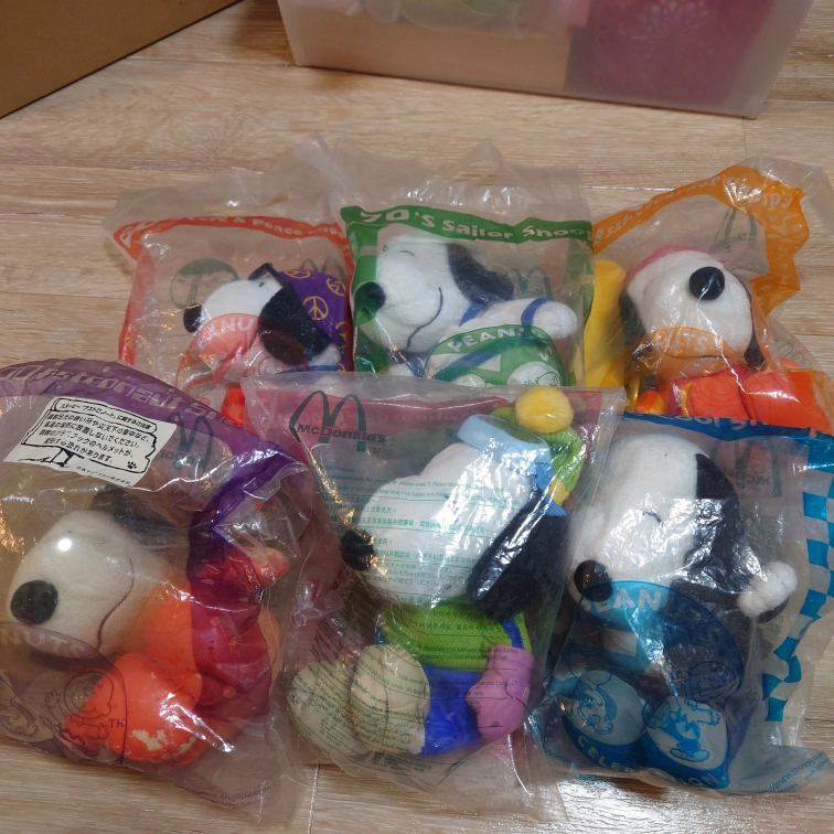 マクドナルド、ハッピーセットの50thスヌーピーぬいぐるみ、6体セットです。 袋に入れたままの保存ですが、画像2〜4にあるように、洋服の劣化があります。 他にも、気がつかないものがあ るかもしれません。 完璧を求める方や、細かいことが気になる方は、ご遠慮ください。 NC,NRでお願い致します。 他にも出品していますので、まとめて購入していただけましたら、気持ちですが、値下げさせていただきたいと思いますので、コメントお願いいたします。